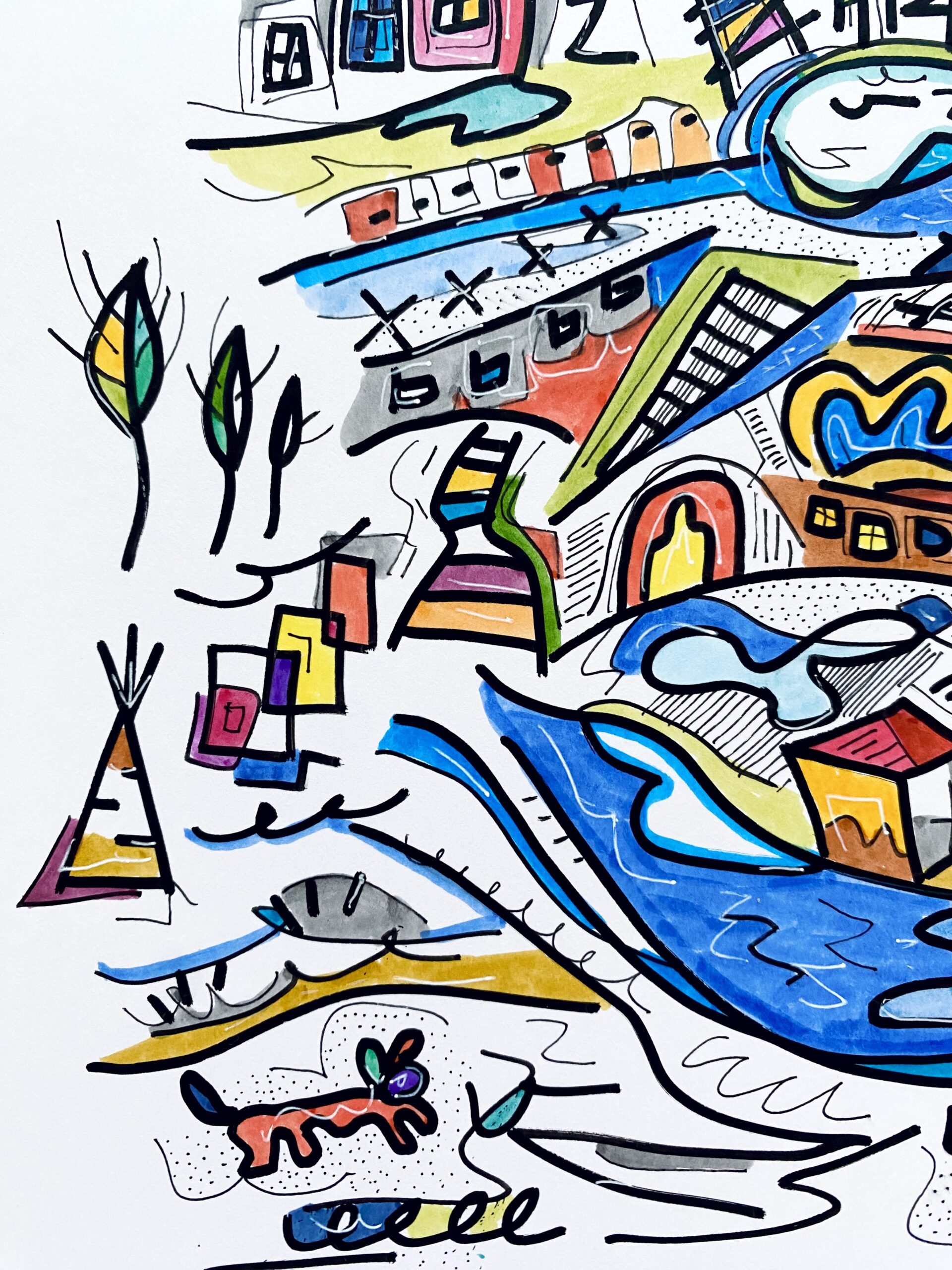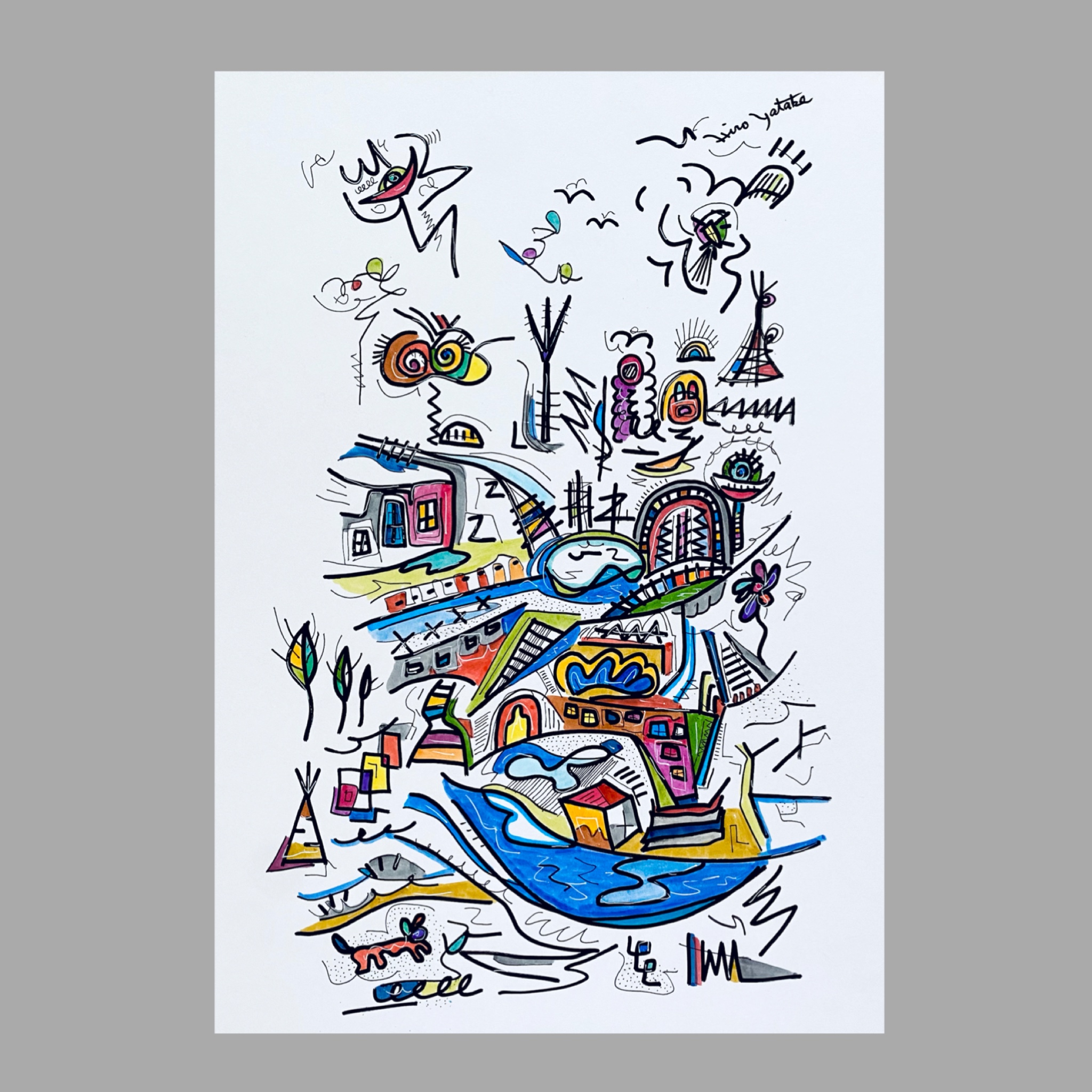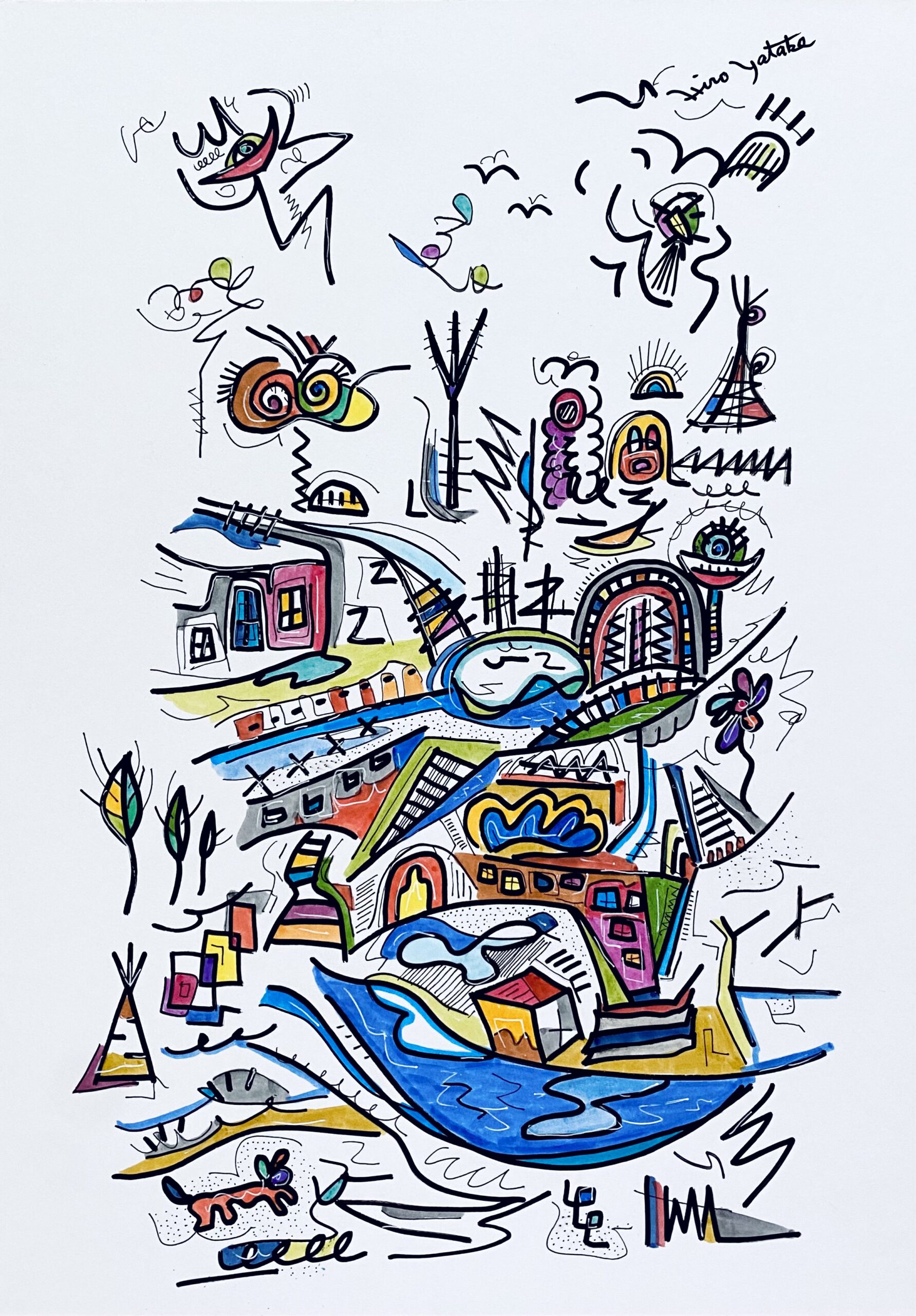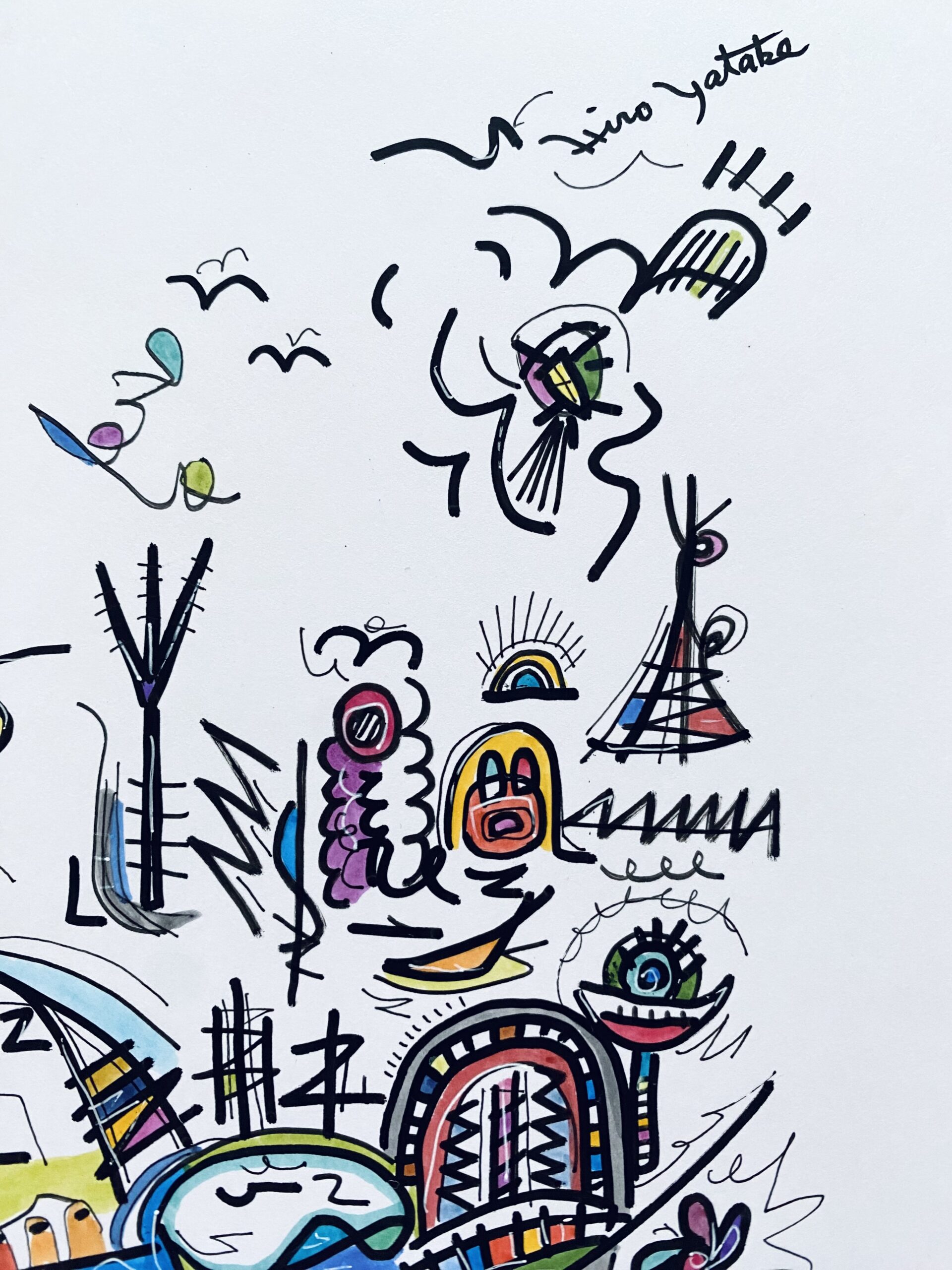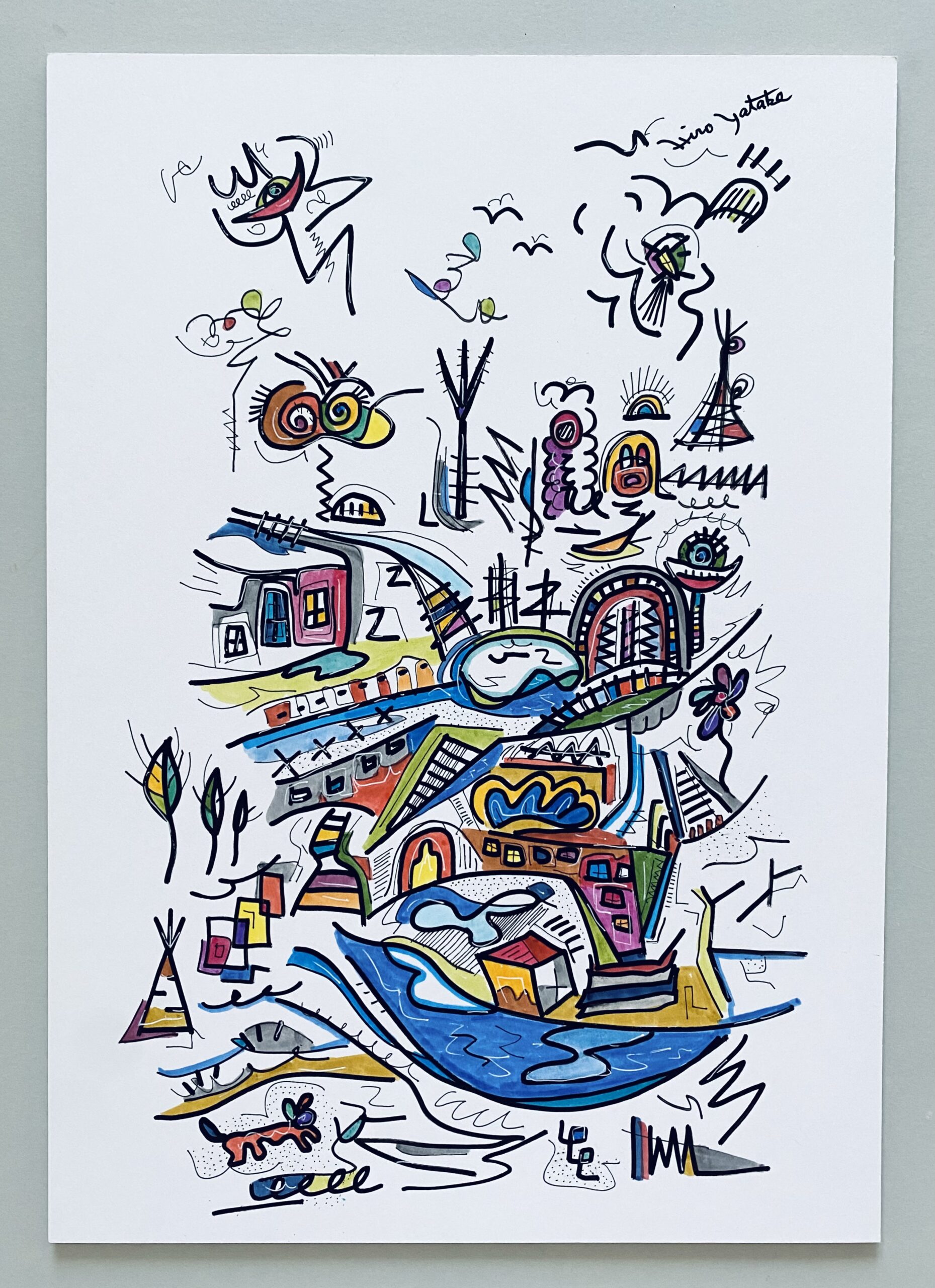 2008年 浮かんだイメージを付箋にボールペンでスケッチ。2012年になりそれをまとめたものを知人に見せたところサイズや画材をかえて絵画として発表することを勧められ、2013年、公募展にA4サイズのカードボードにペン・パステルで描いた作品を出品。その後アクリル絵具での創作をスタート。