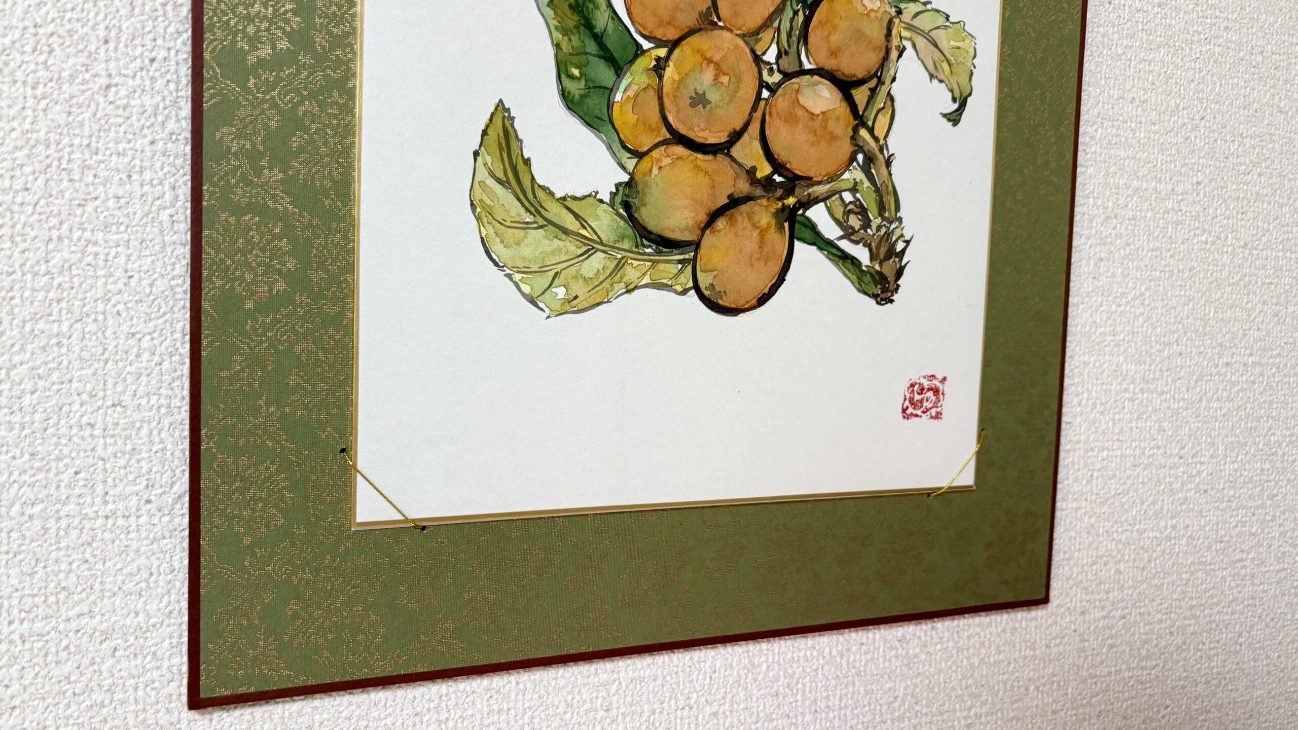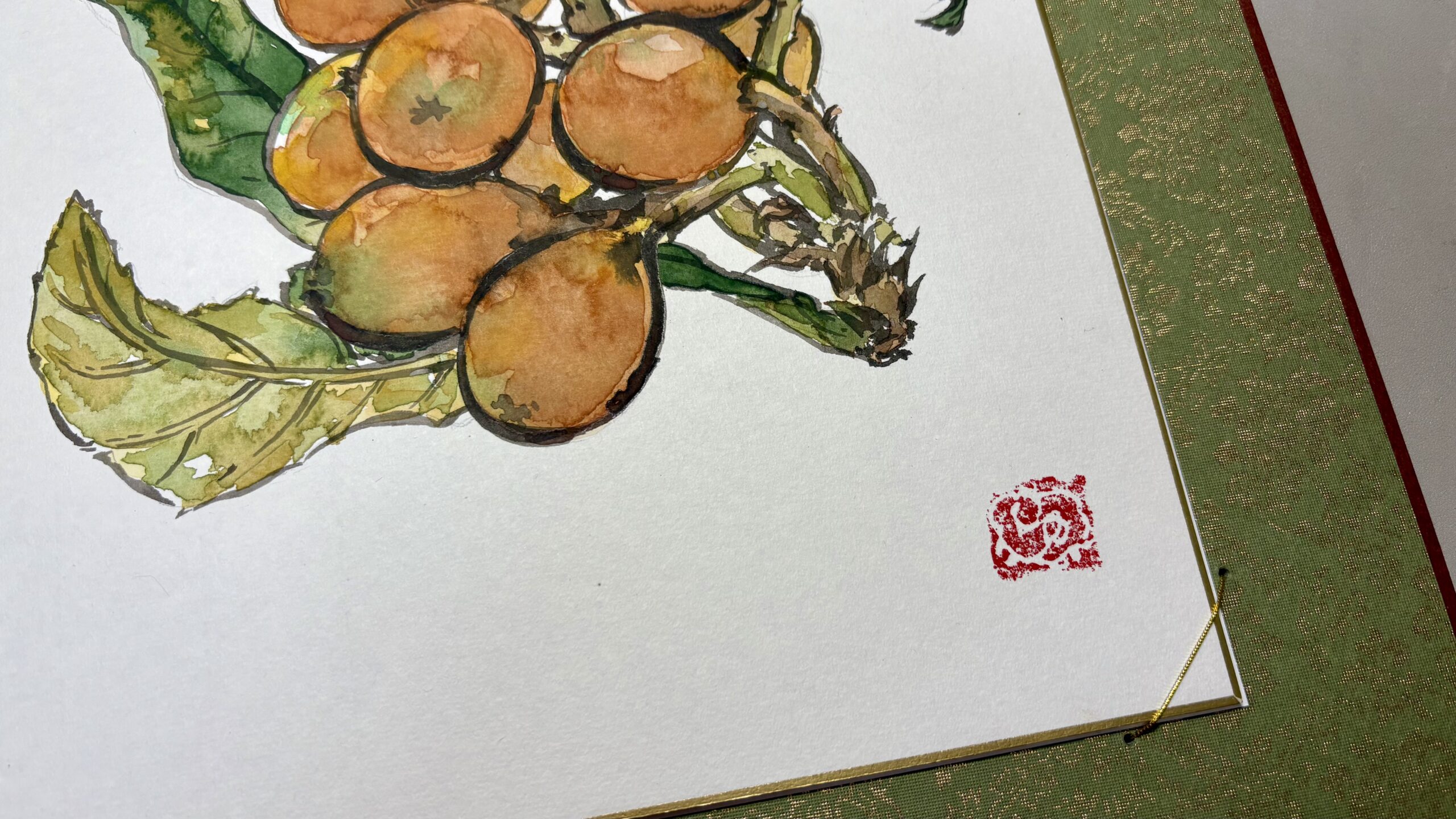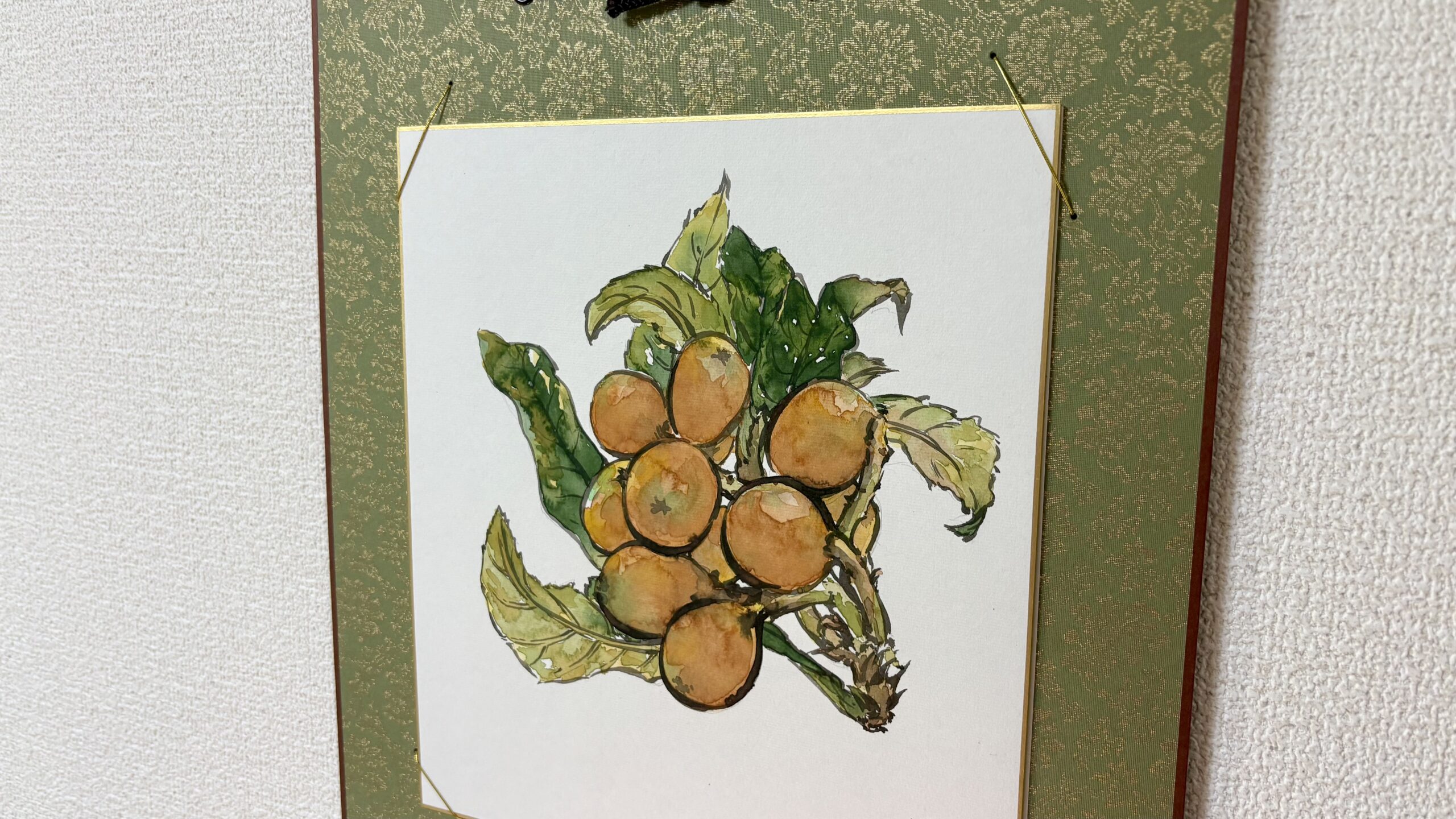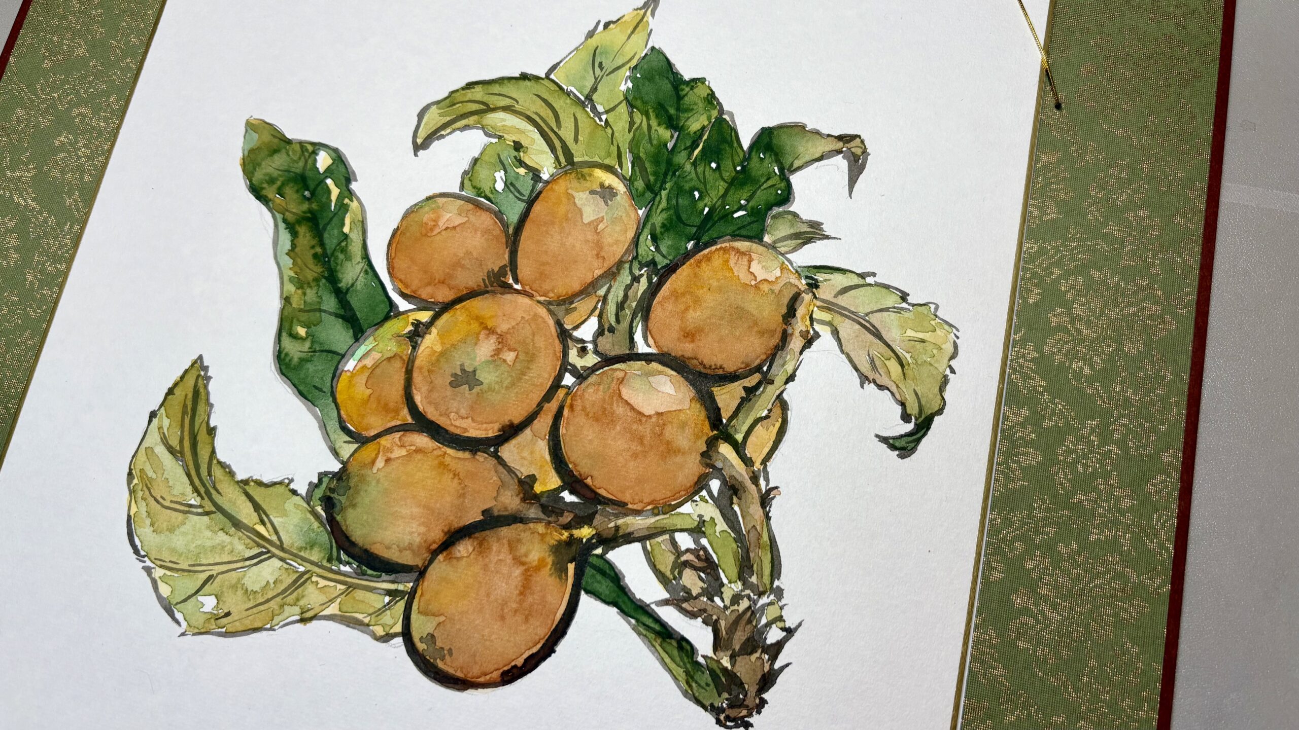 枇杷をいただいたので季節にぴったりの絵になりました。墨で骨描きし顔彩で仕上げました。