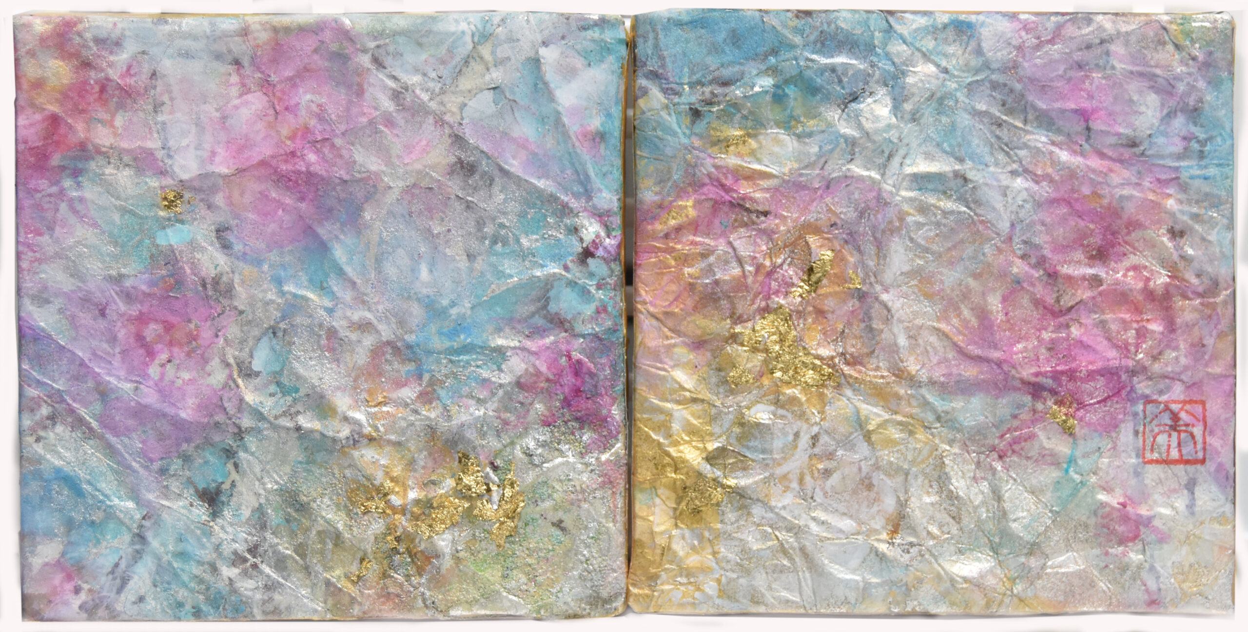 梅花の香をイメージしてみました。アルミニウム箔を貼った和紙をもんでテクスチャをつけているので見る角度によってきらめきが変わります。