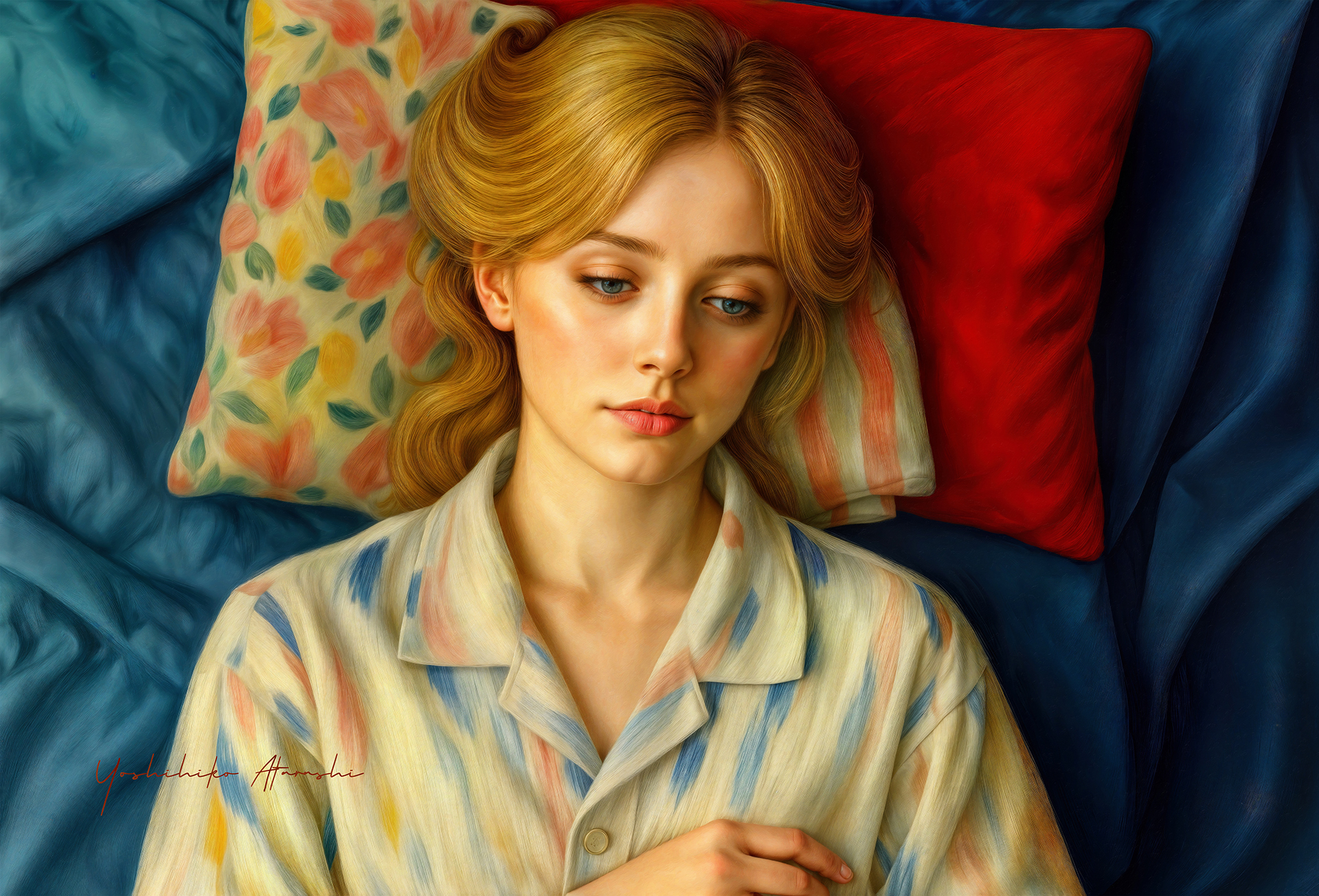 これらの作品は、眠りという人間の最も無防備で純粋な瞬間を描き出すことを通じて、内面の静けさや心の結びつきを表現しています。柔らかな筆致と繊細な色調で人物の表情や肌の質感を丁寧に描き、光と影を通じて時間の流れと感情の深さを演出しました。寝姿は、孤独の中にある優しさや共感を象徴しており、鑑賞者に静かな安心感をもたらすことを意図しています。
