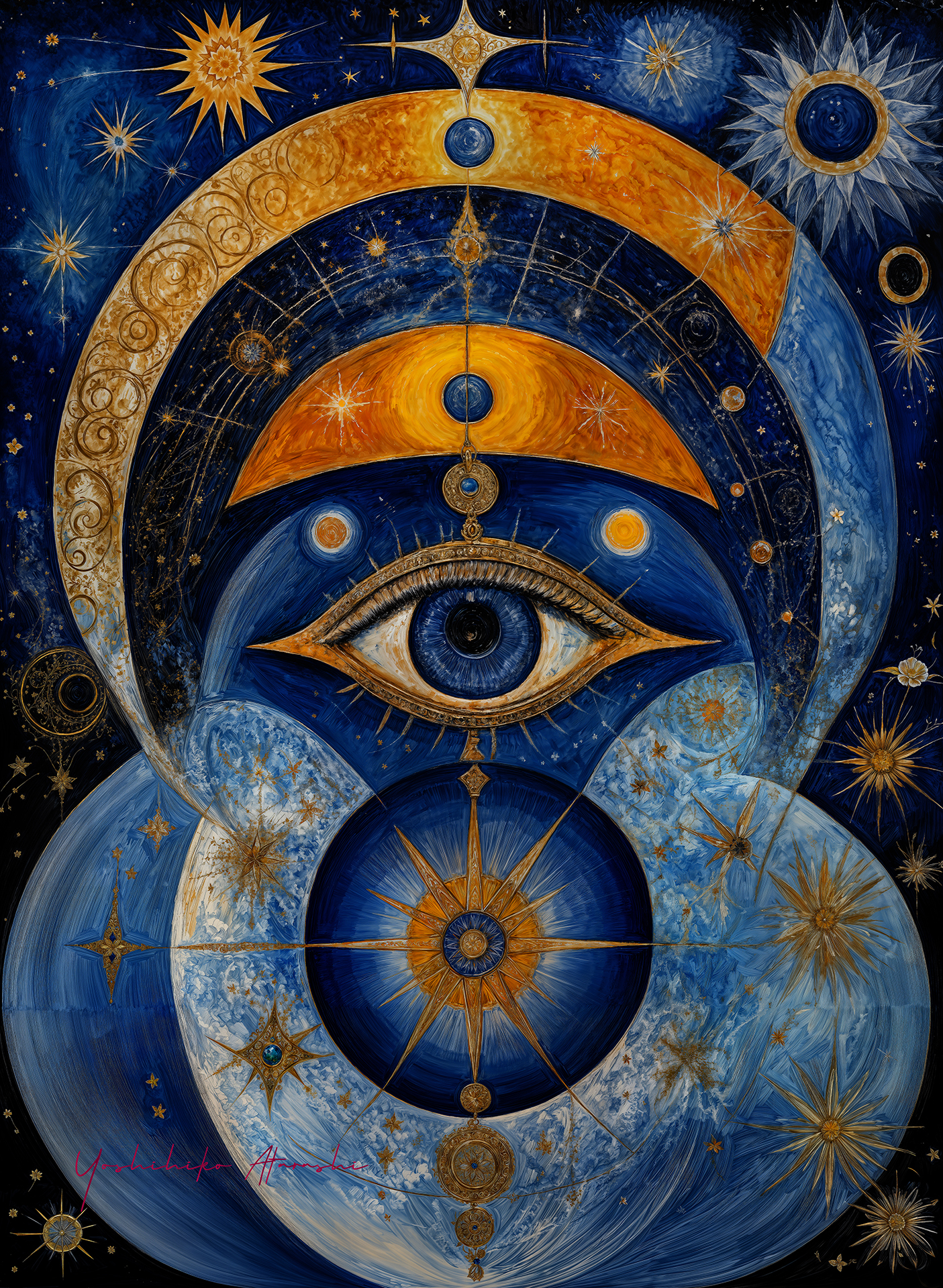この「The Cellverse」シリーズは、宇宙と細胞という極大と極小の世界の相似性をテーマに描いた作品群です。螺旋、目、星々、生命の象徴が交錯し、内的宇宙と外的宇宙のつながりを視覚化しています。画法としては、神秘的な象徴主義とサイケデリックな要素を取り入れ、緻密な筆致と鮮やかなブルーを基調とした色彩で、夢と科学、精神世界を融合させました。観る人が自分の内側の宇宙を旅する感覚を味わえるよう願いを込めて描いています。
