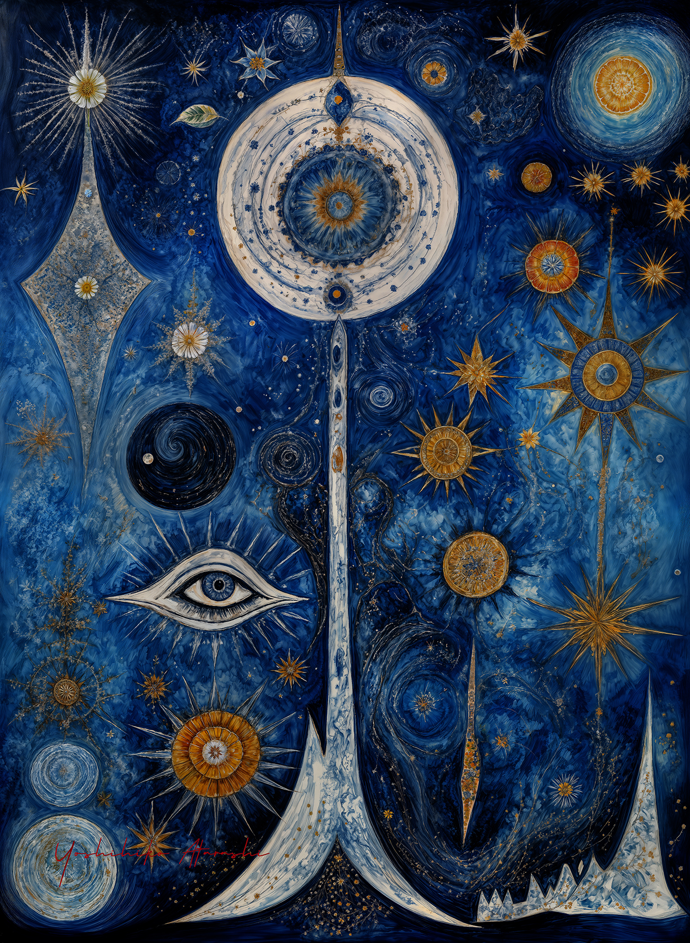 この「The Cellverse」シリーズは、宇宙と細胞という極大と極小の世界の相似性をテーマに描いた作品群です。螺旋、目、星々、生命の象徴が交錯し、内的宇宙と外的宇宙のつながりを視覚化しています。画法としては、神秘的な象徴主義とサイケデリックな要素を取り入れ、緻密な筆致と鮮やかなブルーを基調とした色彩で、夢と科学、精神世界を融合させました。観る人が自分の内側の宇宙を旅する感覚を味わえるよう願いを込めて描いています。