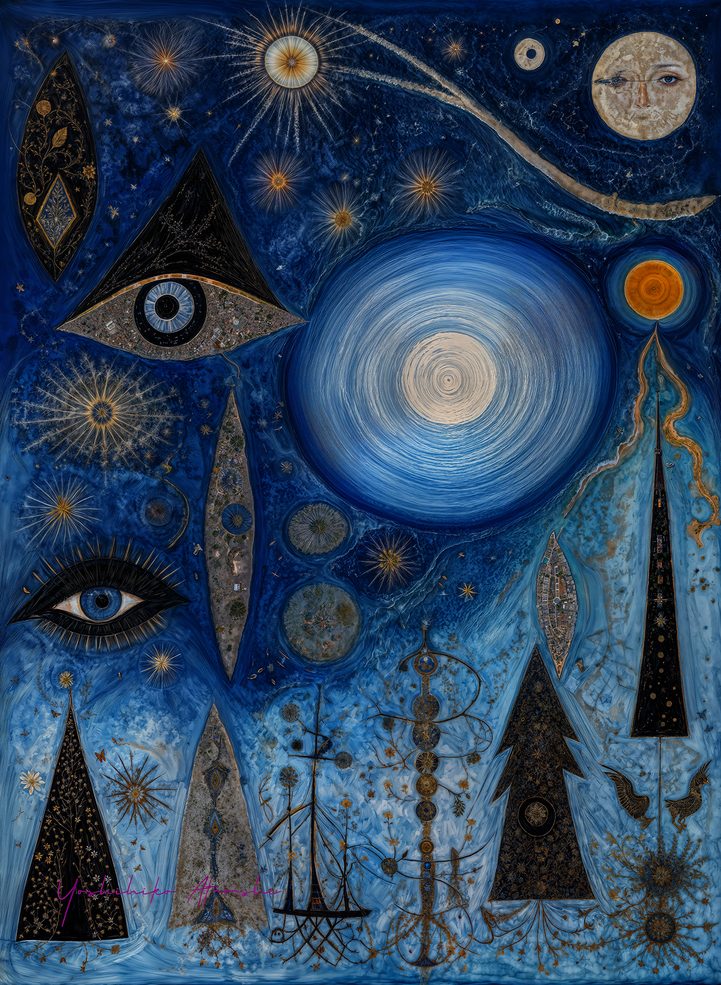この「The Cellverse」シリーズは、宇宙と細胞という極大と極小の世界の相似性をテーマに描いた作品群です。螺旋、目、星々、生命の象徴が交錯し、内的宇宙と外的宇宙のつながりを視覚化しています。画法としては、神秘的な象徴主義とサイケデリックな要素を取り入れ、緻密な筆致と鮮やかなブルーを基調とした色彩で、夢と科学、精神世界を融合させました。観る人が自分の内側の宇宙を旅する感覚を味わえるよう願いを込めて描いています。