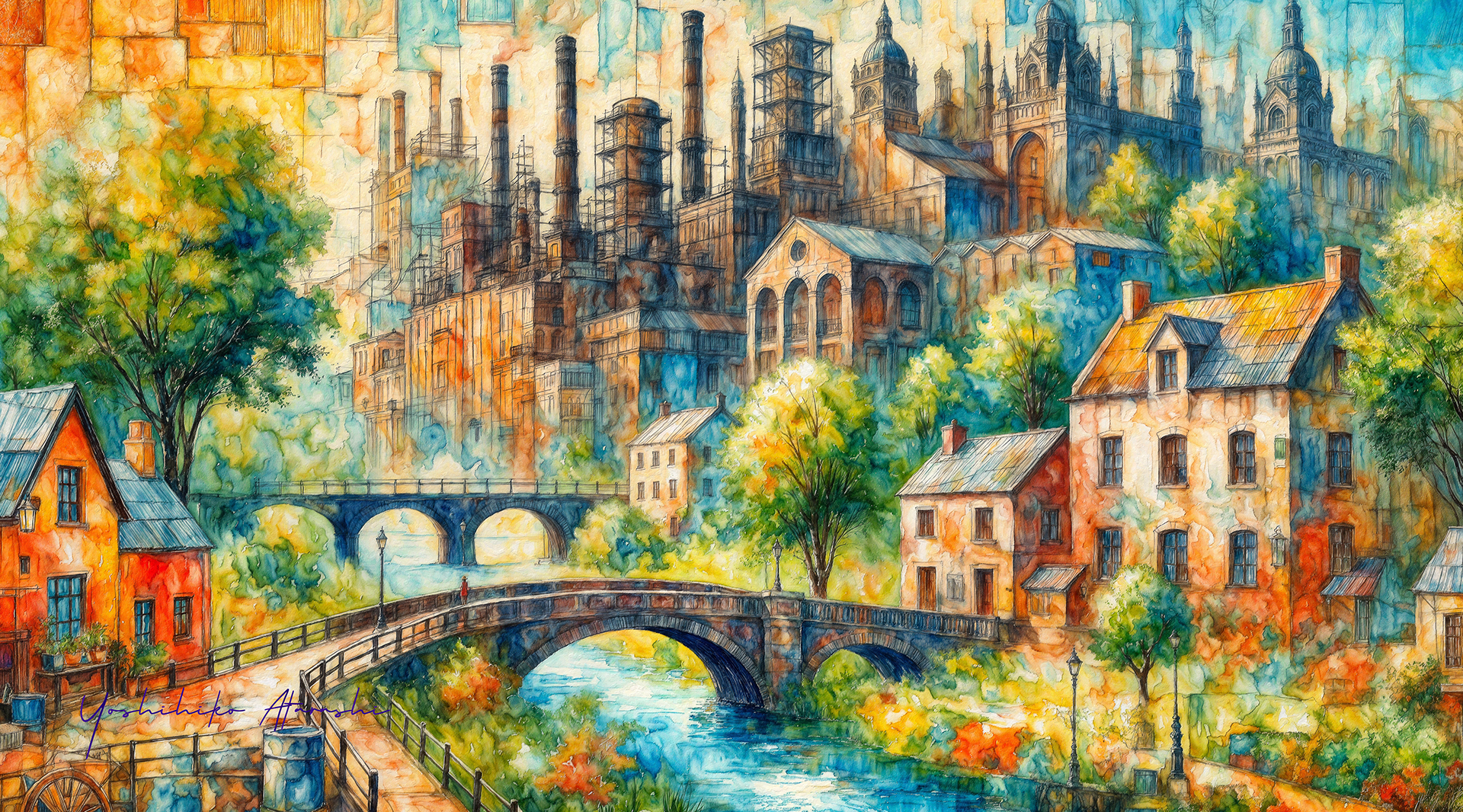 これらの作品は、記憶の中にある理想都市や心象風景を再構築した架空の街並みです。温かみのある色彩と柔らかな筆致で、過去と未来、現実と幻想が交差する都市の姿を描きました。教会、橋、川といったモチーフは、人と自然、文明の調和を象徴しています。鑑賞者の心に懐かしさと安らぎを届けたいという想いを込めて制作しました。
