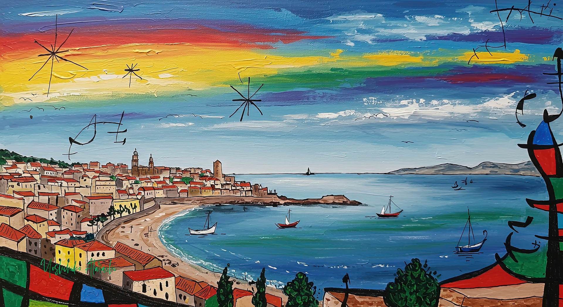 この「Rhythmic landscape」シリーズは、赤・緑・黄・青・黒の図形によって風景にリズムを与え、都市と自然の調和を音楽のように表現した作品群です。幾何学的な形と色彩のリズムが、海や空、街並みに生命感をもたらし、眺める人の感情に働きかけます。現実の風景を抽象の視点で再構成し、日常の中にあるエネルギーと詩情を引き出すことを意図しました。