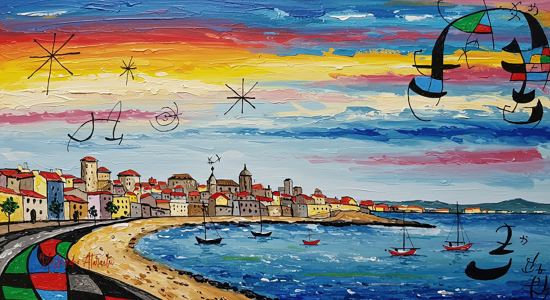 本シリーズ「Rhythmic landscape」は、海の見える町の 風景に赤・緑・黄・青・黒の図形をリズムのように織り交ぜ、心地よい躍動感を生み出した注目作です。風景と抽象の融合が独特の世界観を構築し、観る人の想像力を刺激します。明るい照明と広めの壁面が映えます。空間にエネルギーと詩的な印象を与える現代アートとして、住宅・店舗・ホテルロビーなどに最適です。