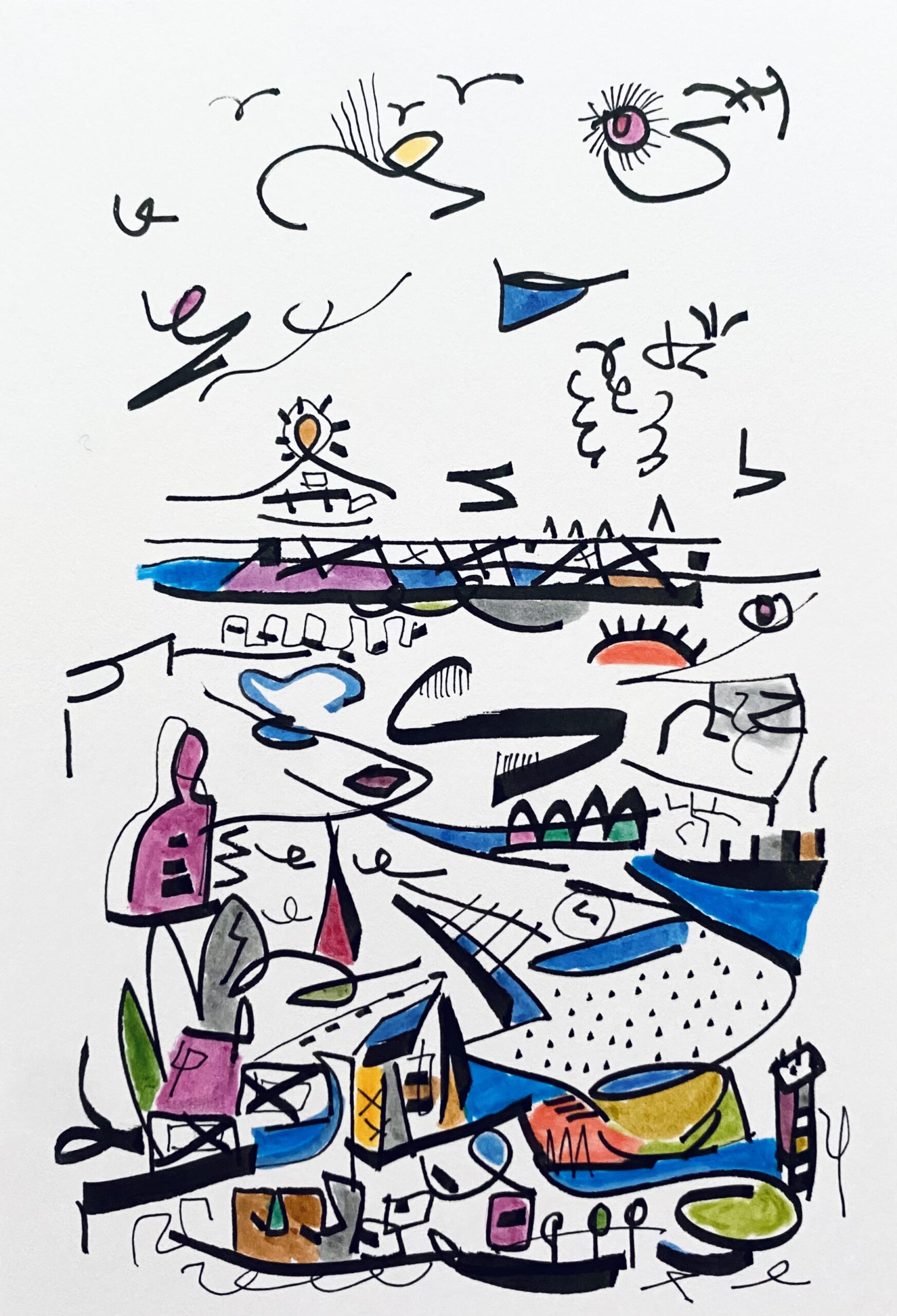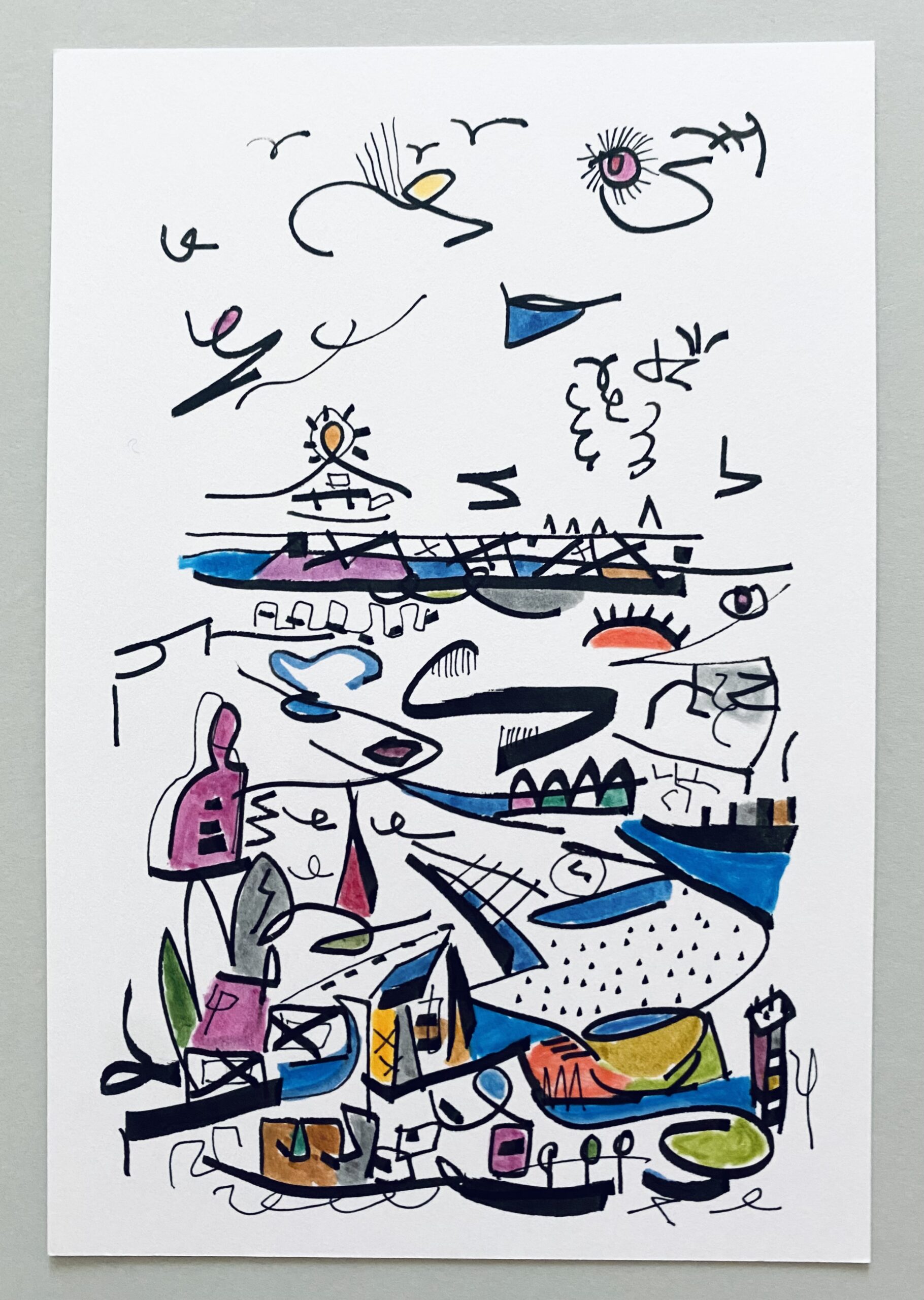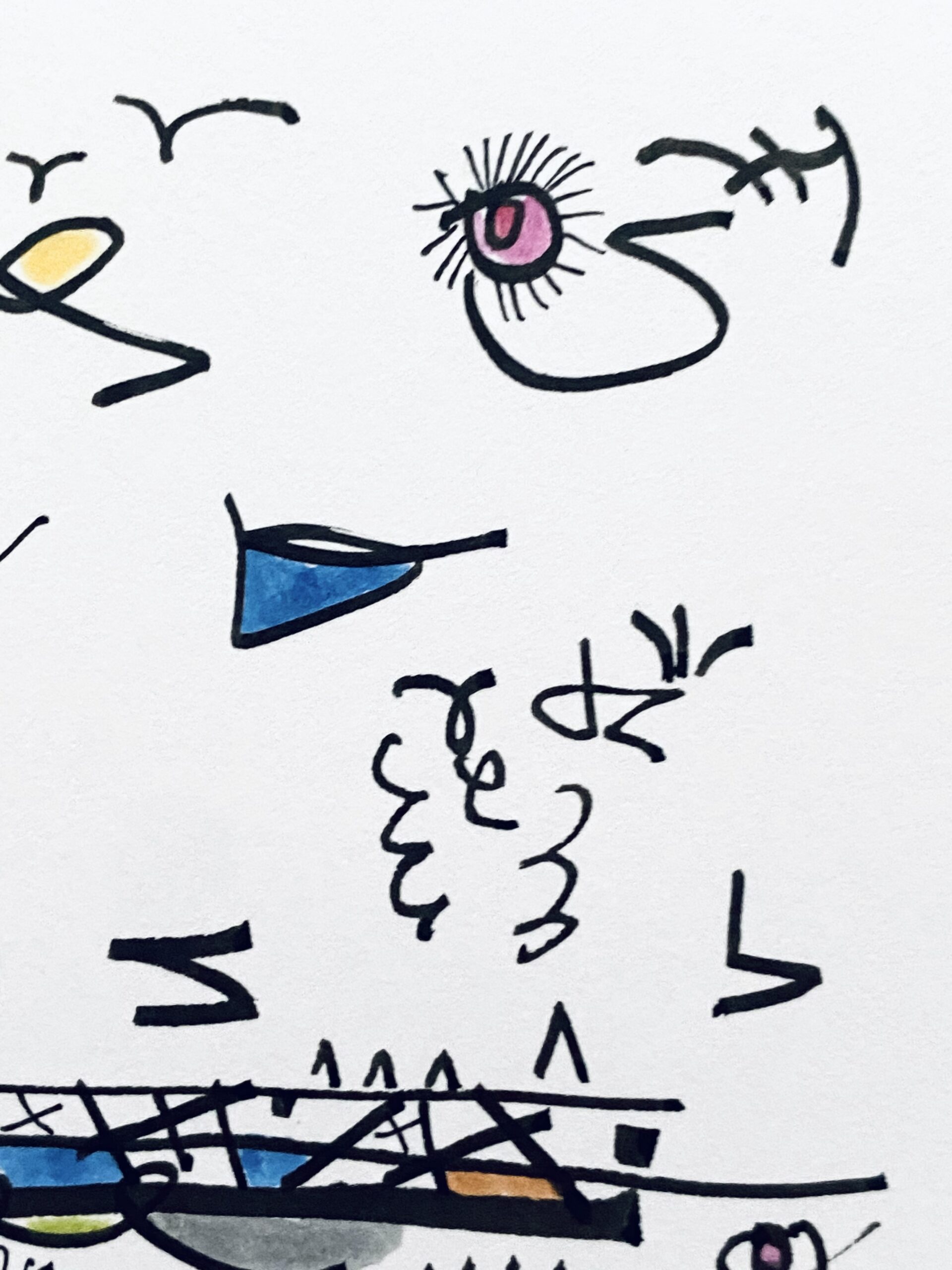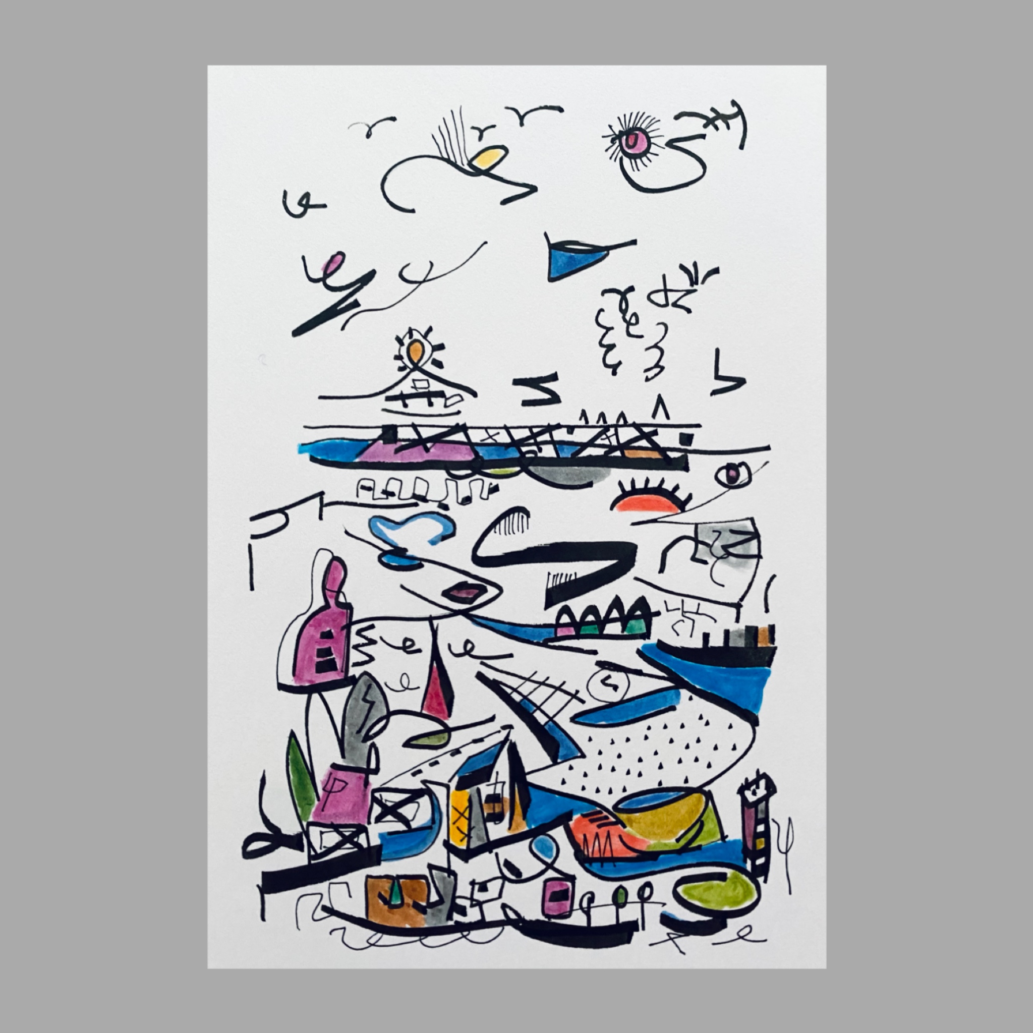 2008年 浮かんだイメージを付箋にボールペンでスケッチ。2012年になりそれをまとめたものを知人に見せたところサイズや画材をかえて絵画として発表することを勧められ、2013年、公募展にA4サイズのカードボードにペン・パステルで描いた作品を出品。その後アクリル絵具での創作をスタート。