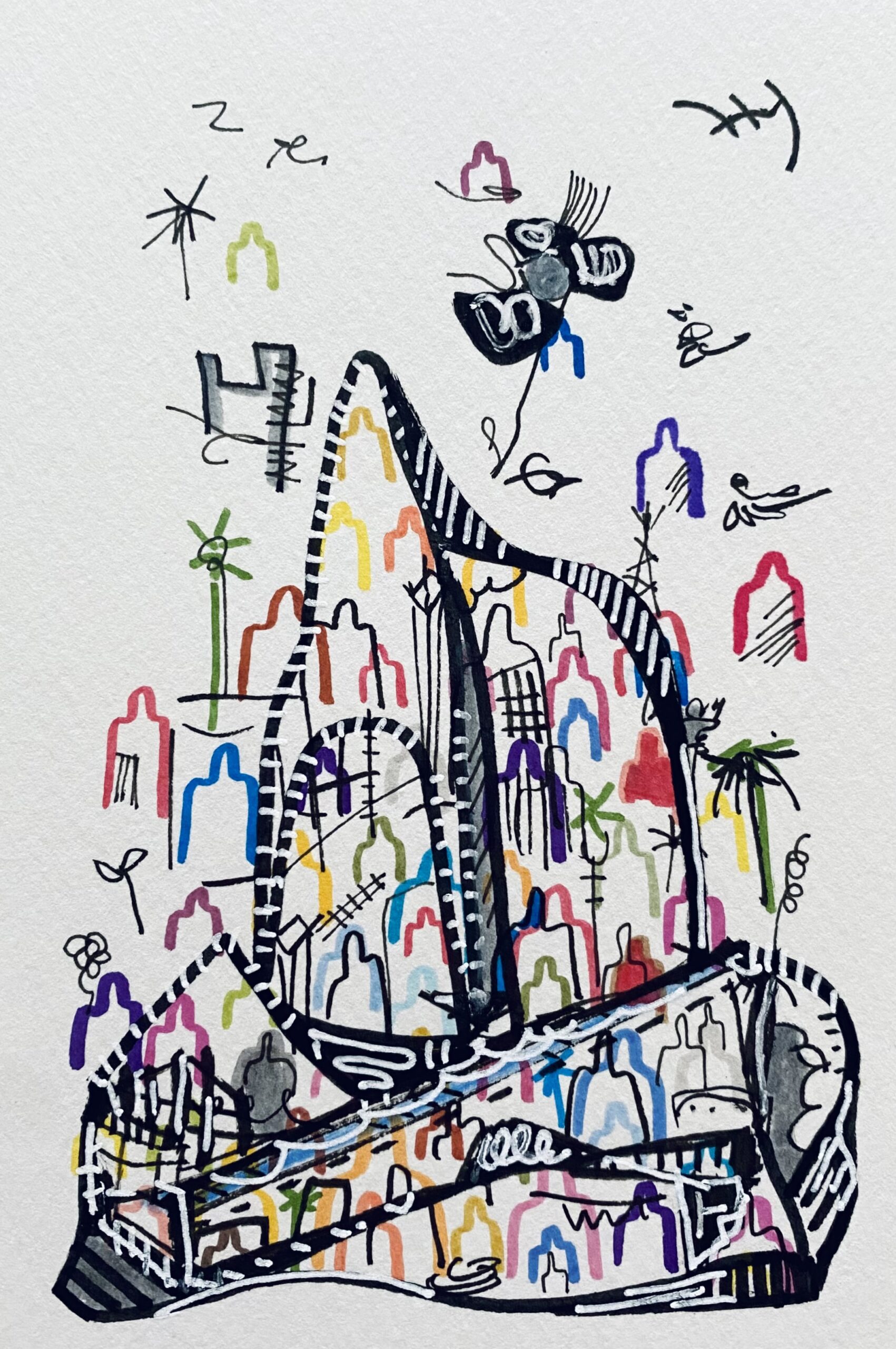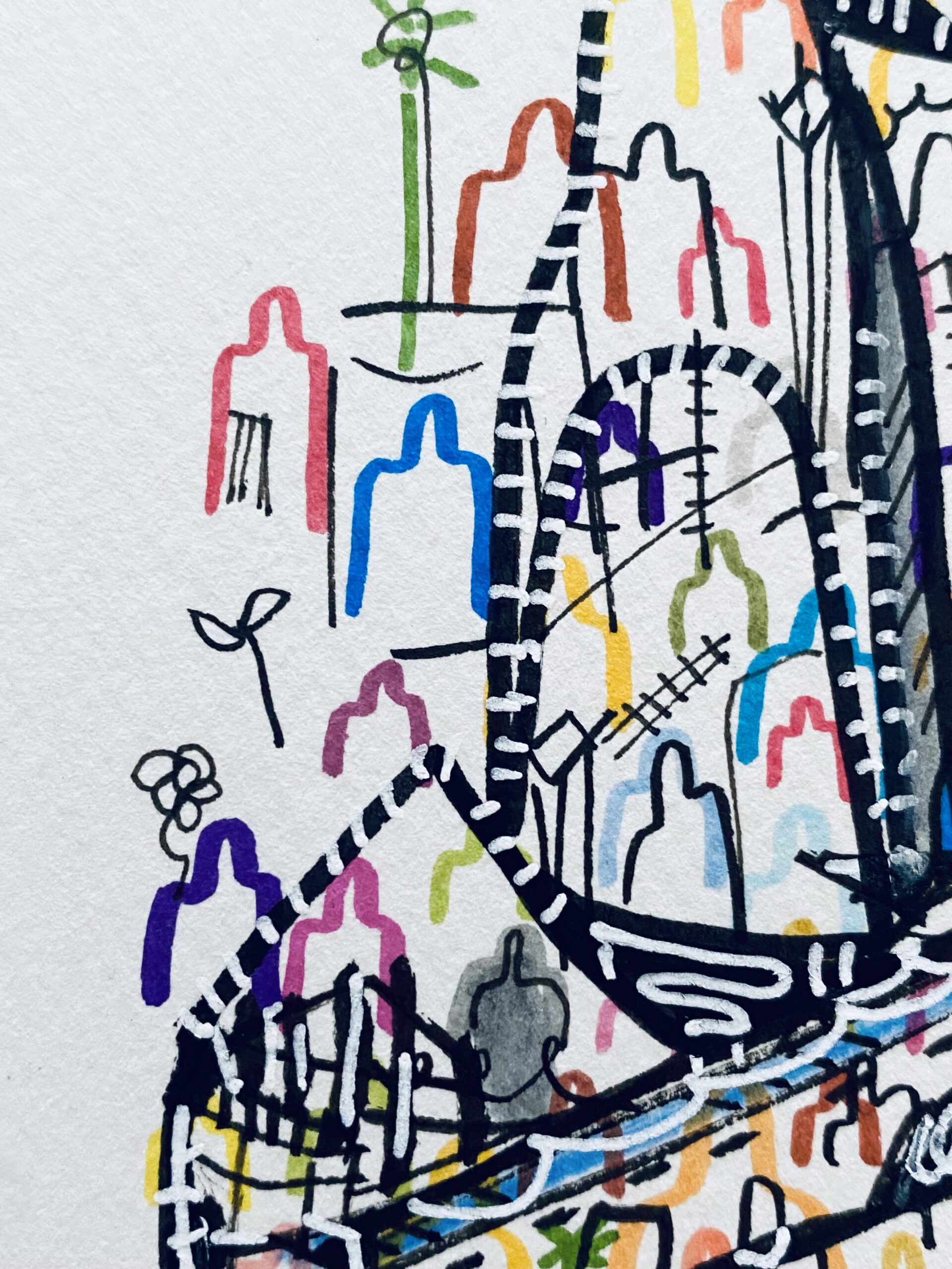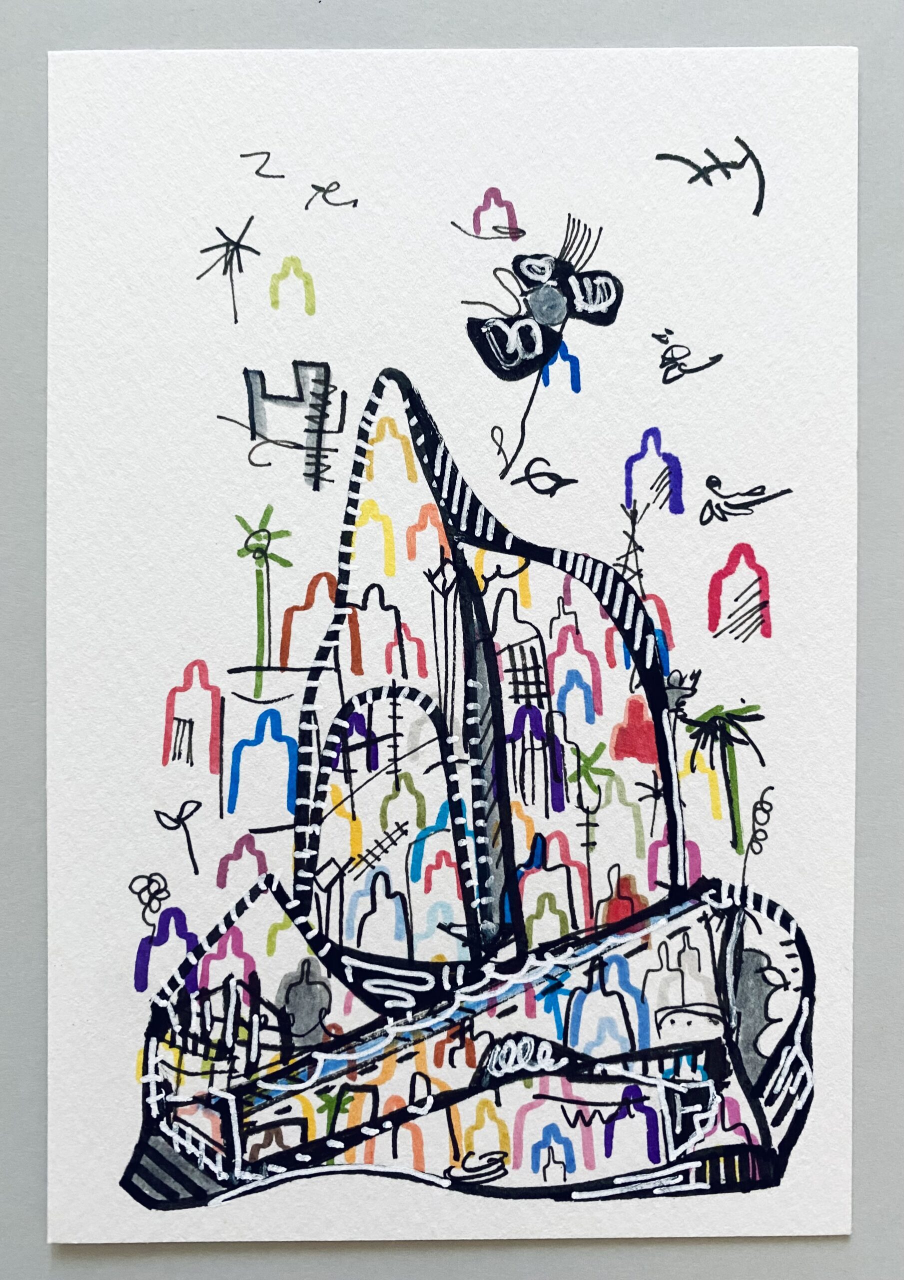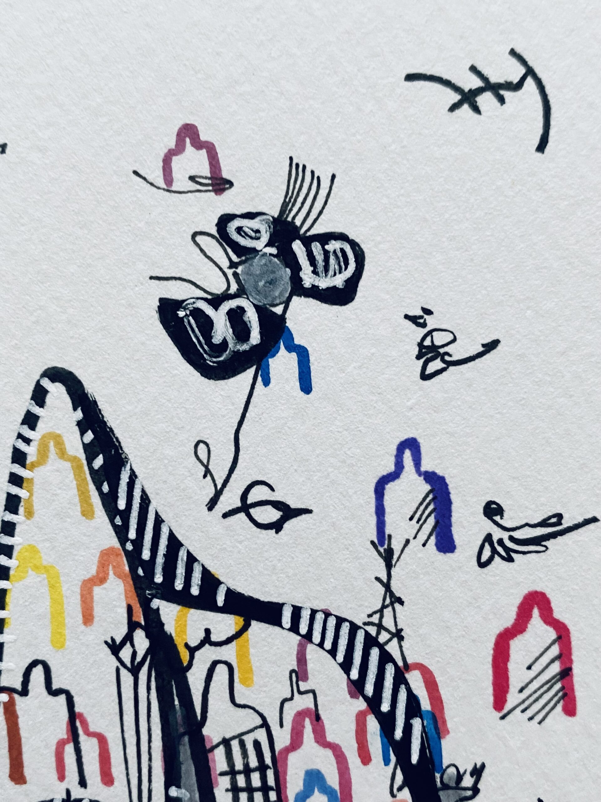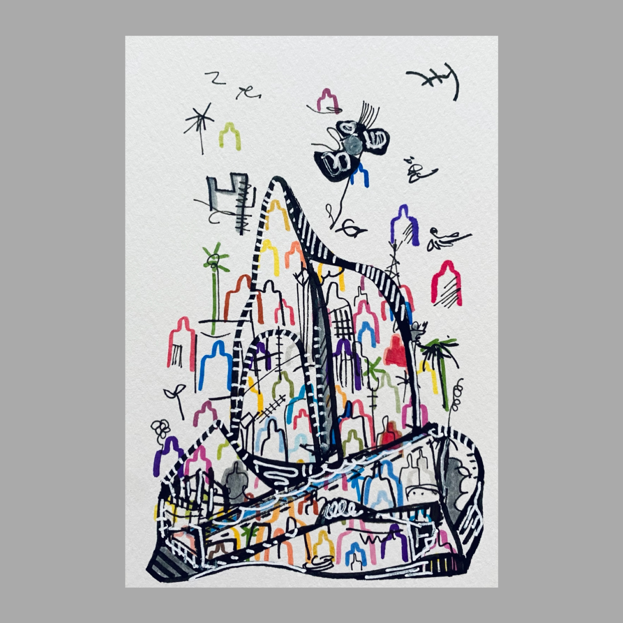 2008年 浮かんだイメージを付箋にボールペンでスケッチ。2012年になりそれをまとめたものを知人に見せたところサイズや画材をかえて絵画として発表することを勧められ、2013年、公募展にA4サイズのカードボードにペン・パステルで描いた作品を出品。その後アクリル絵具での創作をスタート。