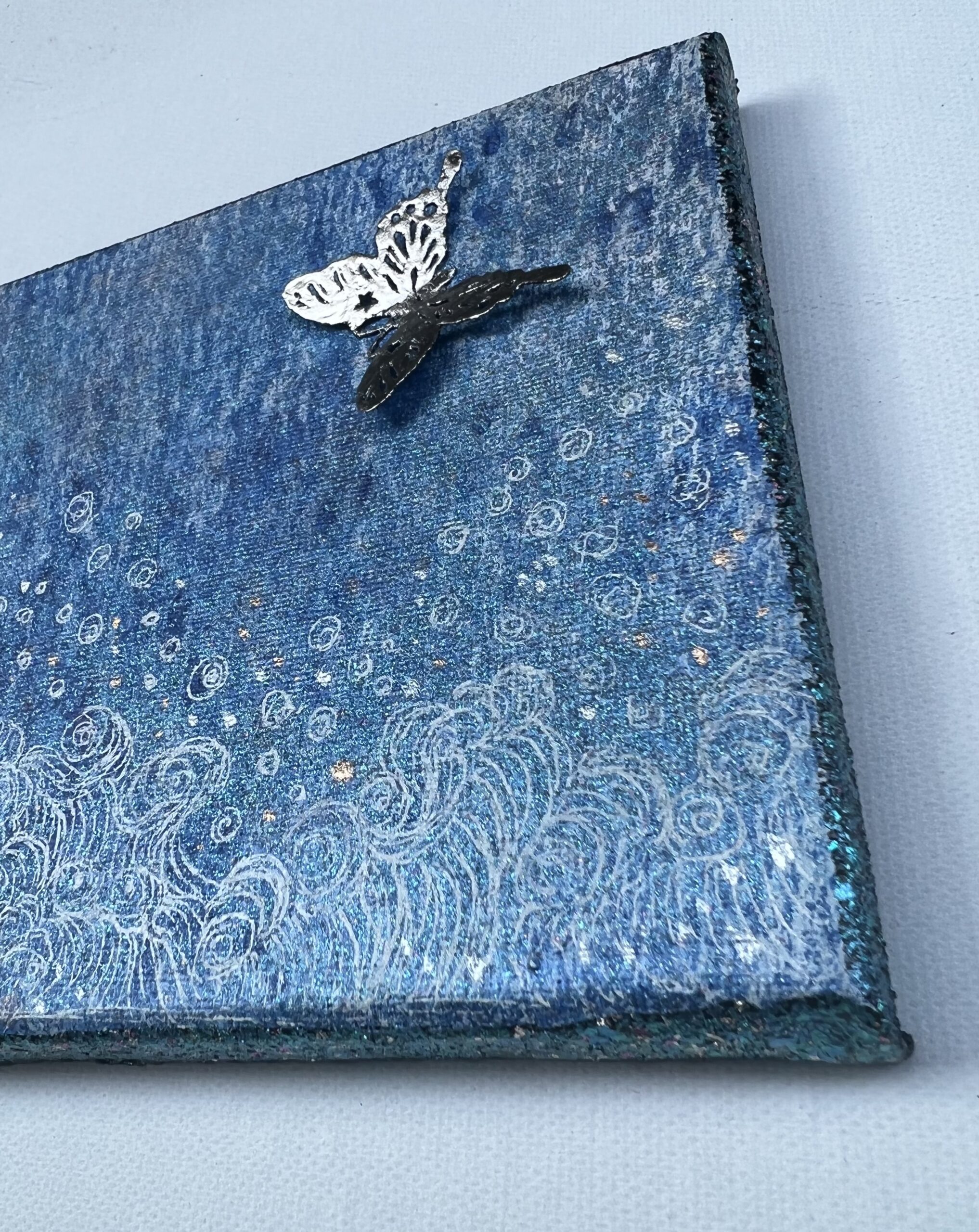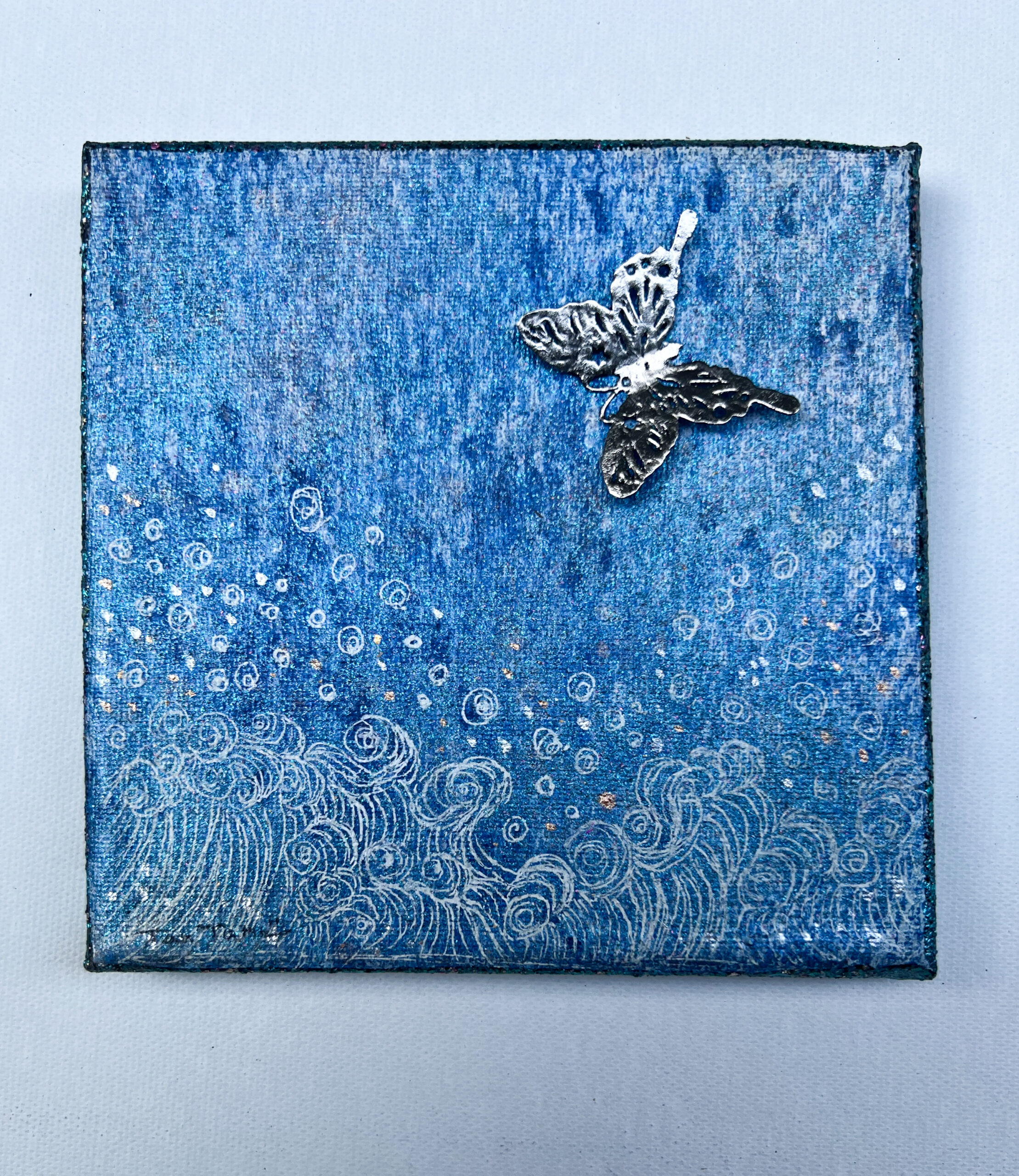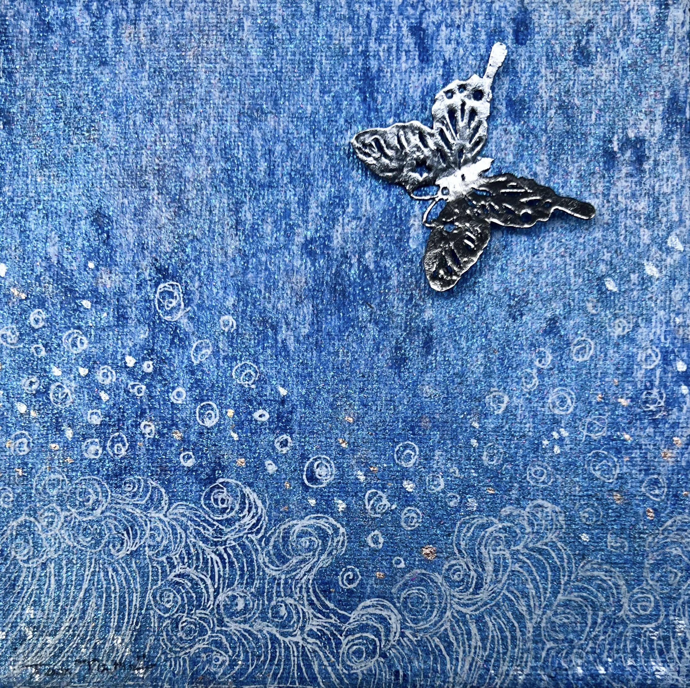 キリスト教では復活や魂の昇華を、仏教では無常と悟りの旅を、道教では自然との調和を表す蝶は、多くの宗教で変容、魂の不滅、再生、自由、美を象徴し、その尊さと神秘性に魅了されます。 サナギから蝶への変化は、物質を超えた霊的成長を示し、儚く美しい姿は神聖な希望を呼び起こし、宗教や文化を越え、魂の永遠性と変化を感じることができます。 この作品には、荒波の中、何度も何度も変化を繰り返し、なお優美に舞う蝶のように、軽やかに生命をまっとうしたい、という願いがこめられています。