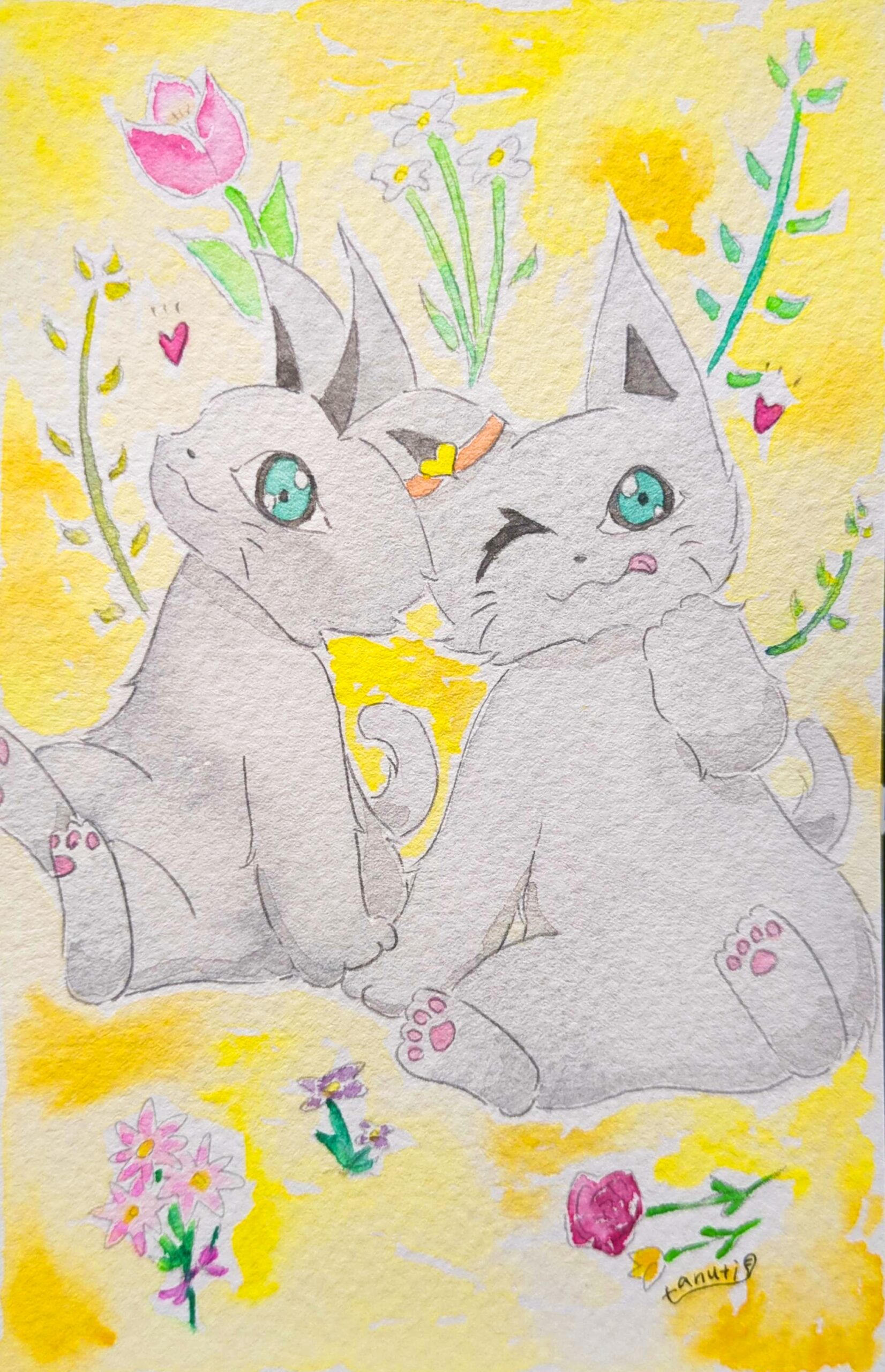 猫のミルクとくるみとお花のイラストです!