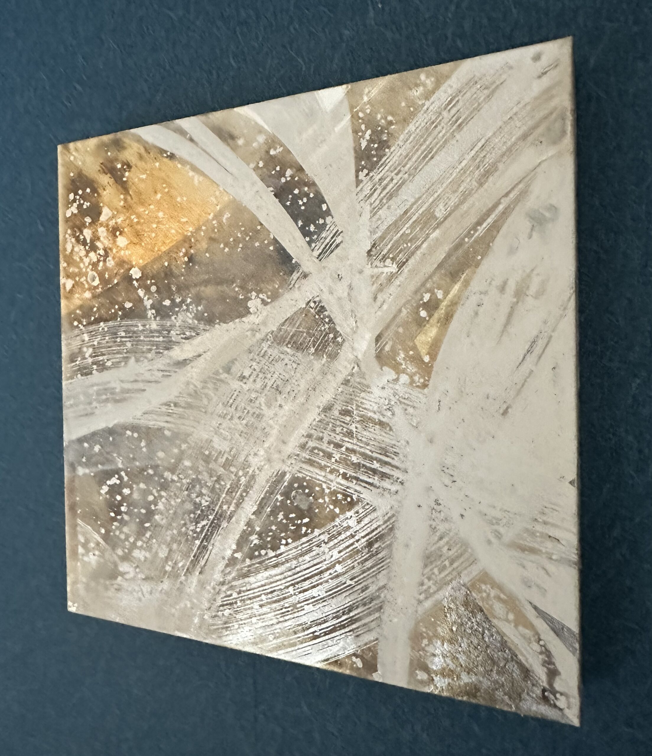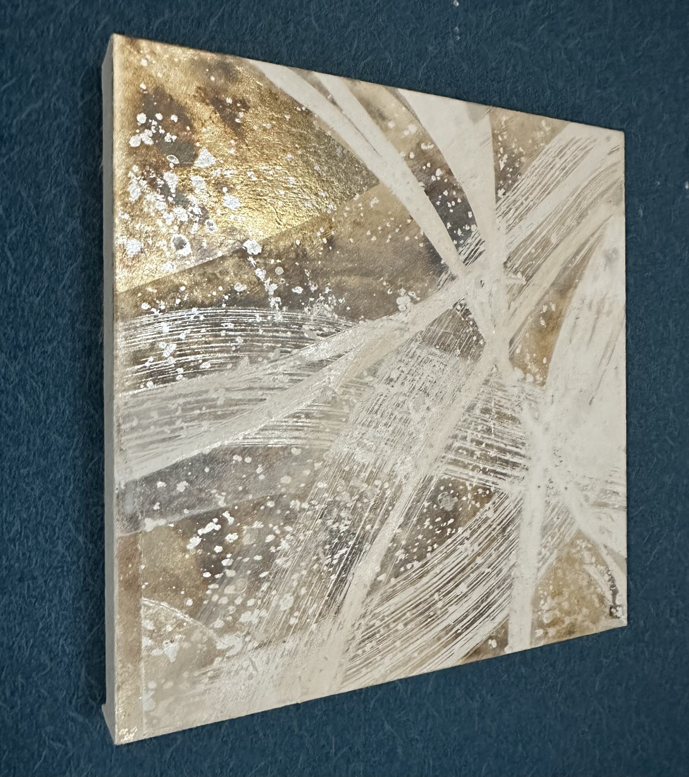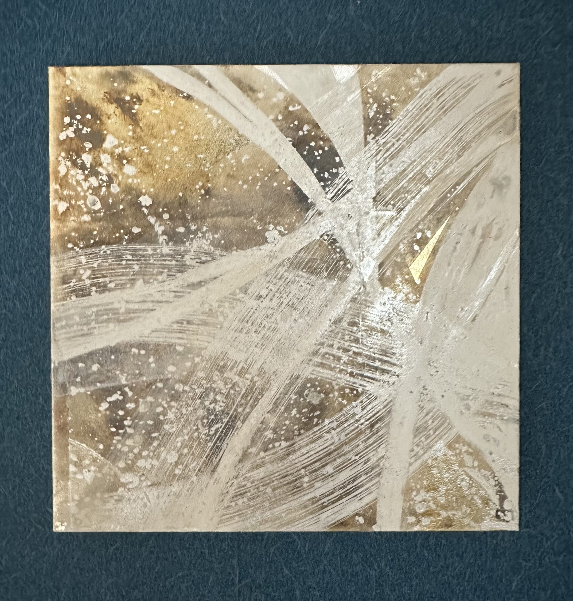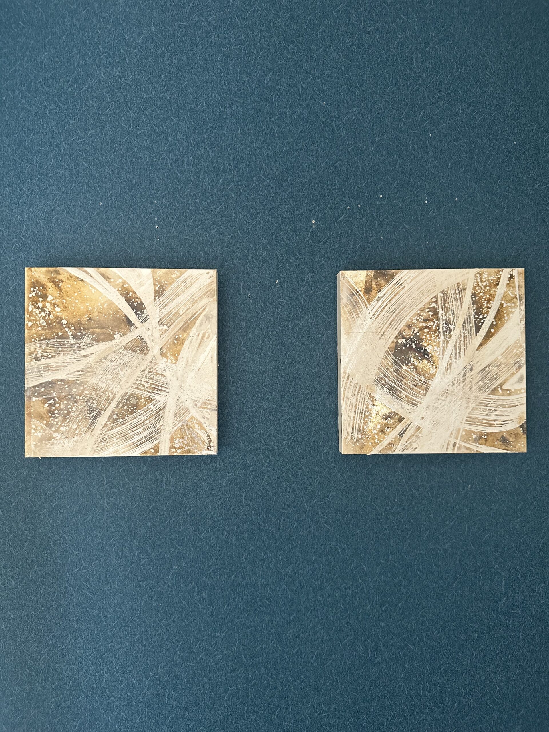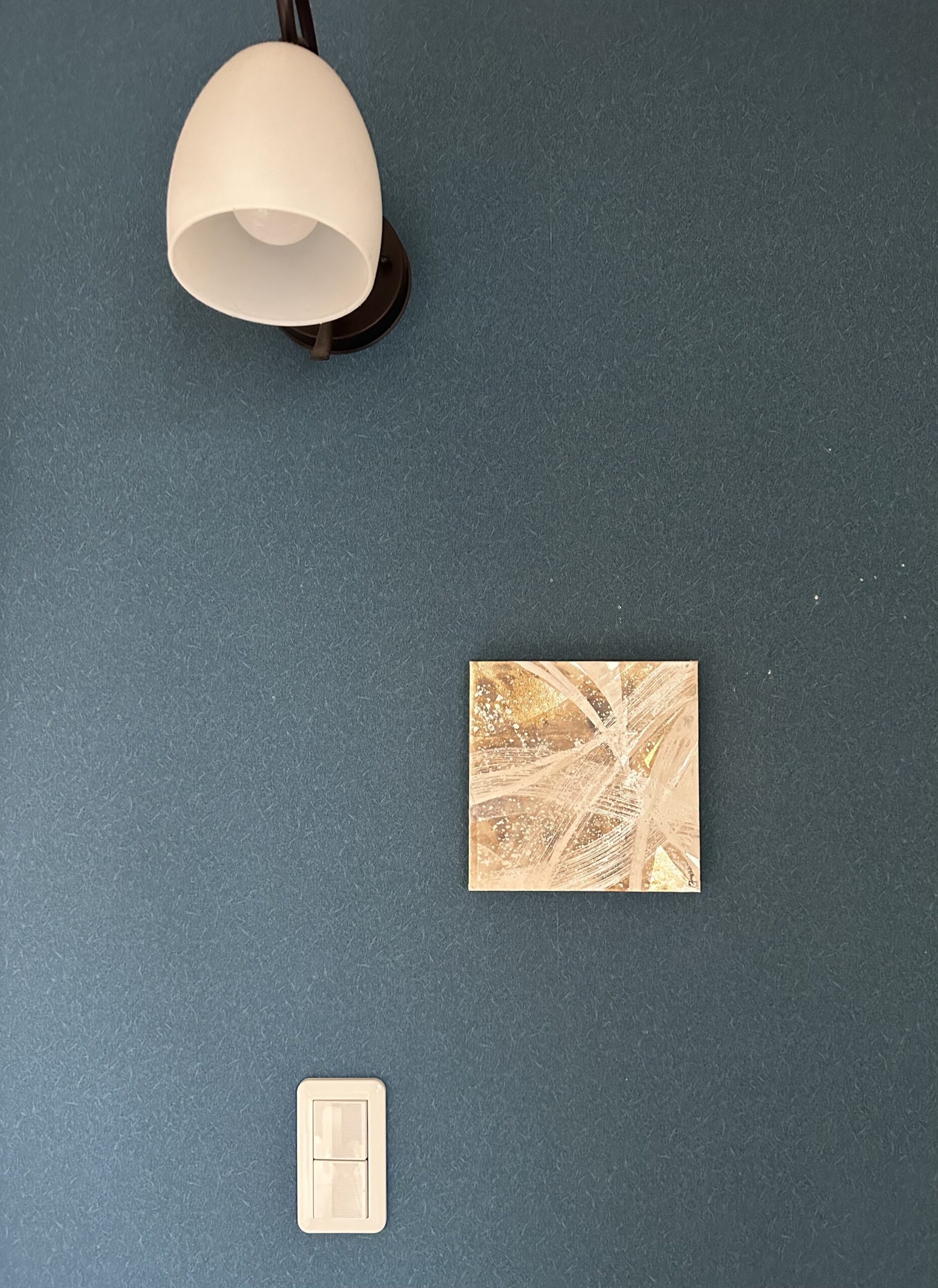 箔を使用した作品は、光のあたり方によって輝き方が変わります。日中の窓から入る自然光、夜の照明の光など、光の違いにより表情がかなり変わります。また、箔の変色を抑えるためのコーティングをしておりますが、時間経過とともに少しずつ色味が変化します。その変化もお楽しみいただけますと幸いです。