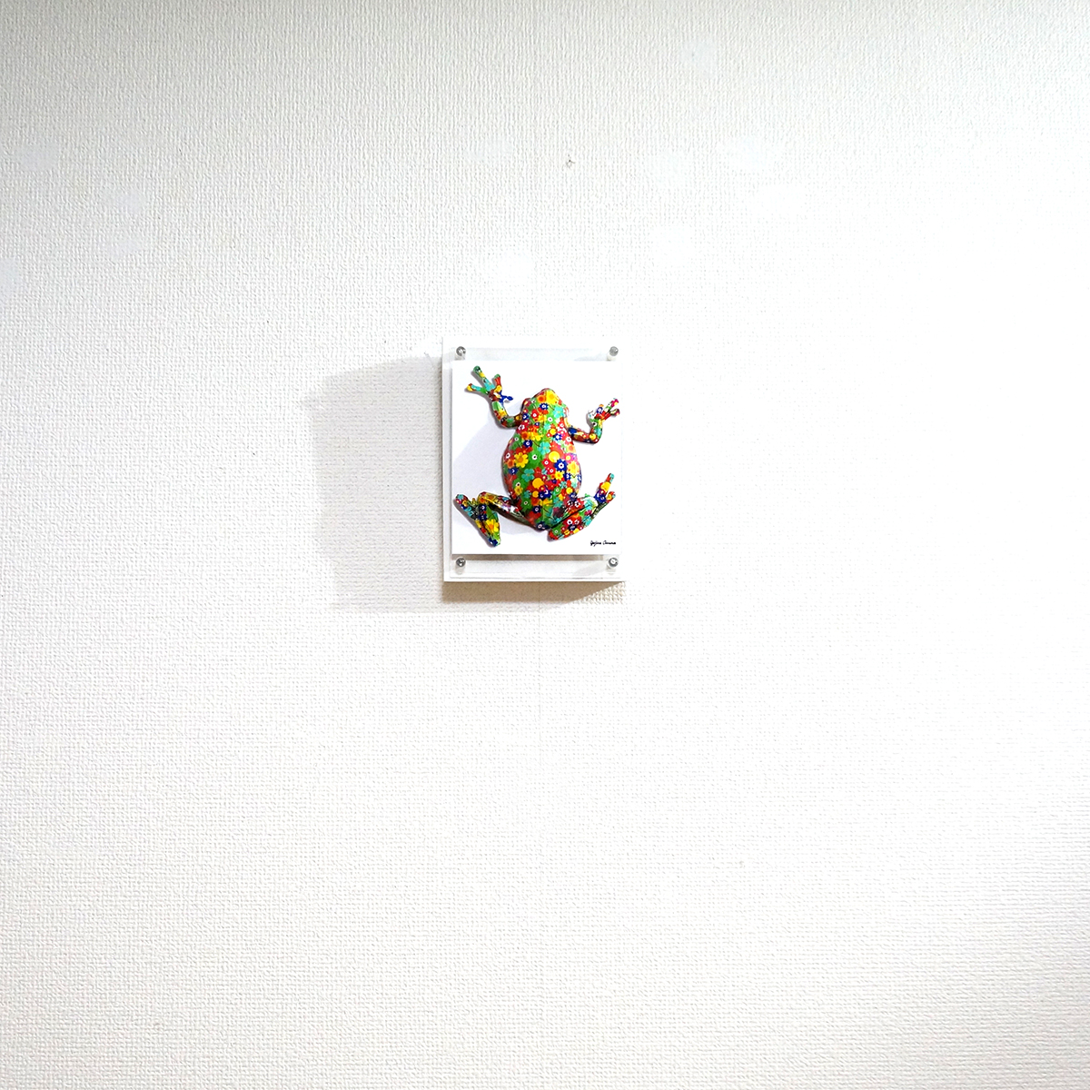 アマガエルのコラージュ画像を元にペーパークラフト技術を用いて立体的に表現した作品です。