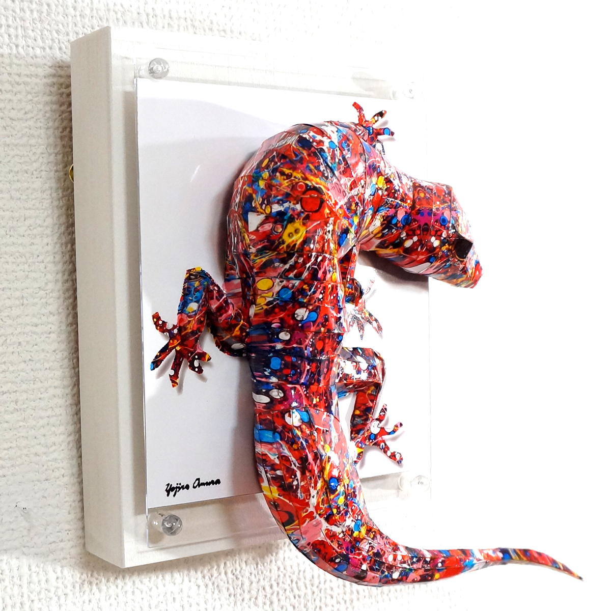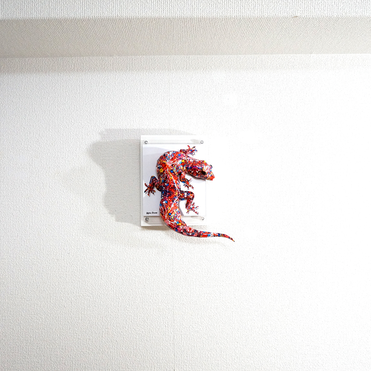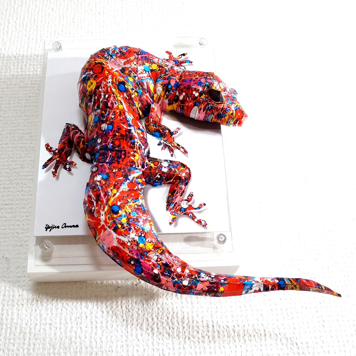 赤色を基調とした抽象的な模様とトカゲ本来の風合いを重ね合わせたデザインです。表面上は光沢紙の艶のある質感となっております。