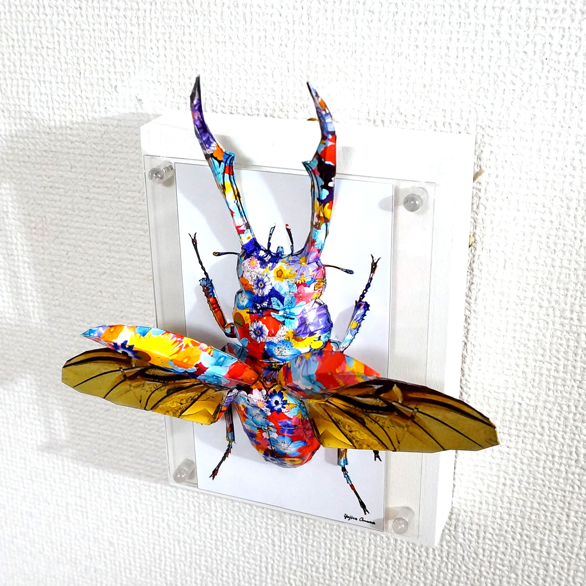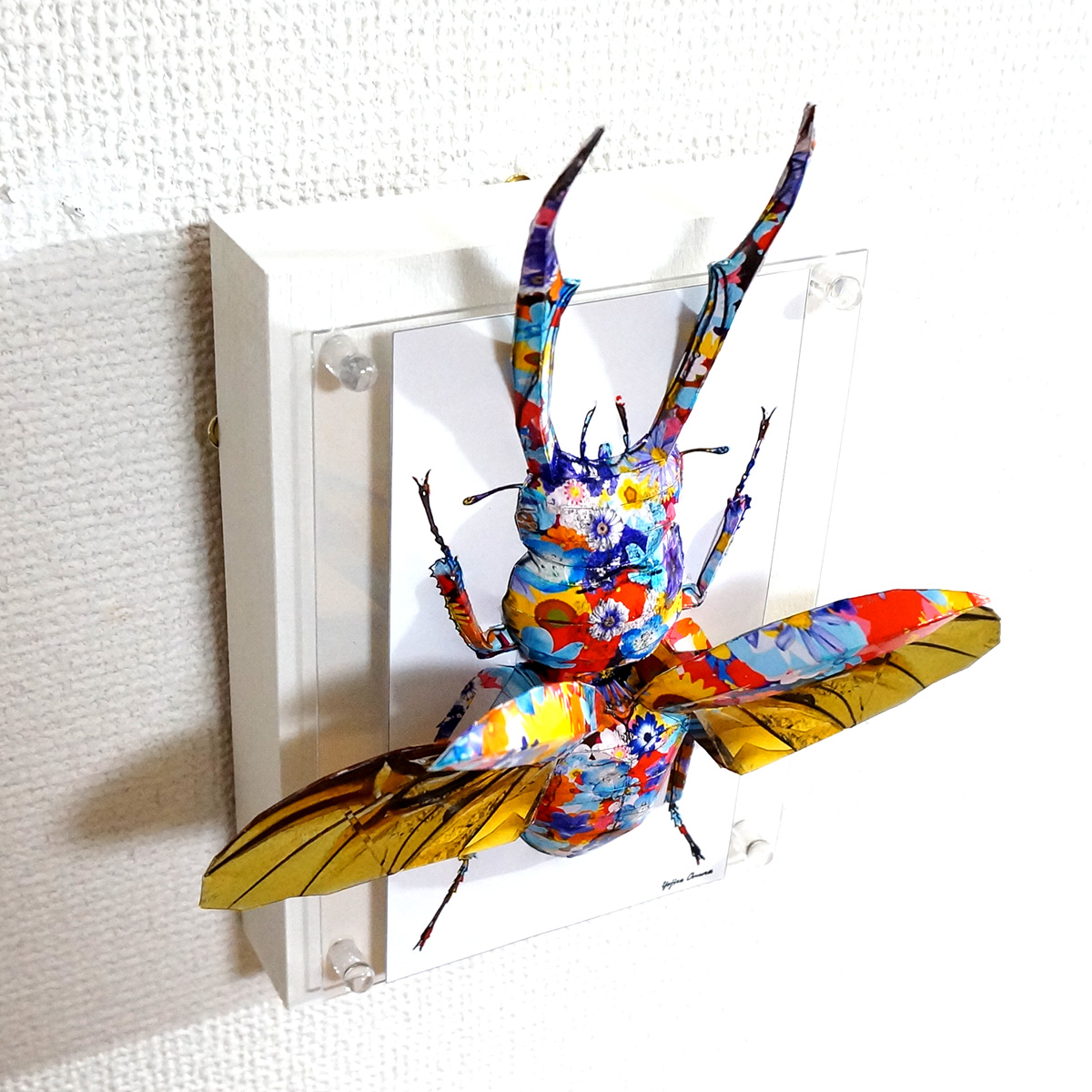 クワガタのシャープな曲線美にカラフルな花柄模様が映えるポップなイメージの作品に仕上がっております。