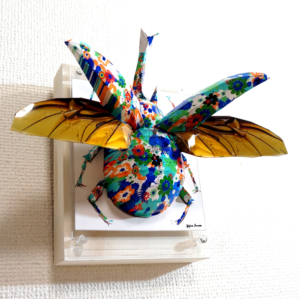 ペーパークラフト技術を用いゾウカブトムシのコラージュ画像を立体的に表現した作品です。
