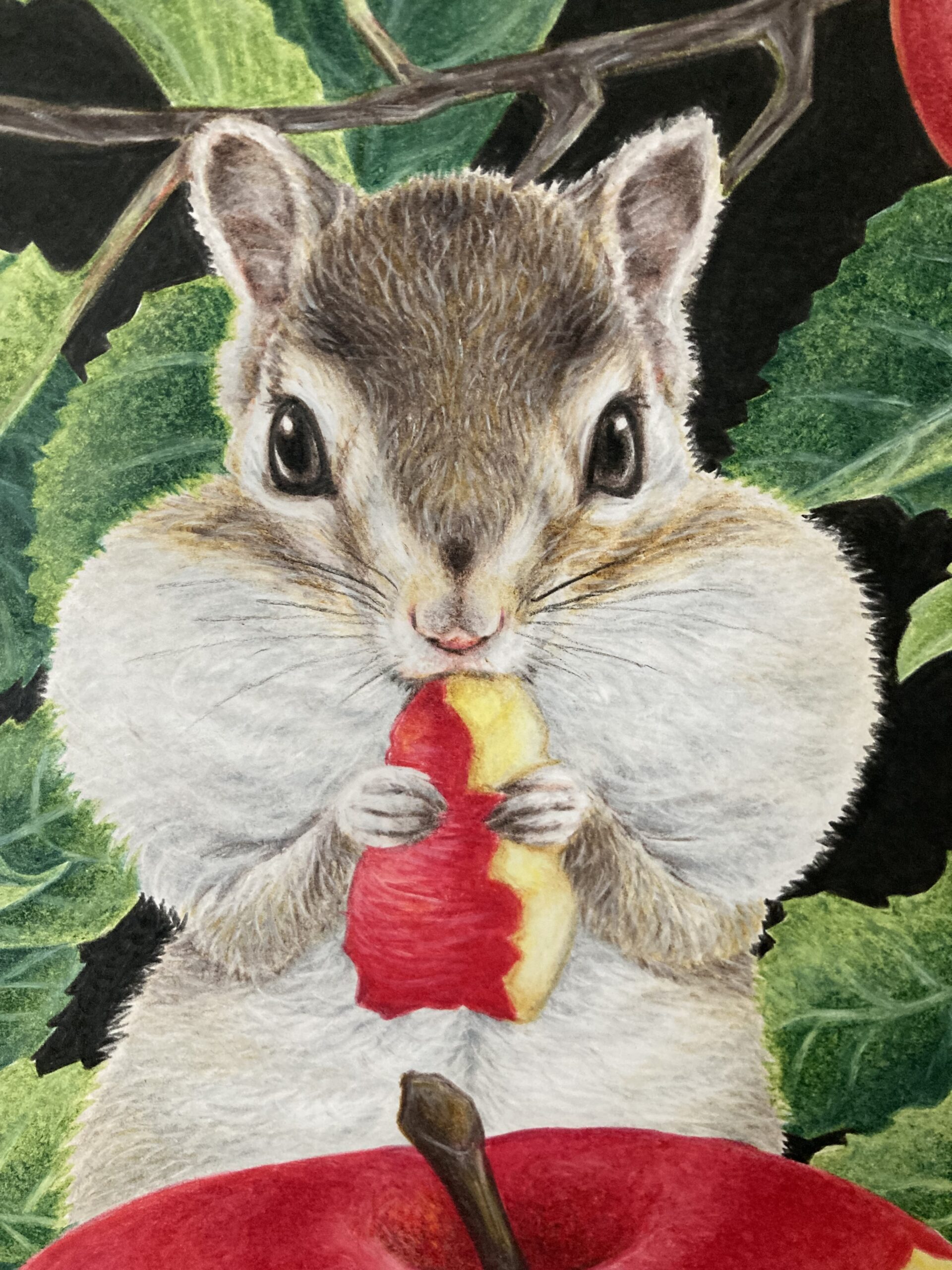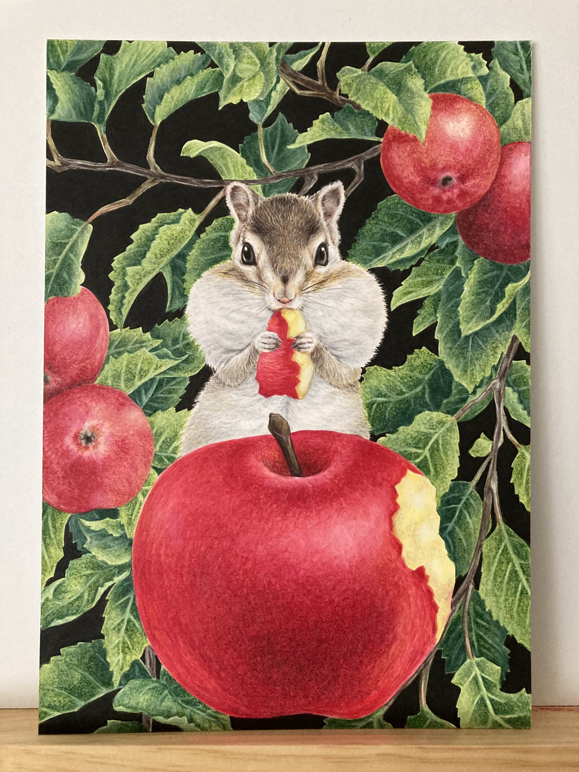 ぱんぱんに膨らんだほっぺと、真っ赤なりんごがポイント。