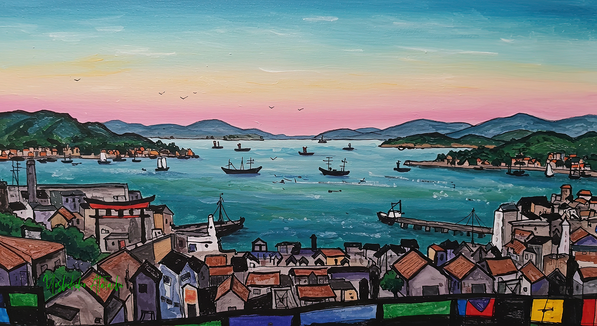 本シリーズ「Rhythmic landscape」は、海の見える町の 風景に赤・緑・黄・青・黒の図形をリズムのように織り交ぜ、心地よい躍動感を生み出した注目作です。風景と抽象の融合が独特の世界観を構築し、観る人の想像力を刺激します。明るい照明と広めの壁面が映えます。空間にエネルギーと詩的な印象を与える現代アートとして、住宅・店舗・ホテルロビーなどに最適です。