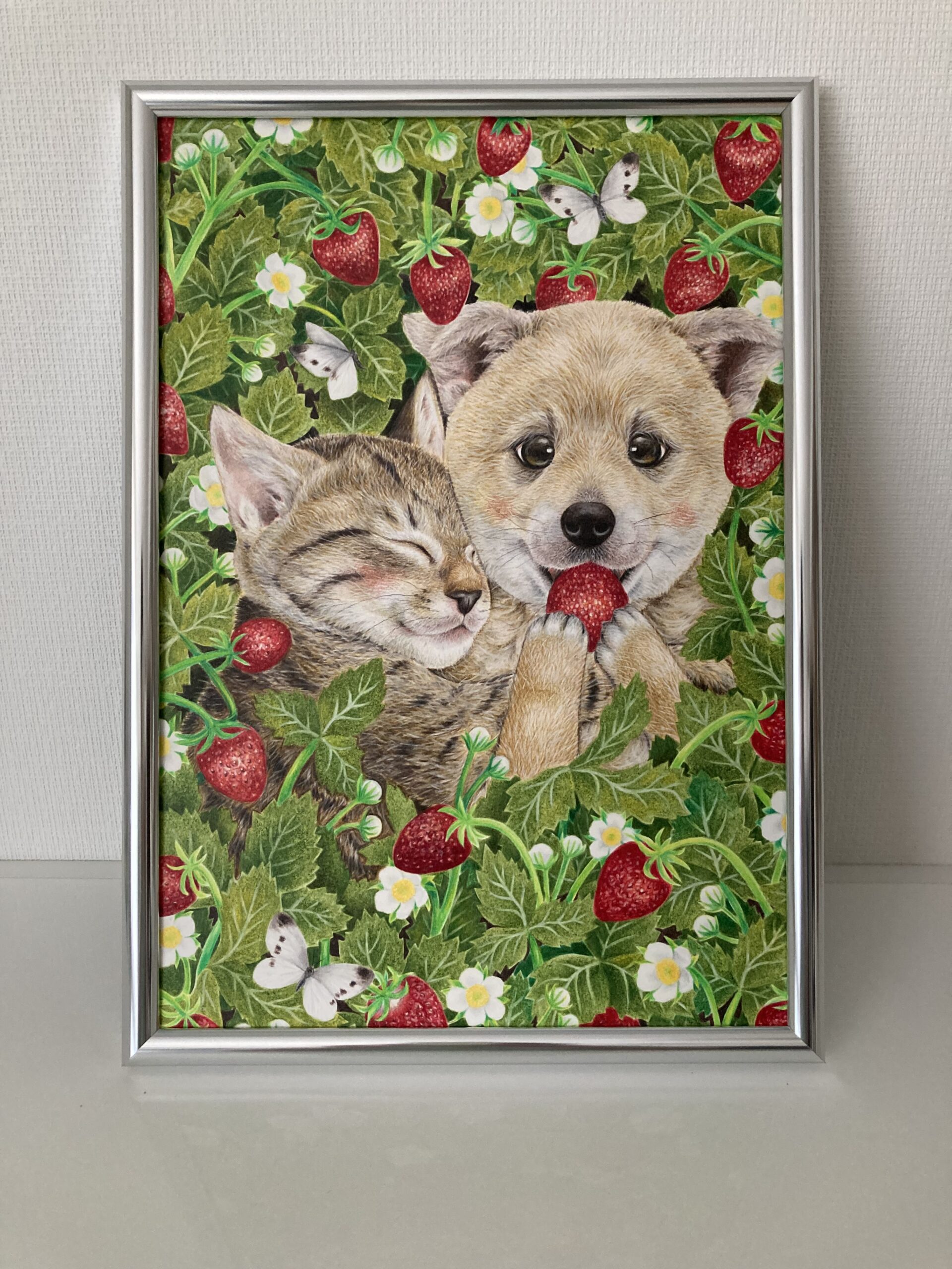 仲良し二人組。全力で捕まえる猫さんと、捕まったけどまんざらでもない犬さんがポイントです。