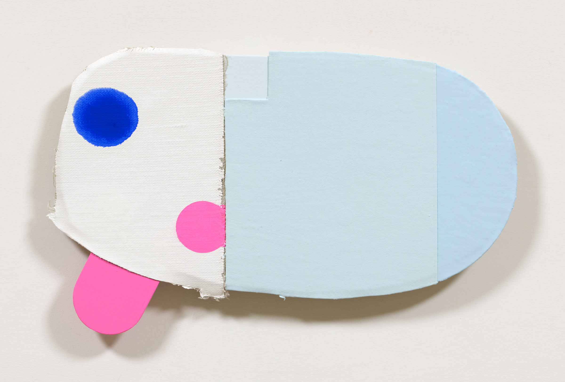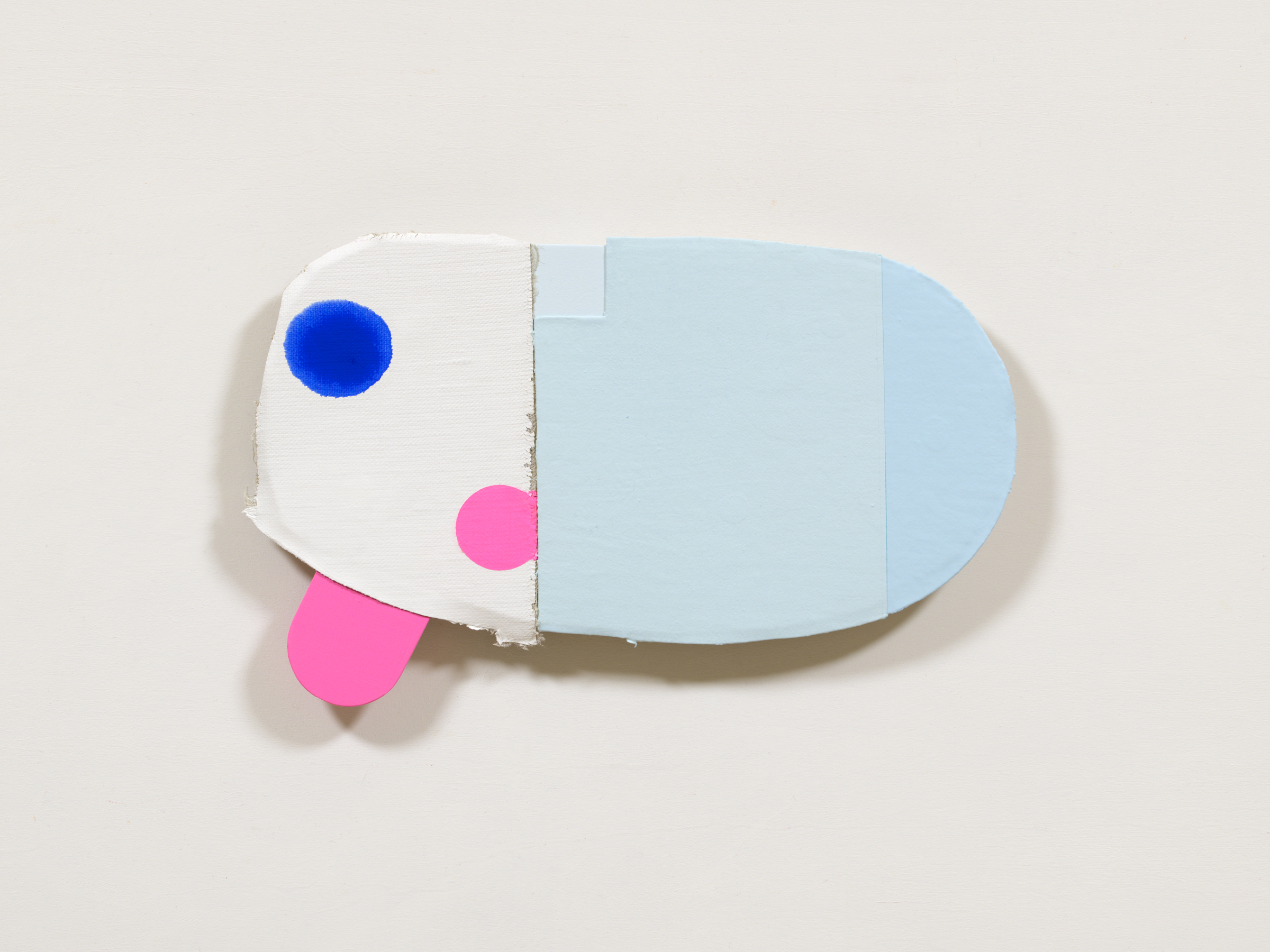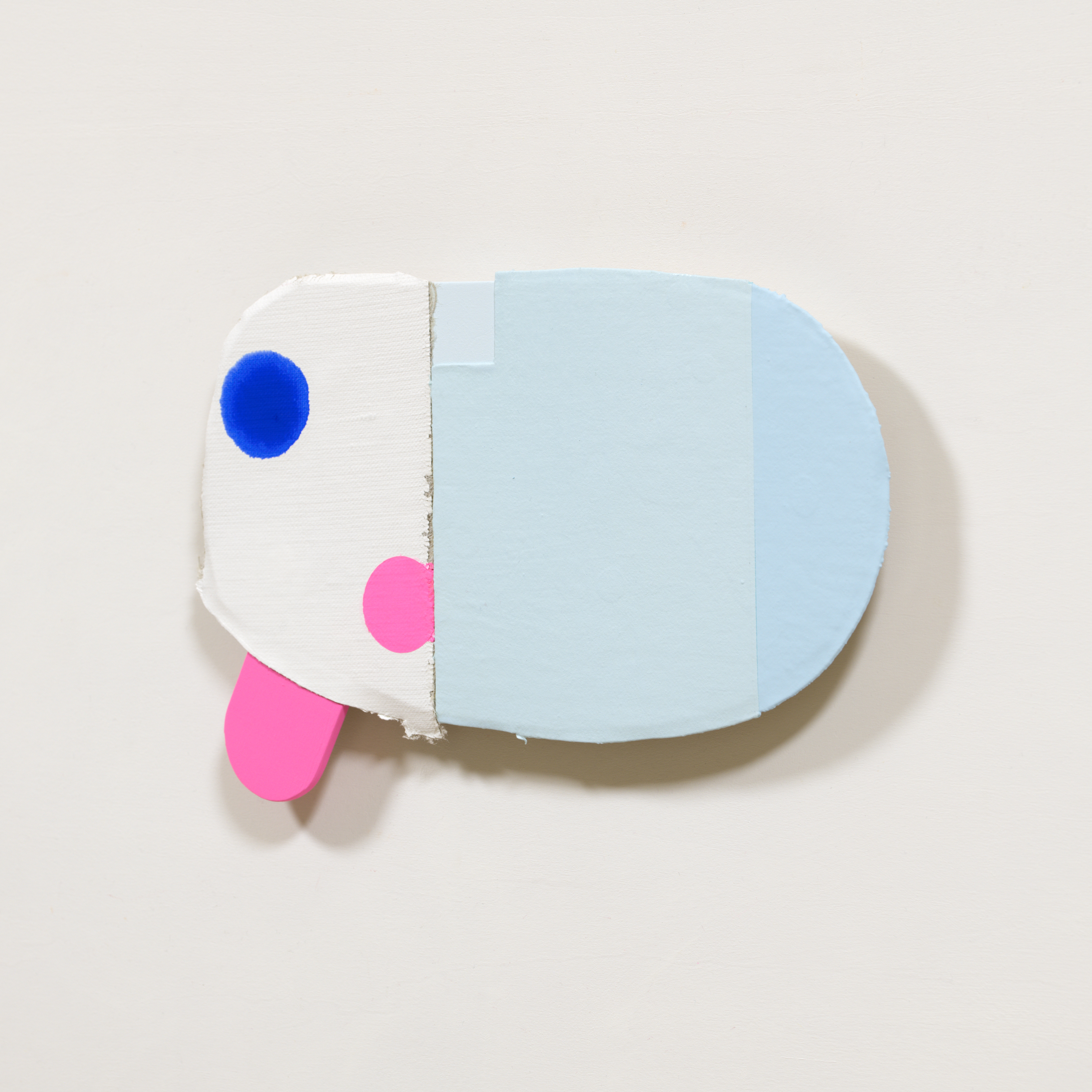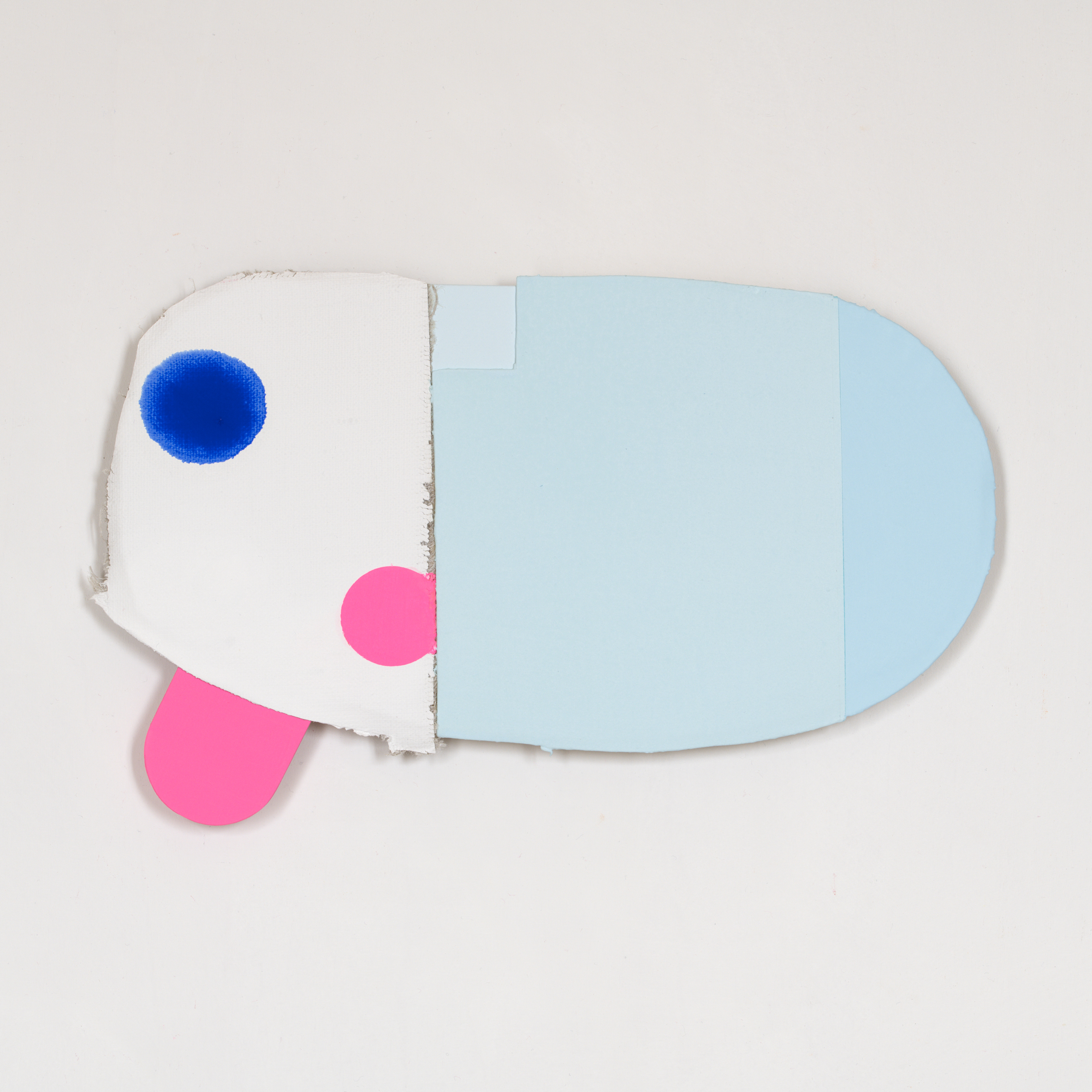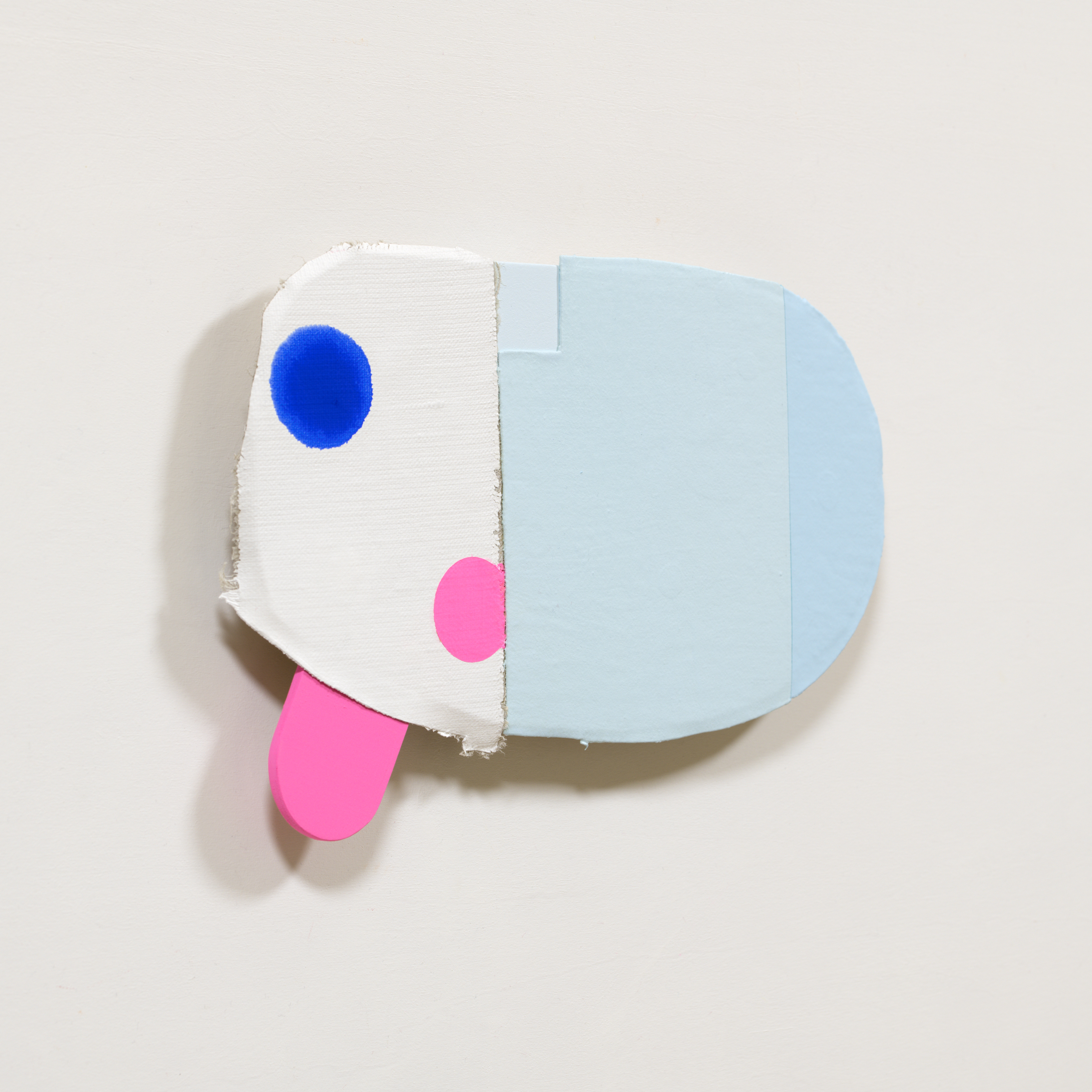 張られていないキャンバス、木材にアクリル絵具。裏側に展示用の角材が接着されています。