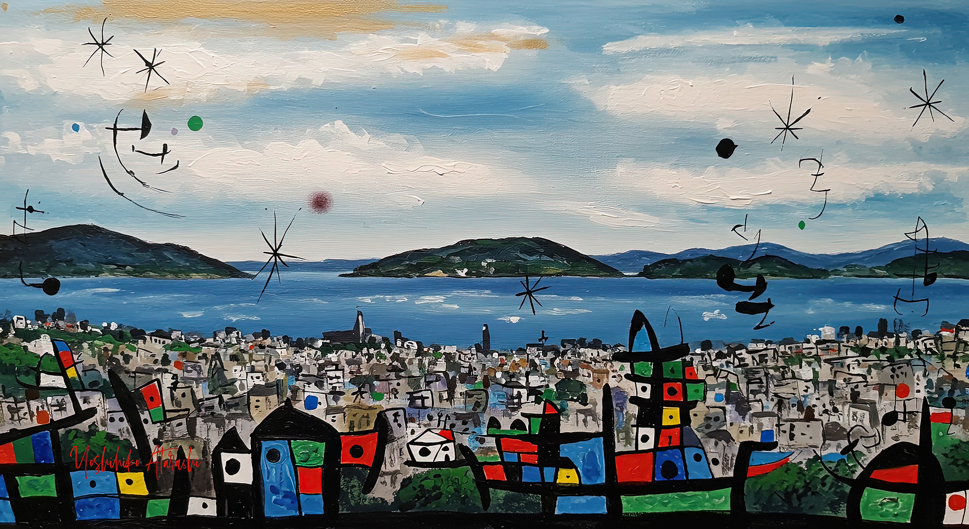 この「Rhythmic landscape」シリーズは、赤・緑・黄・青・黒の図形によって風景にリズムを与え、都市と自然の調和を音楽のように表現した作品群です。幾何学的な形と色彩のリズムが、海や空、街並みに生命感をもたらし、眺める人の感情に働きかけます。現実の風景を抽象の視点で再構成し、日常の中にあるエネルギーと詩情を引き出すことを意図しました。