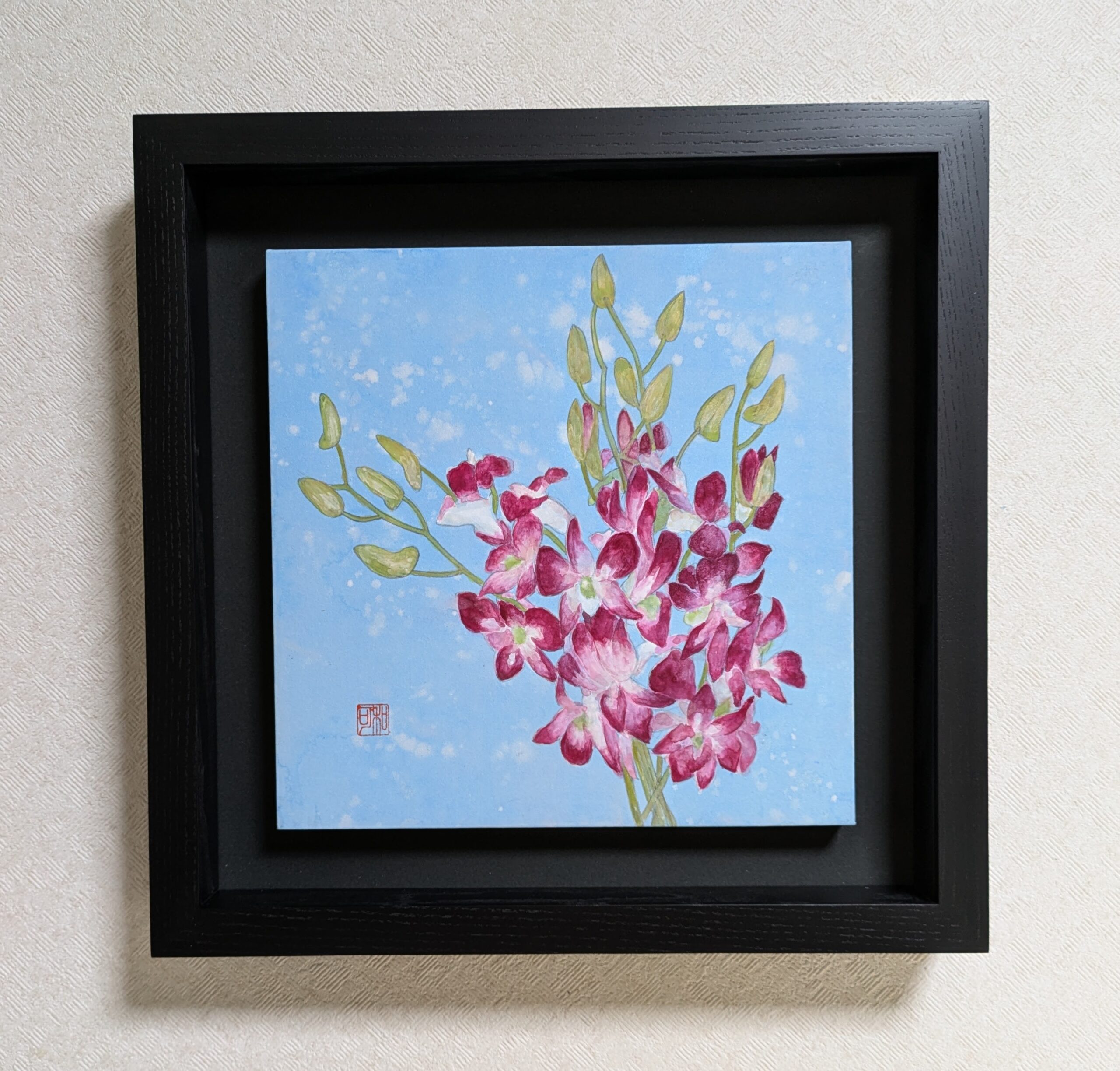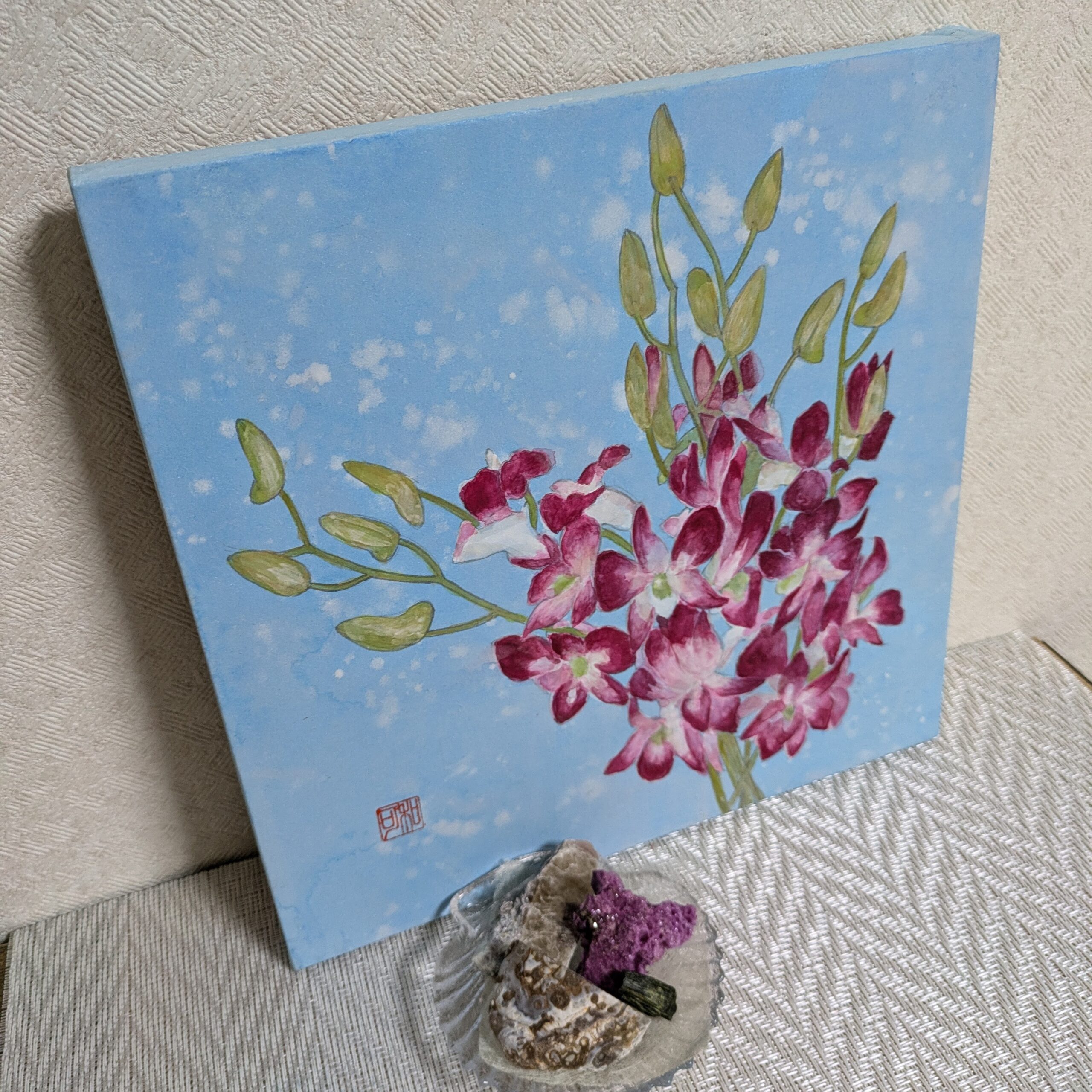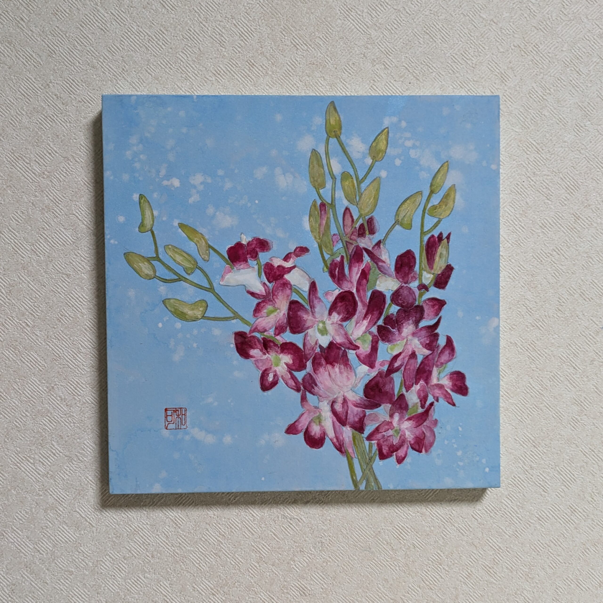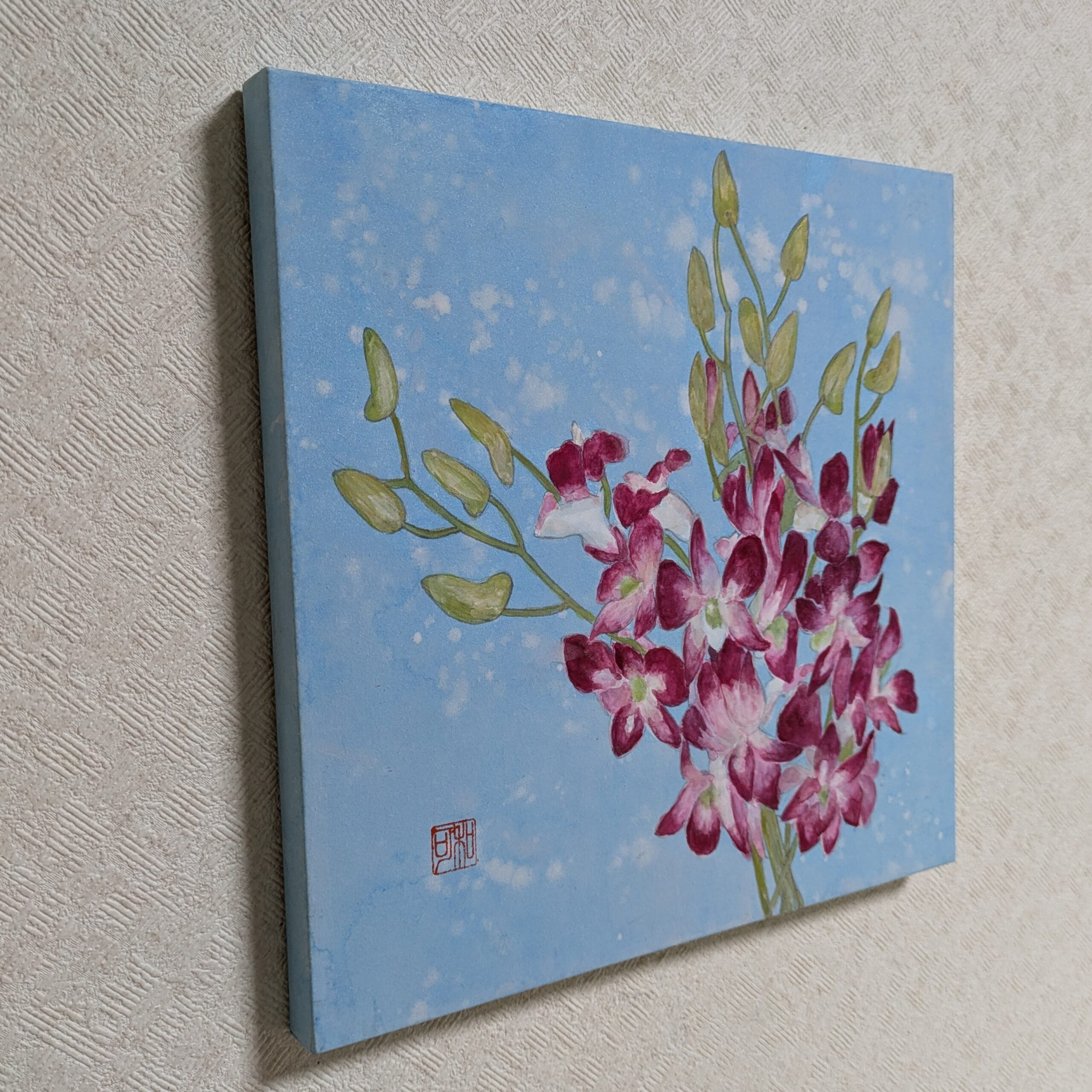 夏の暑さに負けないように、鮮やかな色のデンファレを描きました。花言葉は「喜び」