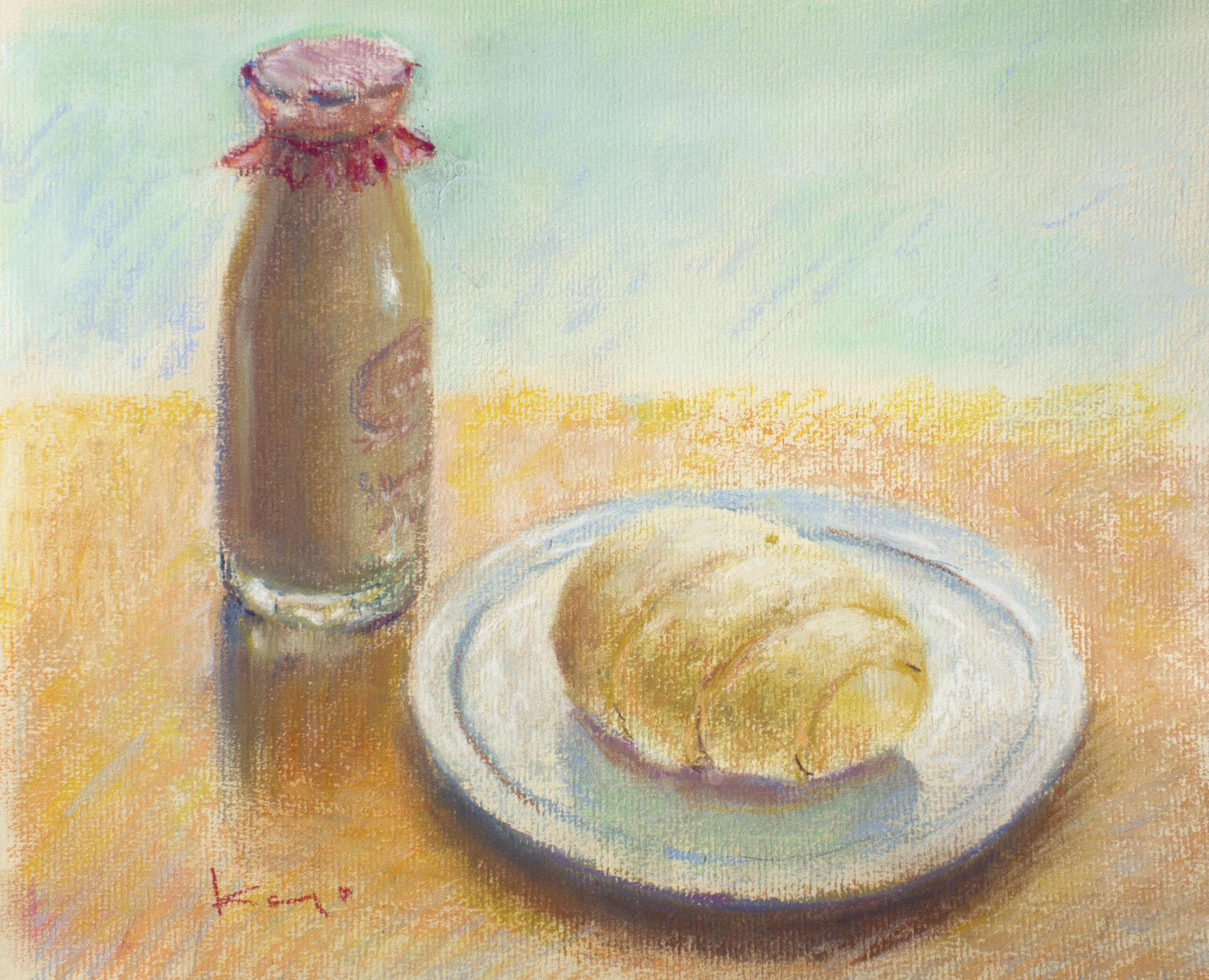 朝のイメージでコーヒー牛乳とミルクパンを描きました。素朴なモチーフで、あたたかみのある日常の風景を表現しました。