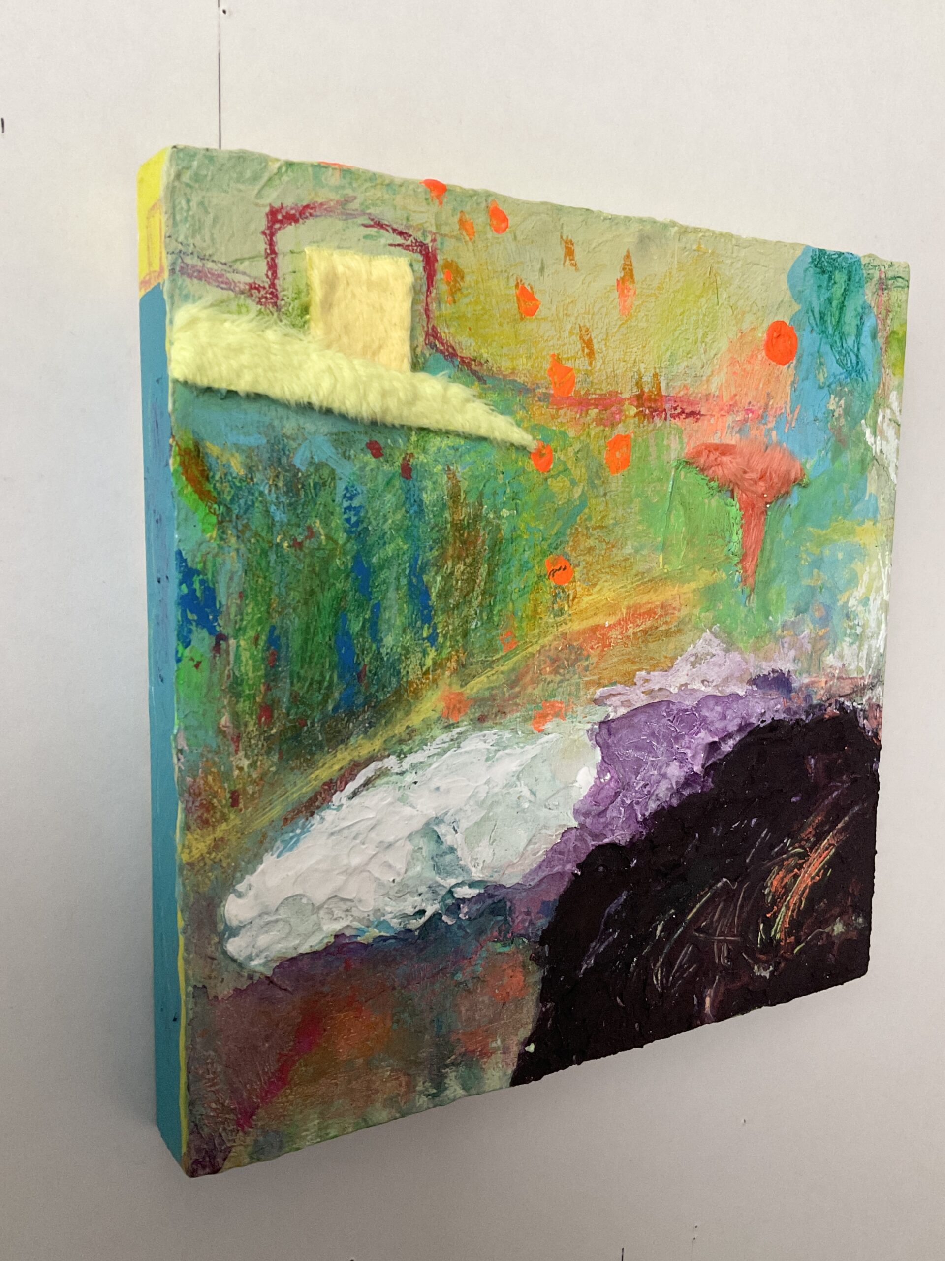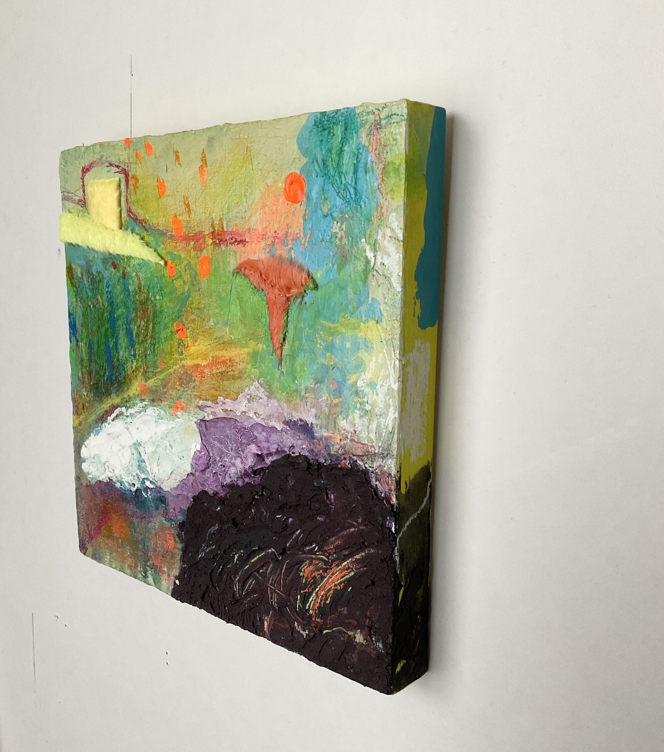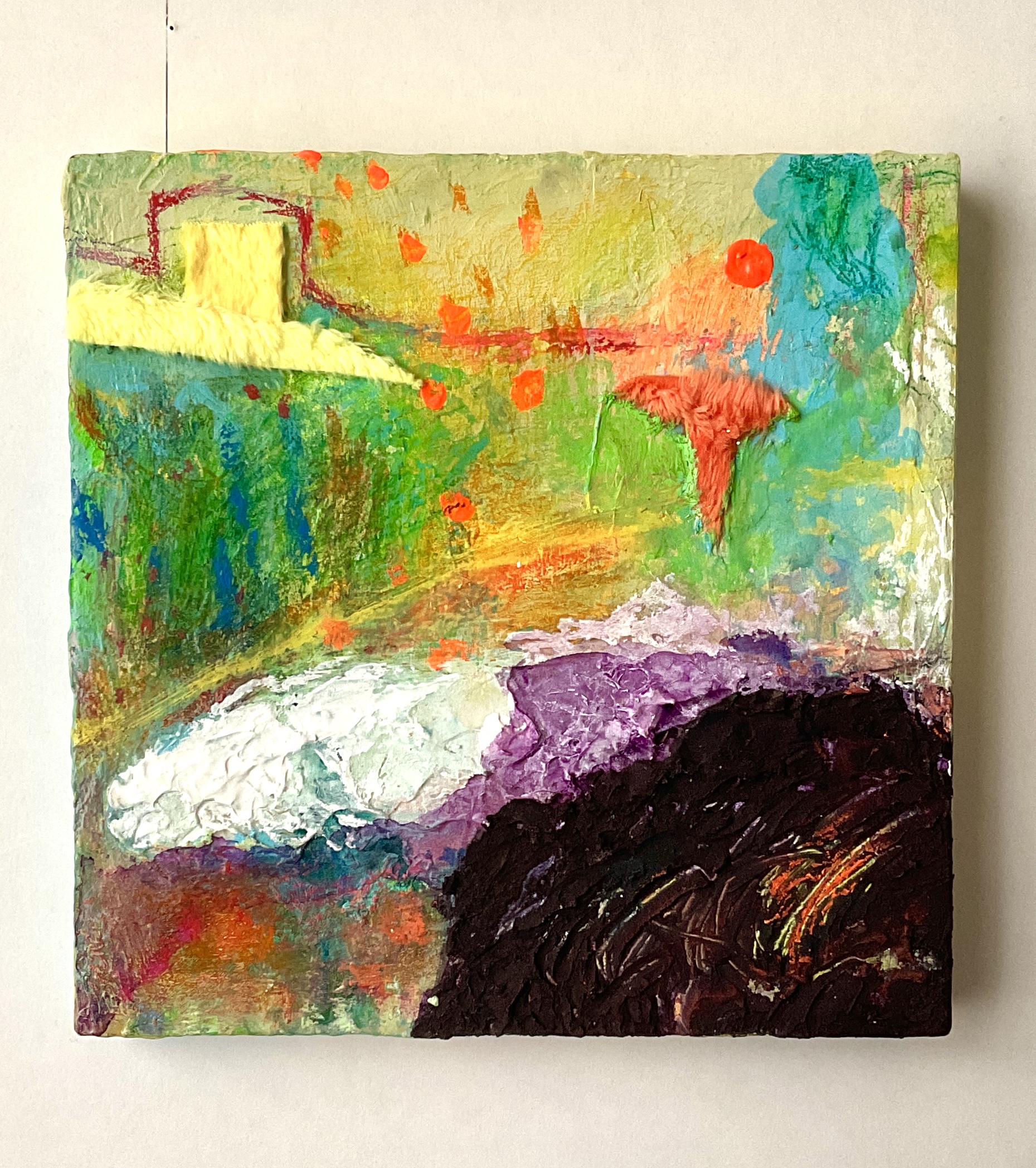 抽象画小作品です。色とマチエールから想像的に抽象絵画を楽しんでいただけると思います。壁かけ用ヒモ付/保護液塗布済