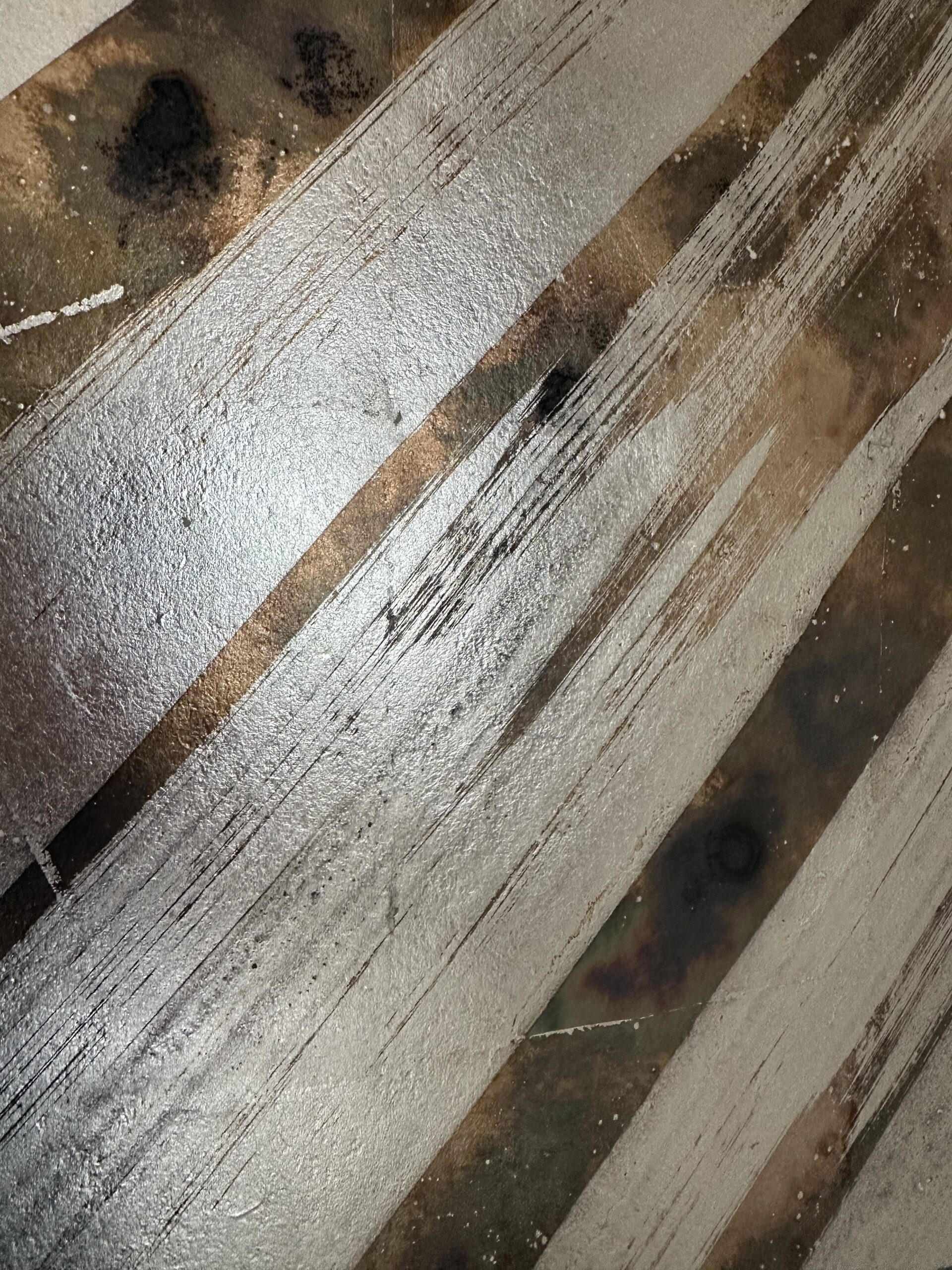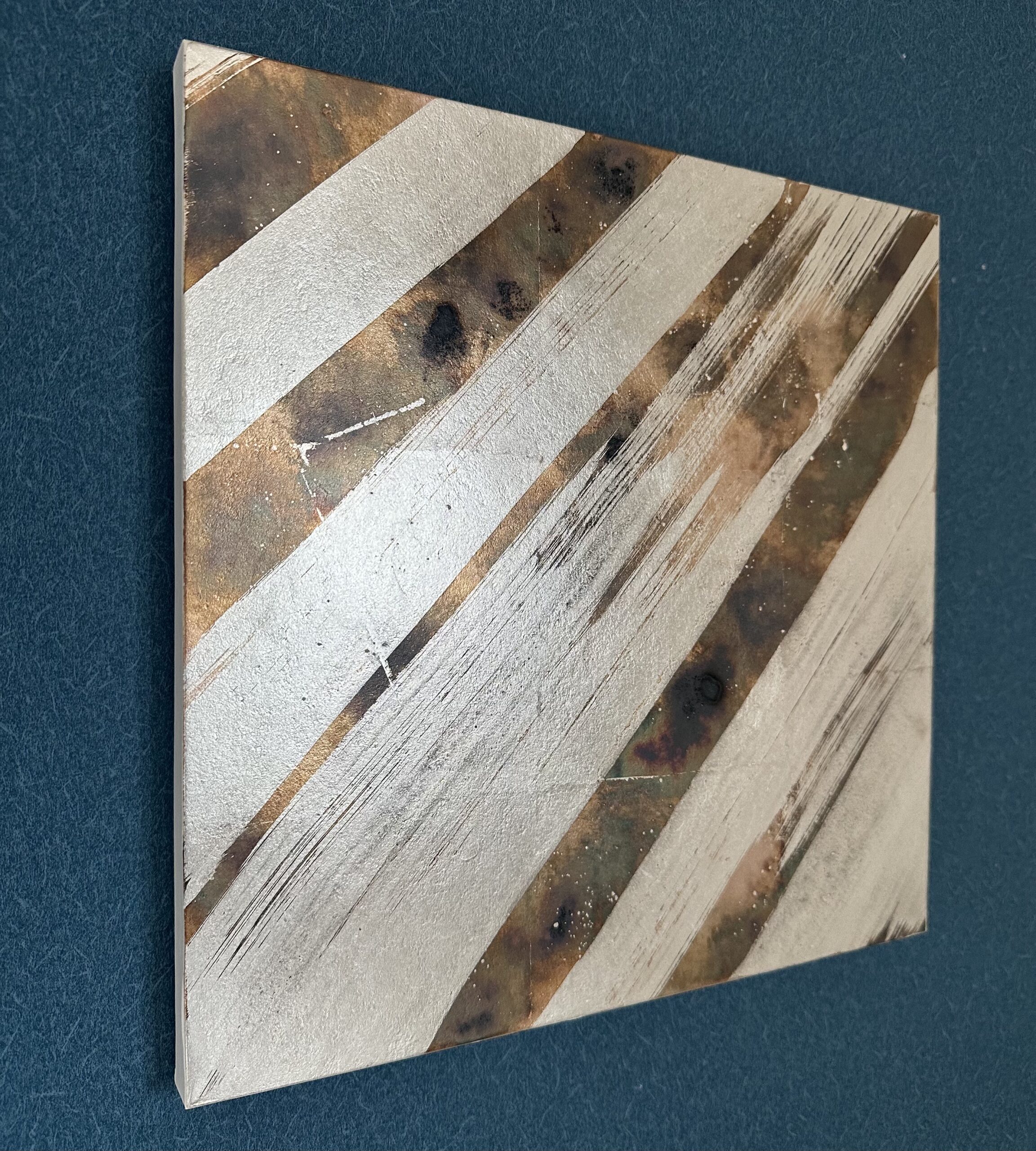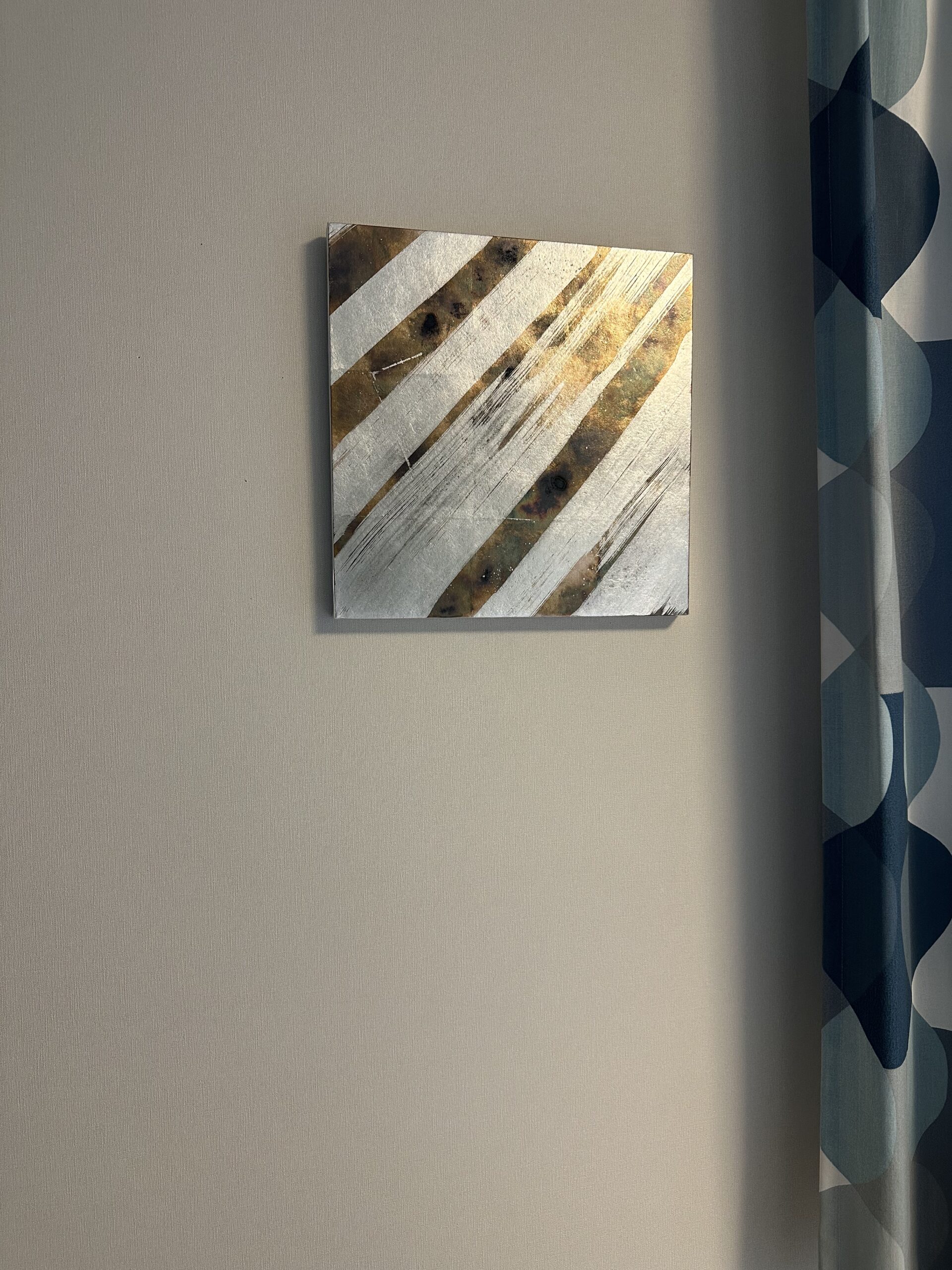 箔を使用した作品は、光のあたり方によって輝き方が変わります。日中の窓から入る自然光、夜の照明の光など、光の違いにより表情がかなり変わります。また、箔の変色を抑えるためのコーティングをしておりますが、時間経過とともに少しずつ色味が変化します。その変化もお楽しみいただけますと幸いです。