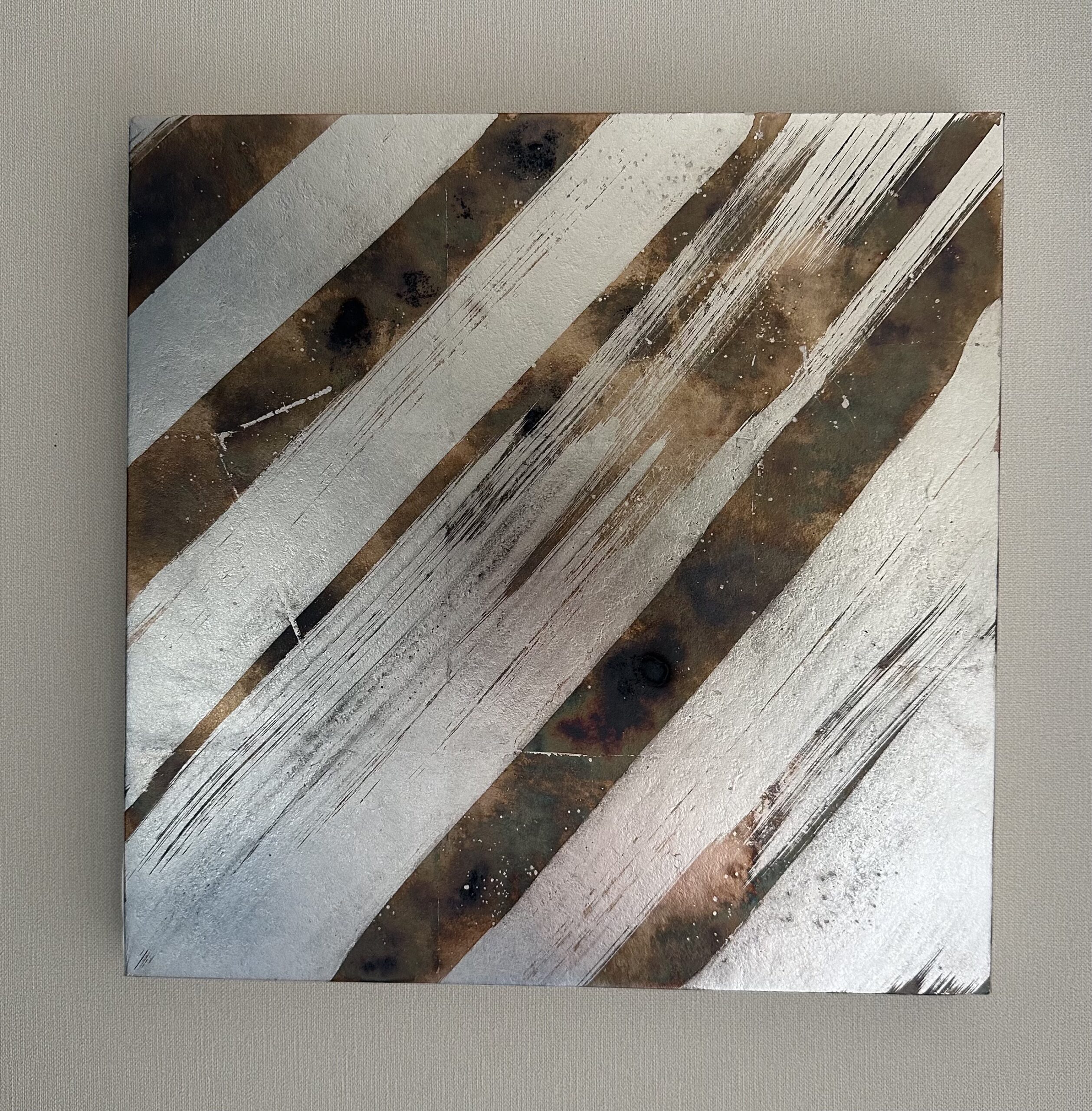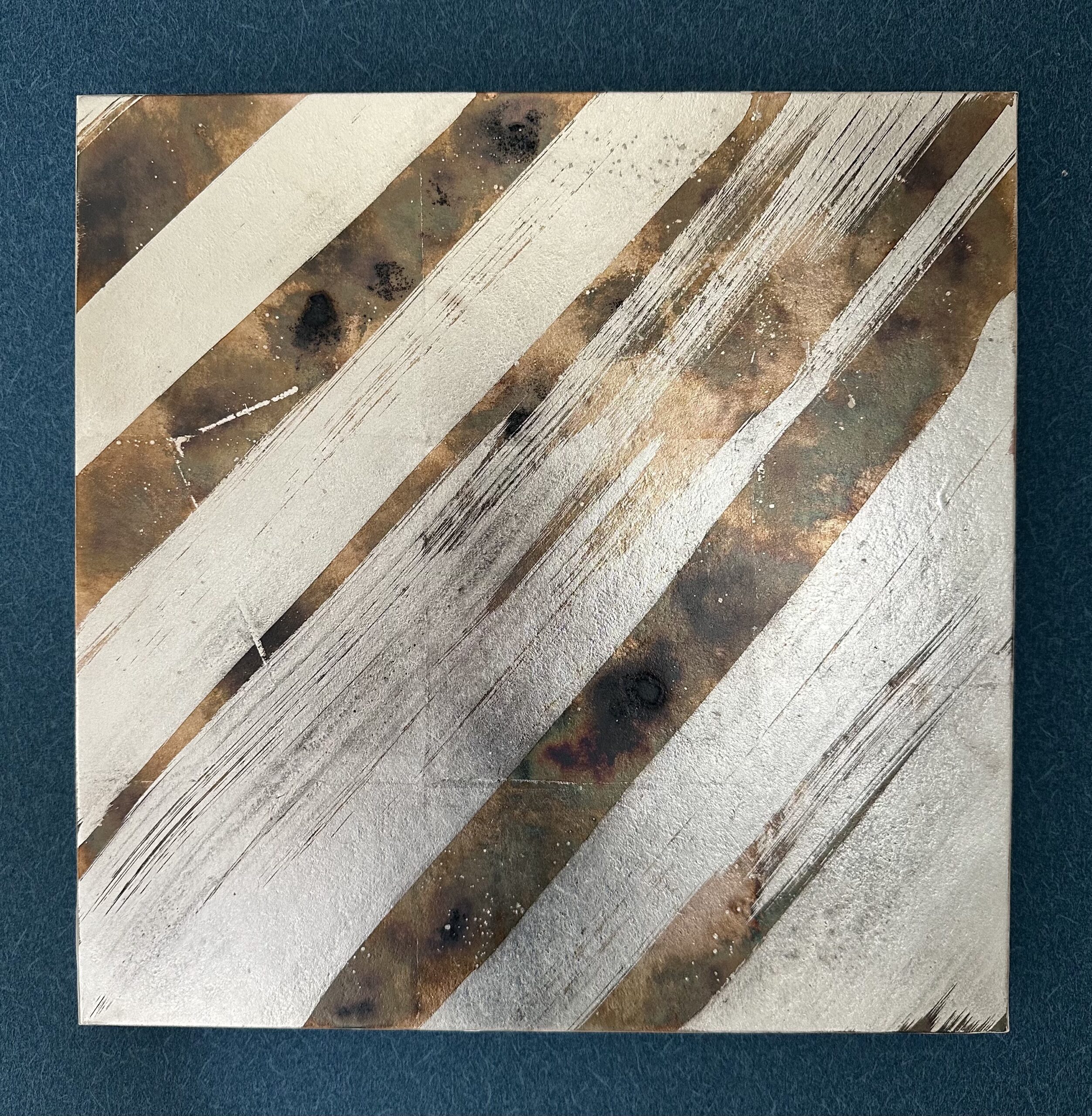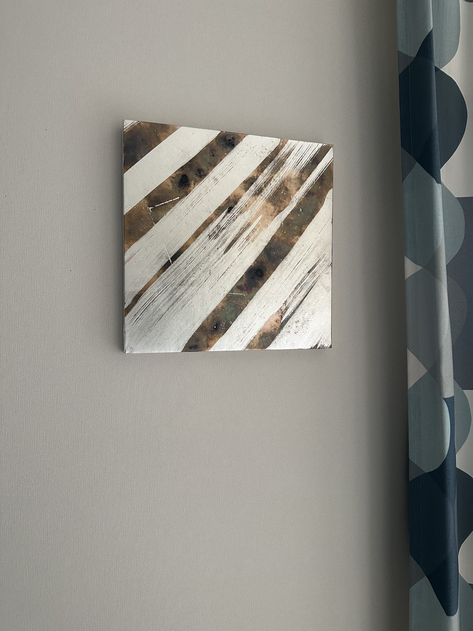 箔を使用した作品は、光のあたり方によって輝き方が変わります。日中の窓から入る自然光、夜の照明の光など、光の違いにより表情がかなり変わります。また、箔の変色を抑えるためのコーティングをしておりますが、時間経過とともに少しずつ色味が変化します。その変化もお楽しみいただけますと幸いです。