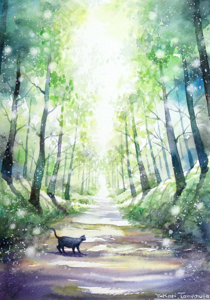 こもれびの差す、明るい並木道の風景を水彩で表現しました。