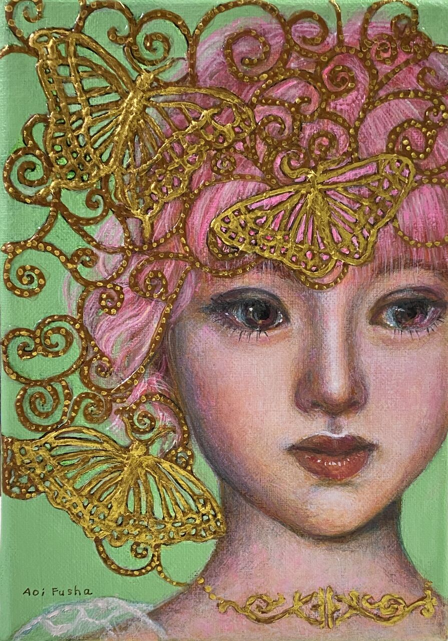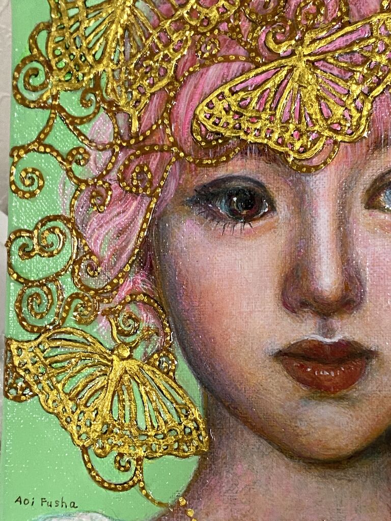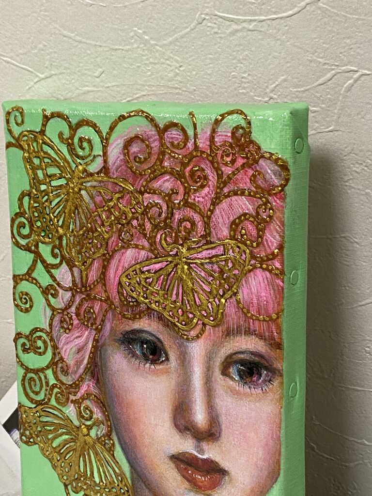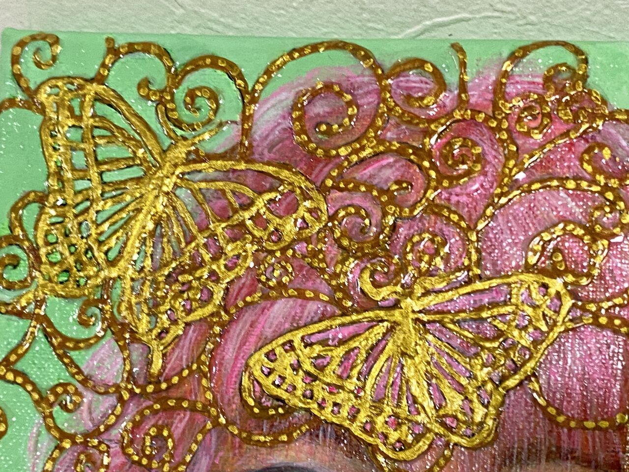 蝶とネックレスは線状に絵の具を盛り上げ金属のレースに見えるようなマチエール