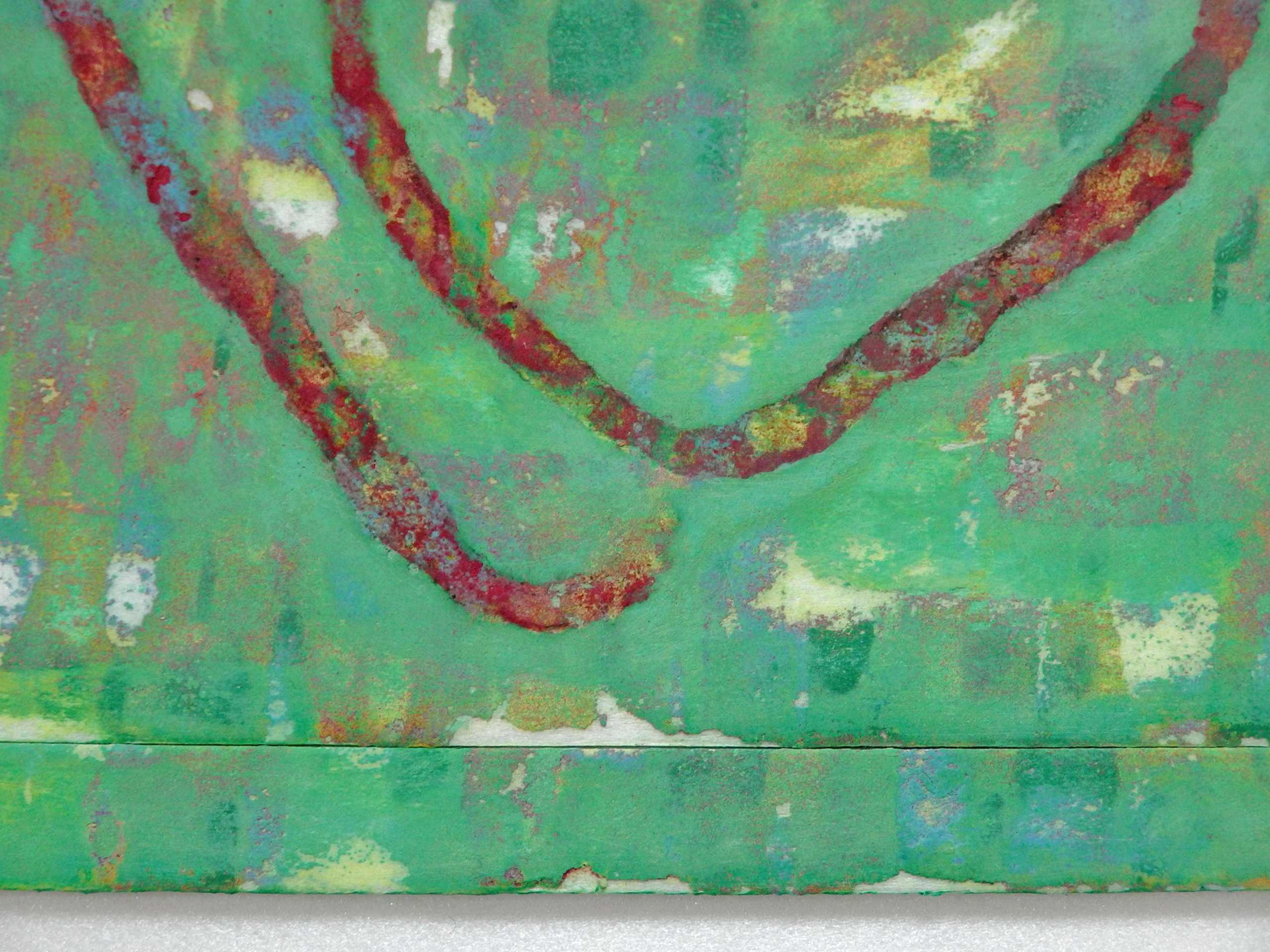 天然素材の和紙に膠を使うのが「日本画」の常識ですが、あえて人工素材を使っています。