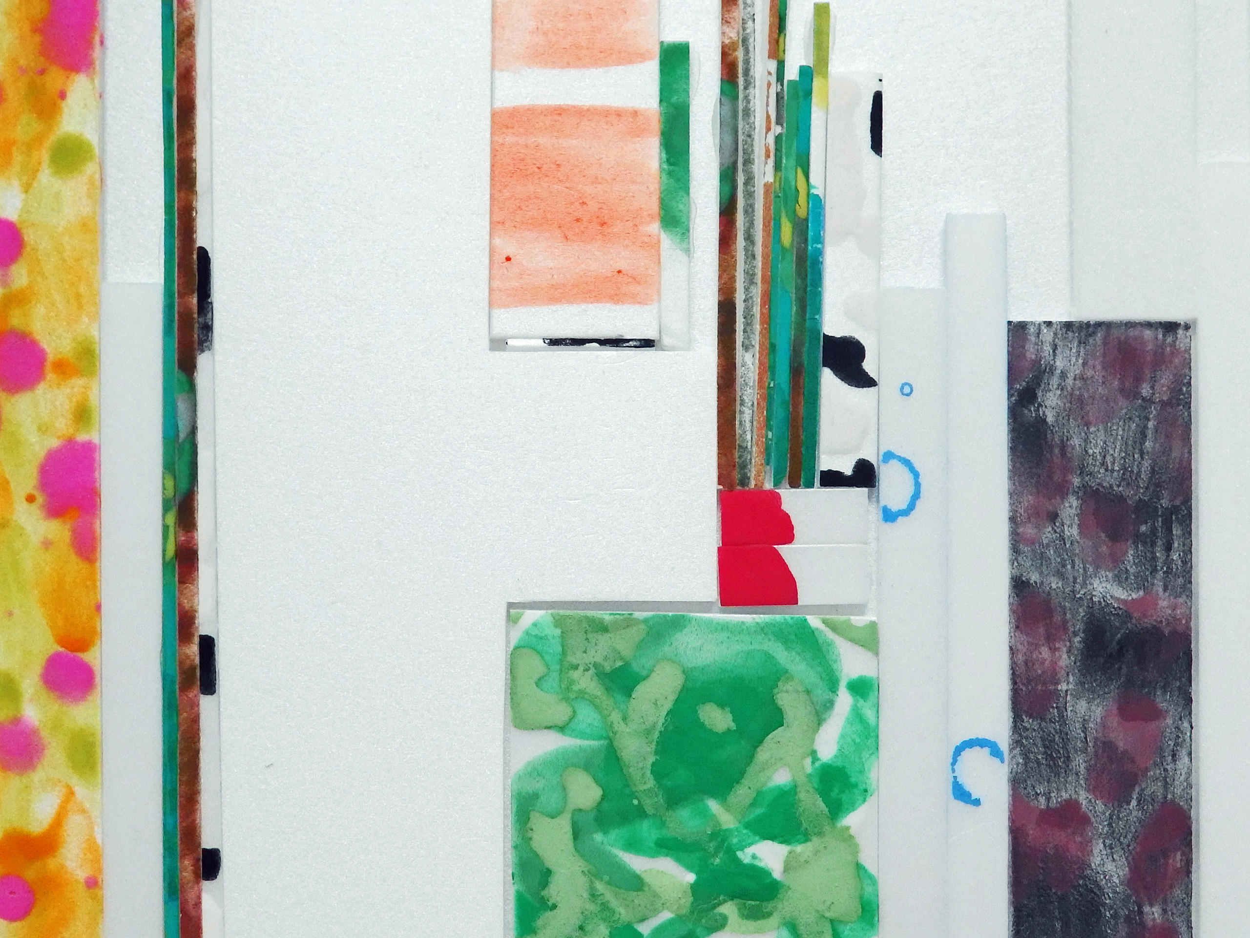 天然素材の和紙に膠を使うのが「日本画」の常識ですが、あえて人工素材を使っています。