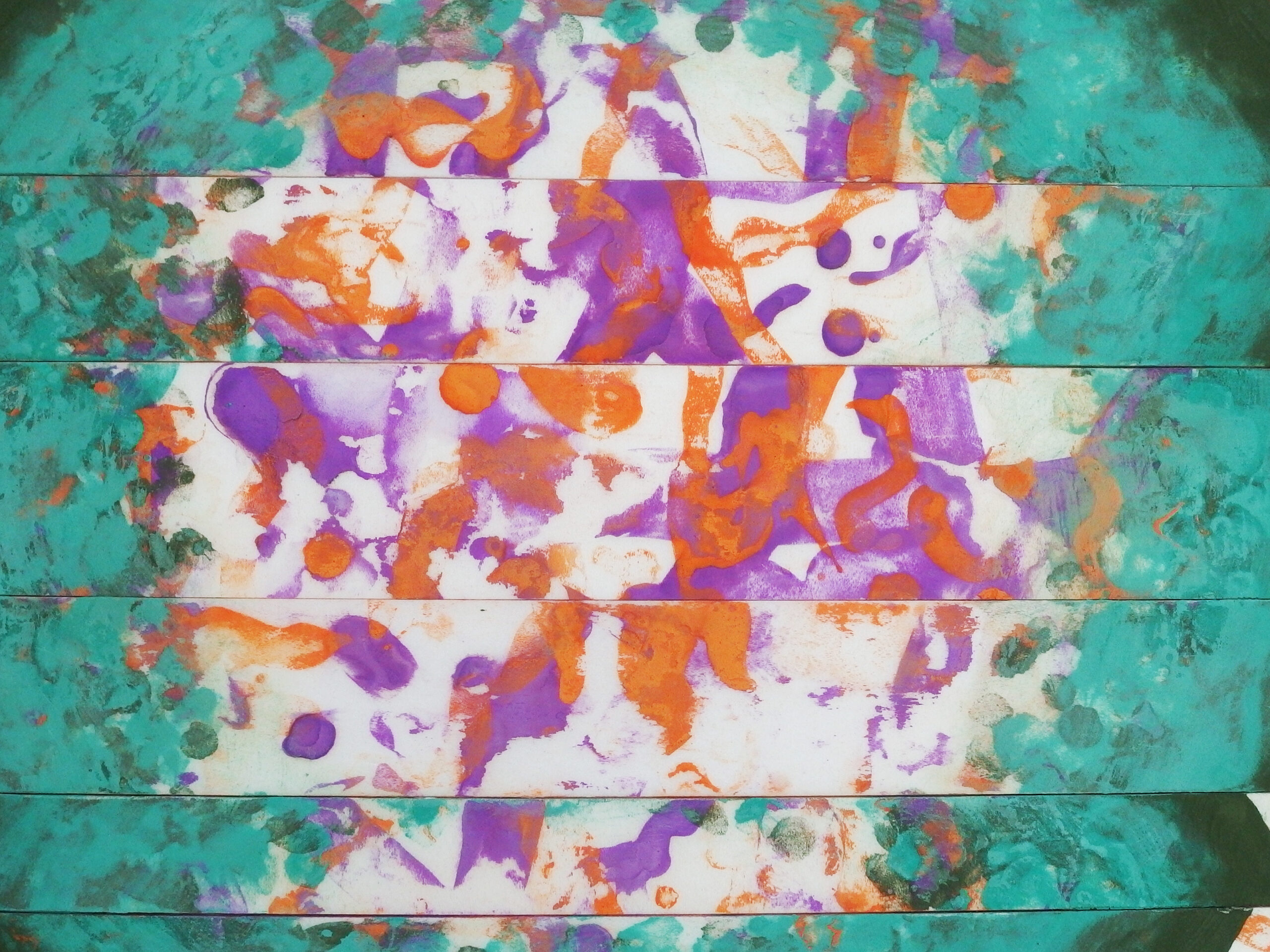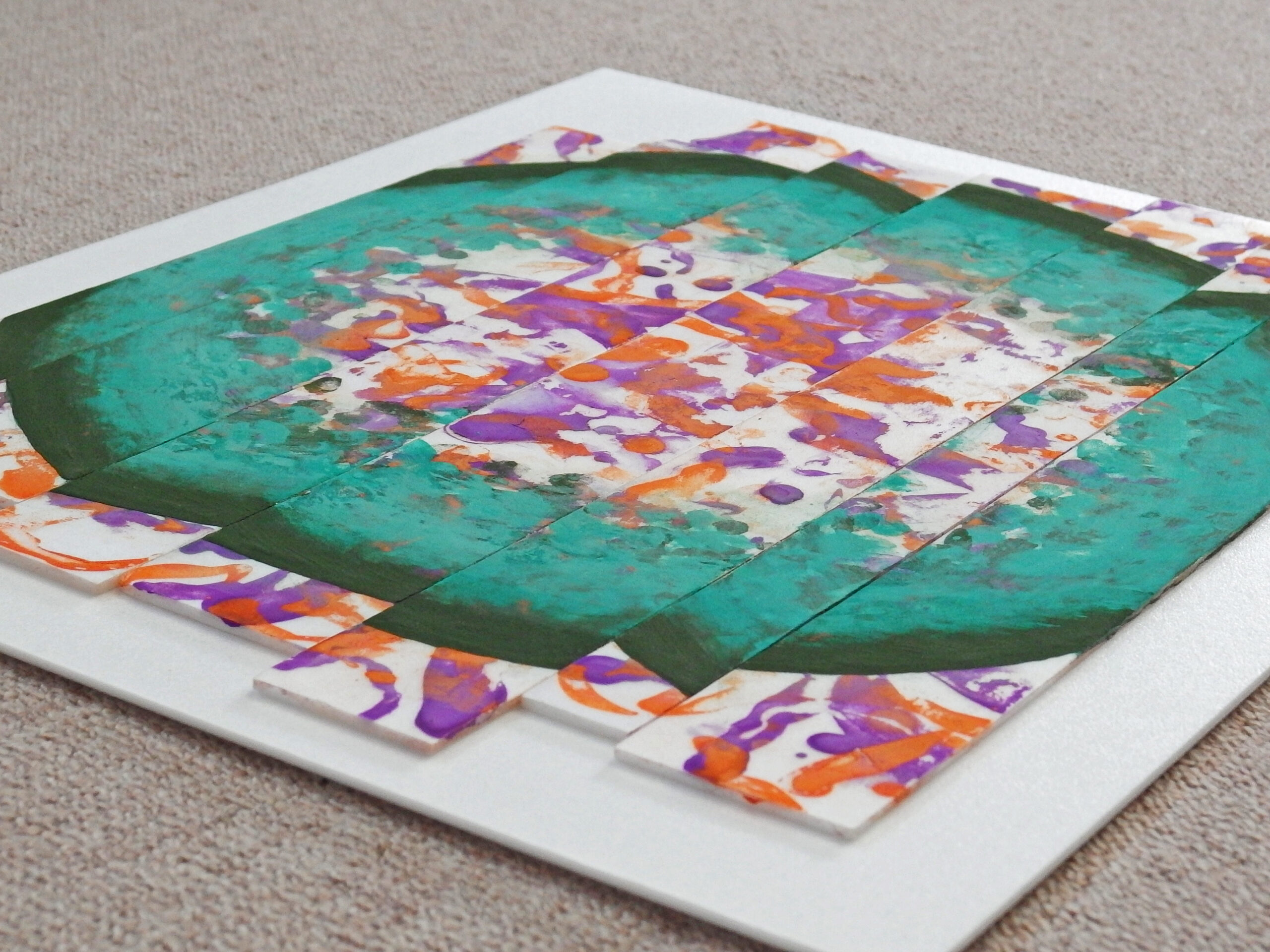 天然素材の和紙に膠を使うのが「日本画」の常識ですが、あえて人工素材を使っています。
