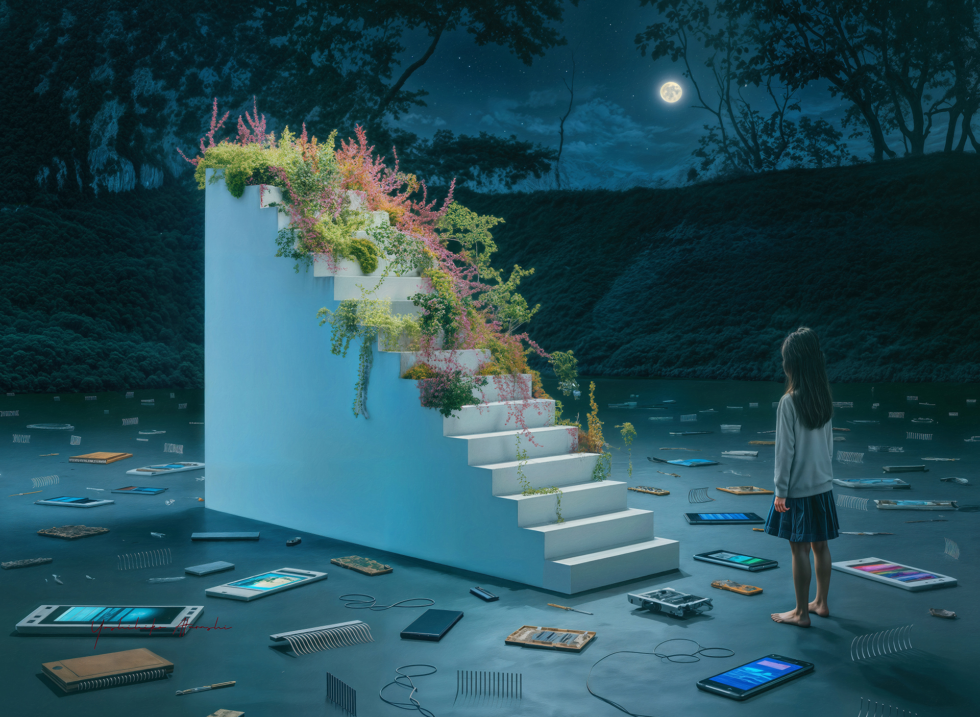 本作「少女と回路の迷宮」シリーズは、テクノロジーと自然が交差する幻想的な世界を少女の視点で描いています。無数の電子機器と緑に包まれた階段は、現代社会の迷路を象徴。絵本のような温かみとSF的世界観が融合し、幅広い世代に響きます。展示は階段状に並べ、少女の旅を追体験できる構成がおすすめ。空間全体で一つの物語を感じさせる、没入型のアート体験をぜひご堪能ください。