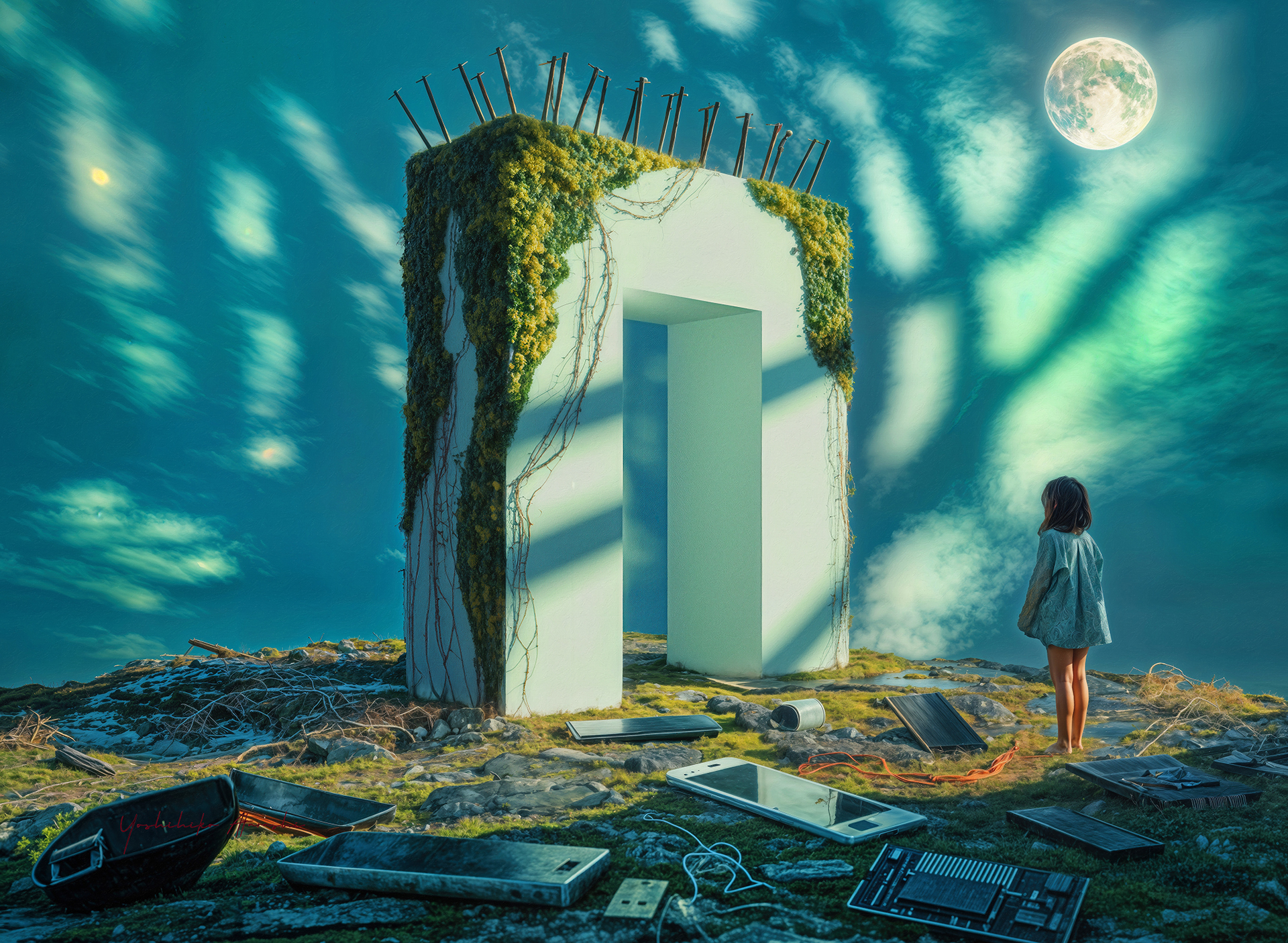 本作「少女と回路の迷宮」シリーズは、テクノロジーと自然が交差する幻想的な世界を少女の視点で描いています。無数の電子機器と緑に包まれた階段は、現代社会の迷路を象徴。絵本のような温かみとSF的世界観が融合し、幅広い世代に響きます。展示は階段状に並べ、少女の旅を追体験できる構成がおすすめ。空間全体で一つの物語を感じさせる、没入型のアート体験をぜひご堪能ください。