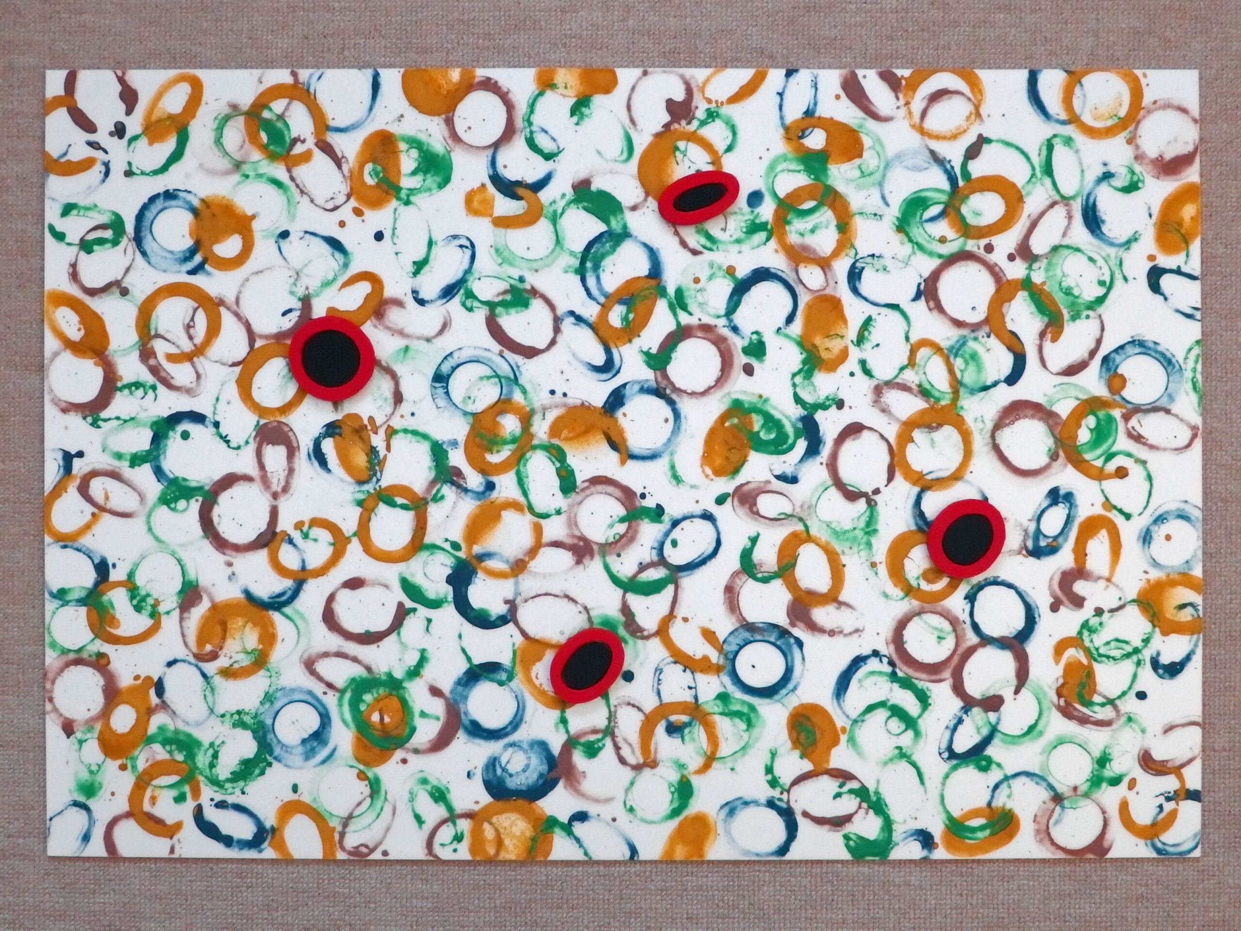 天然素材の和紙に膠を使うのが「日本画」の常識ですが、あえて人工素材を使っています。