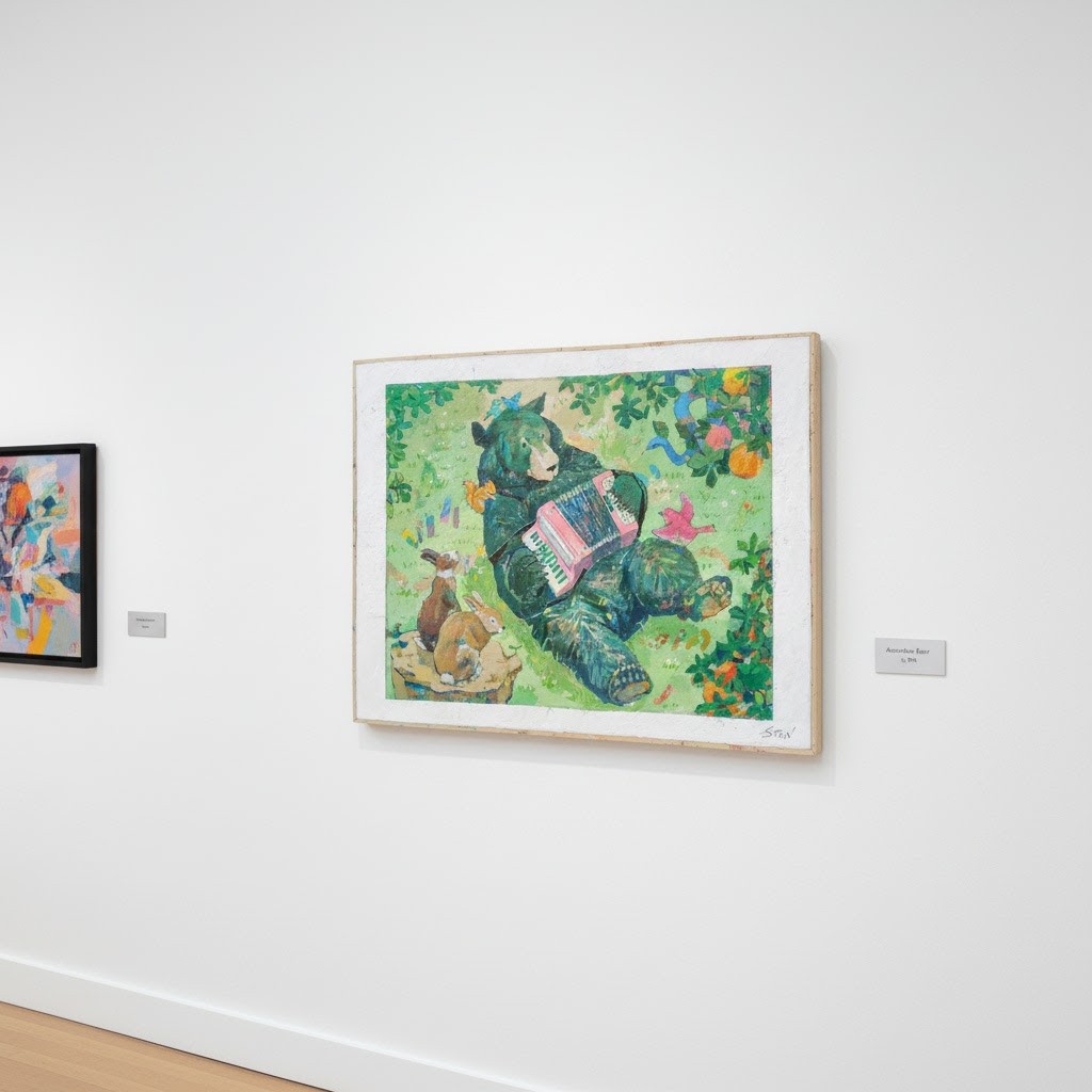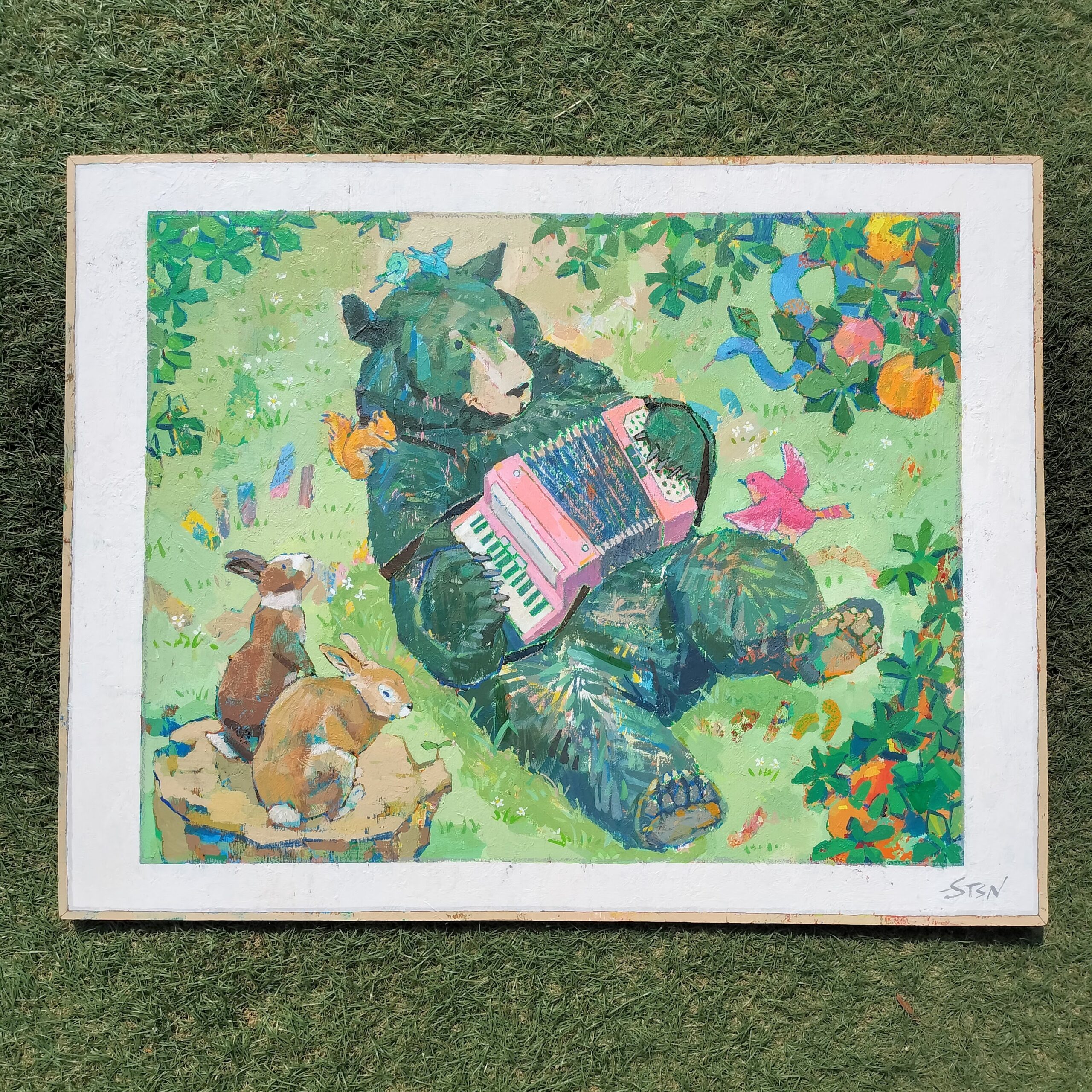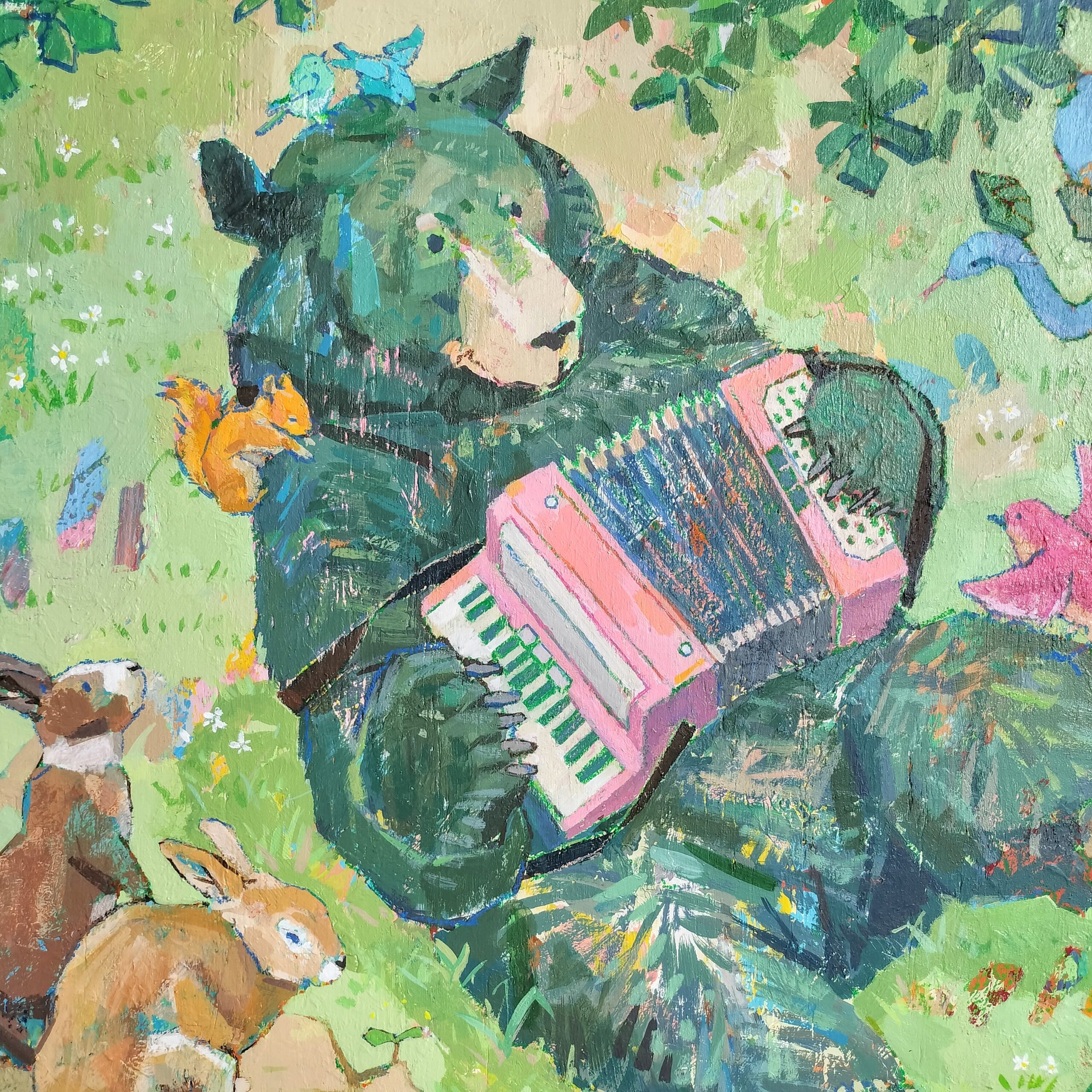 画面の中心では、優しい眼差しをしたクマがアコーディオンを奏で、その心地よい音色に誘われるように、ウサギたちが耳を傾けています。小鳥たちは楽しげに舞い、あたりには実りの木々が彩りを添えています。