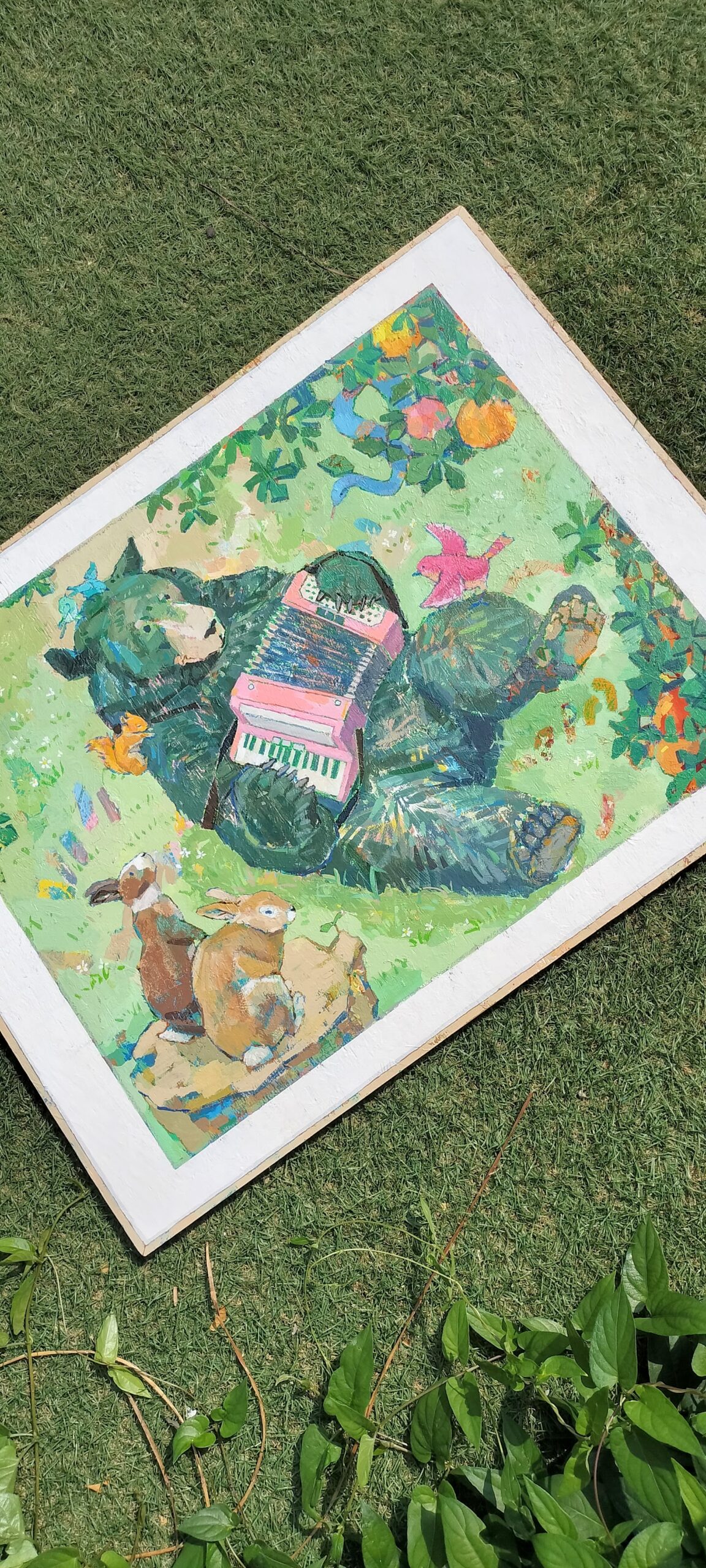 「クマの世界」は、私たちが見過ごしがちな、ささやかながらも確かな幸せ、そして自然の中で共生する生きものたちの飾らない美しさを表現しています。この絵を飾ることで、あなたの日常にも、心温まるハーモニーと穏やかな安らぎが訪れることでしょう。