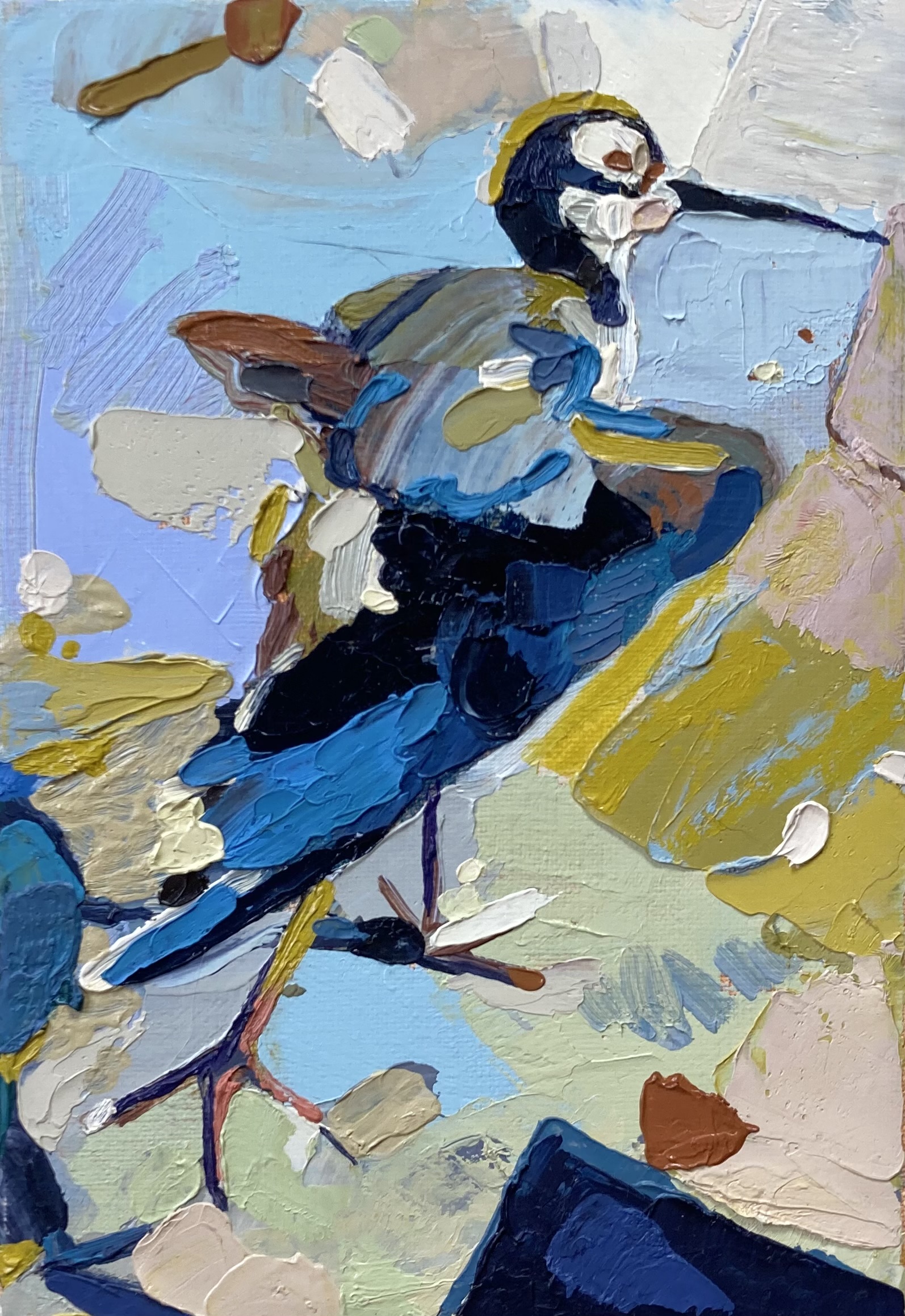 主にパレットナイフと筆を用いて描いており、表面は凹凸がある油絵です。