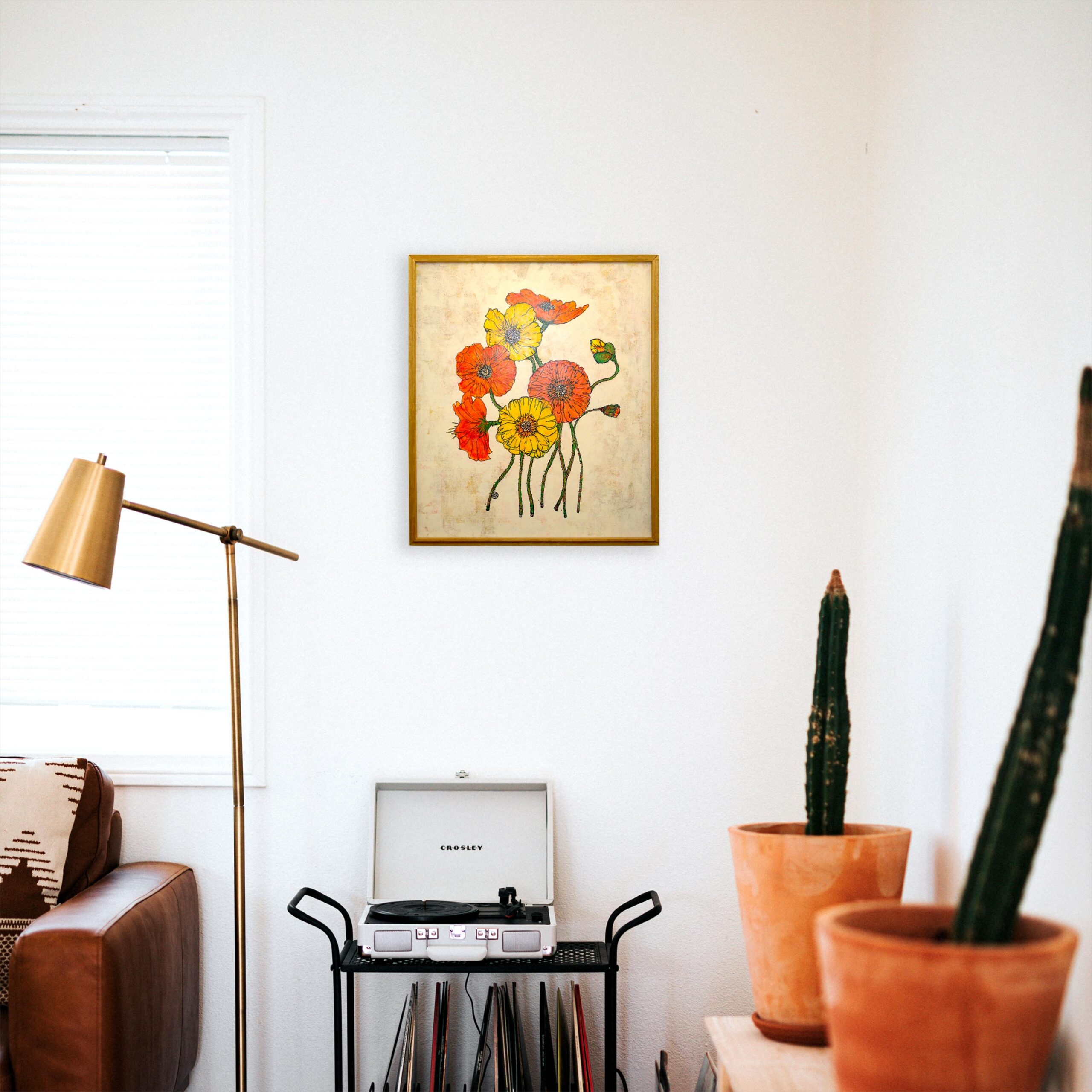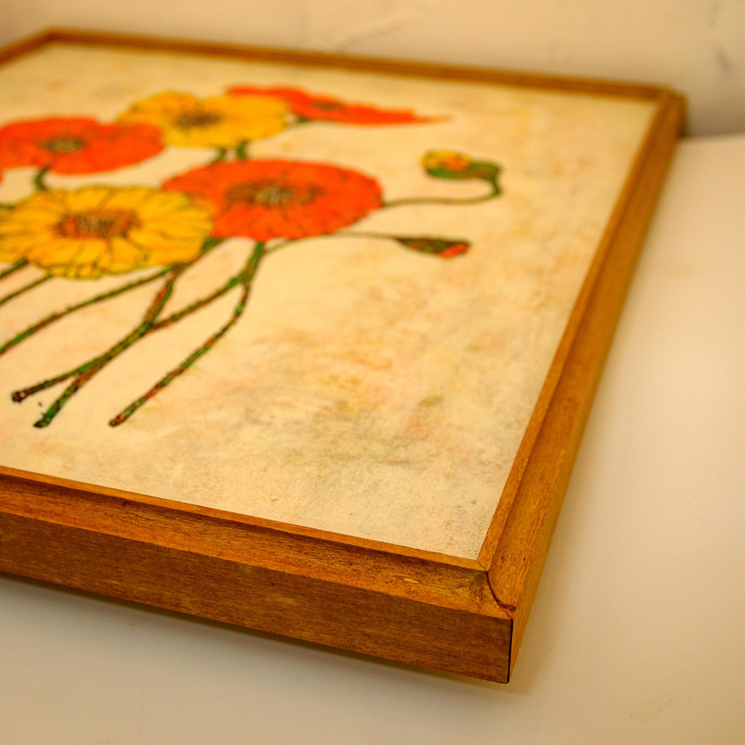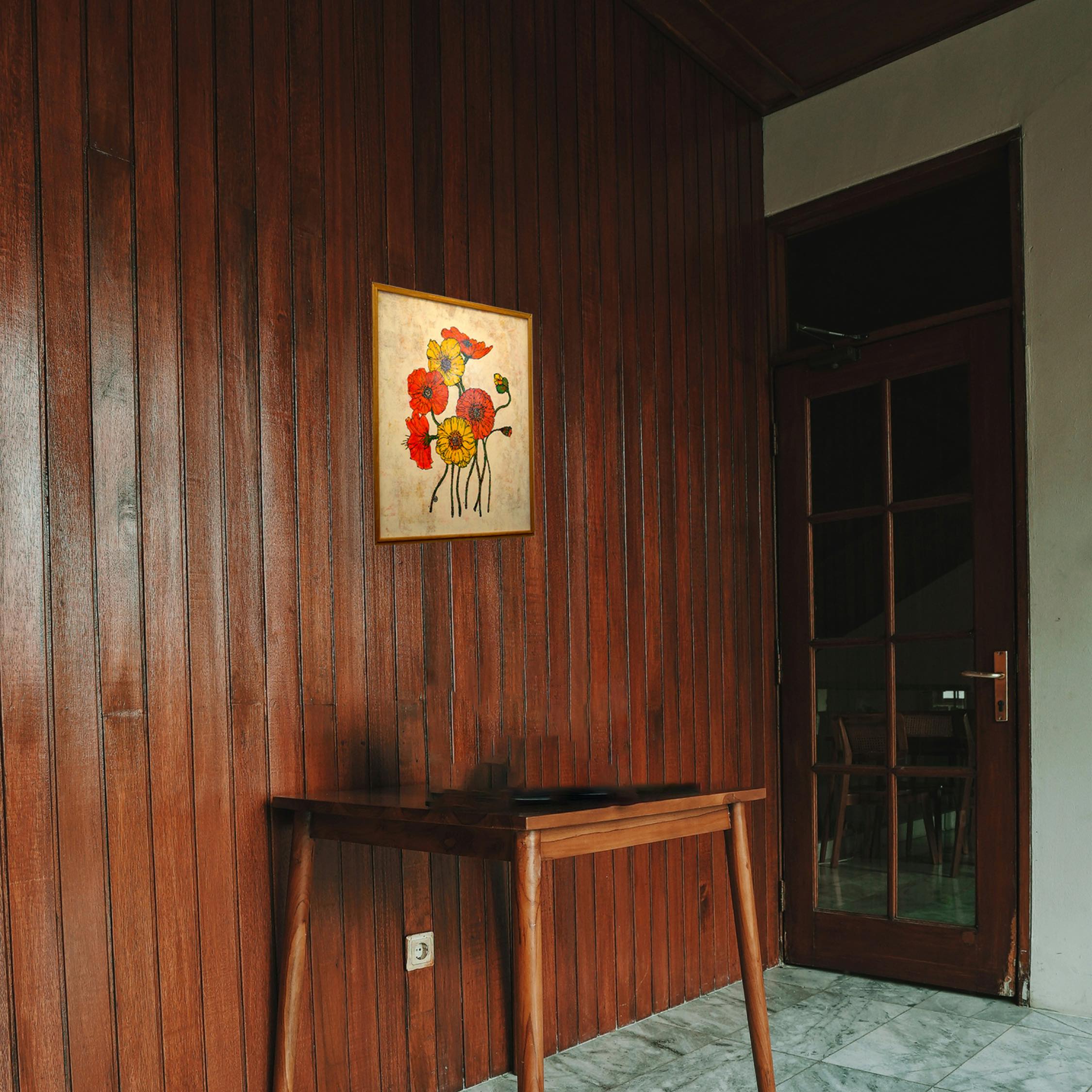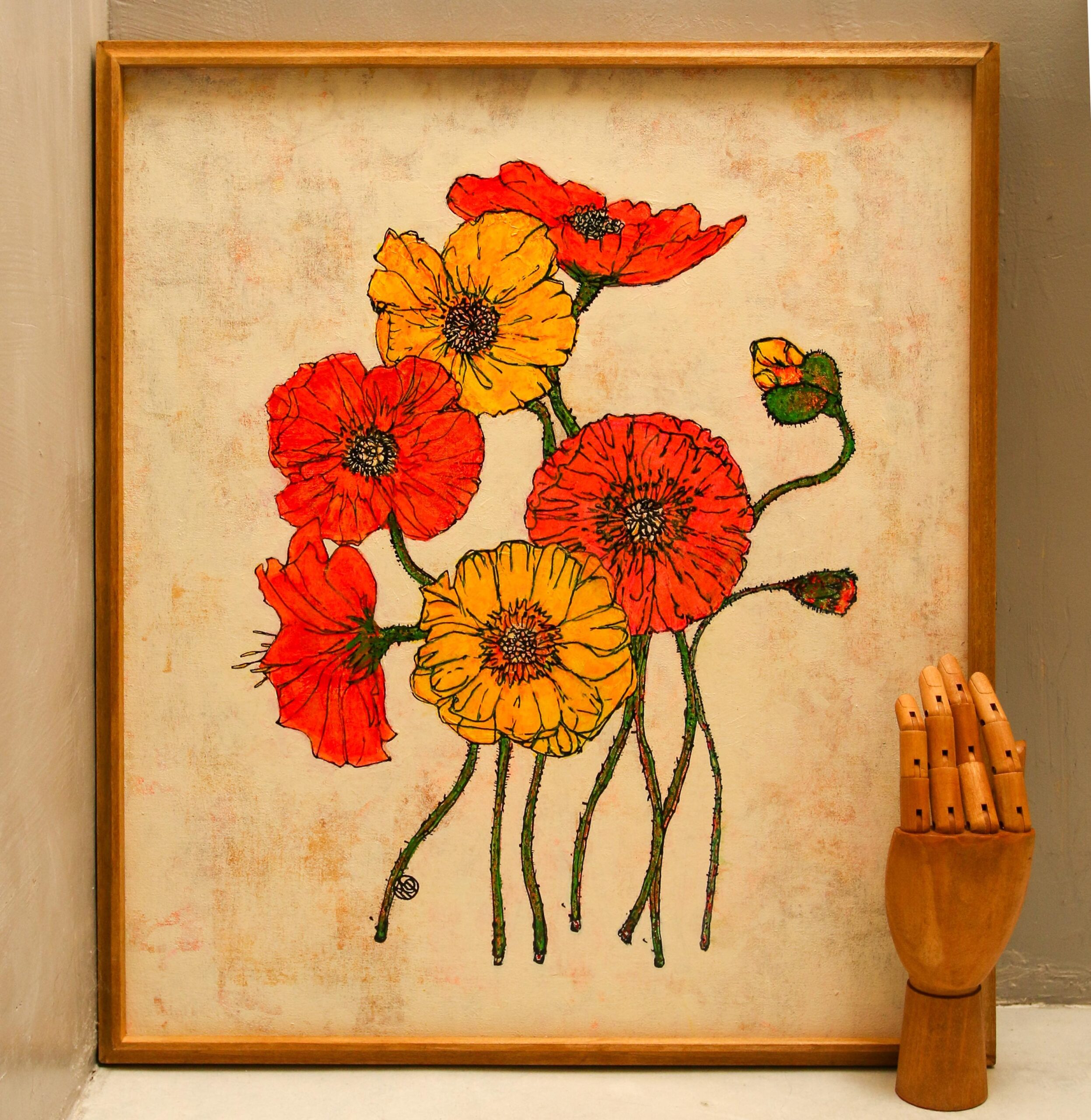 鮮やかな赤と黄のポピーが、まるで風に揺れるように自由に絡み合う。8輪の花はそれぞれが異なるリズムを持ちつつ、ひとつの調和を奏でている。生命力、記憶、そして再生の象徴として描かれたポピーは、静かな背景の中で力強く咲き誇る。