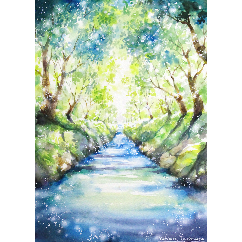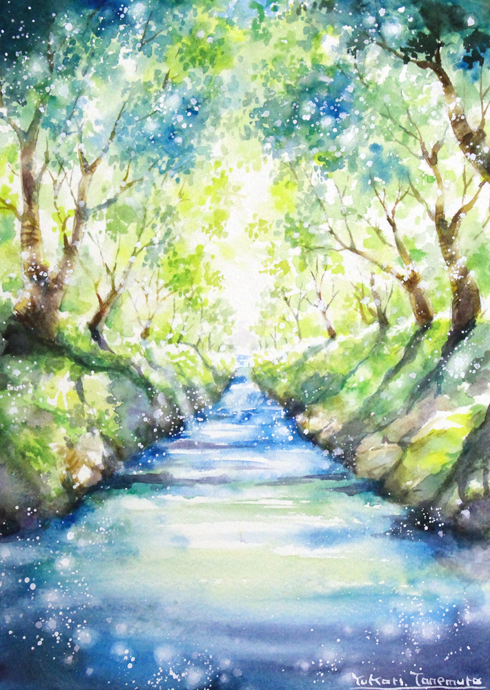 光が射しこむ、明るい緑の風景を水彩で表現しました。