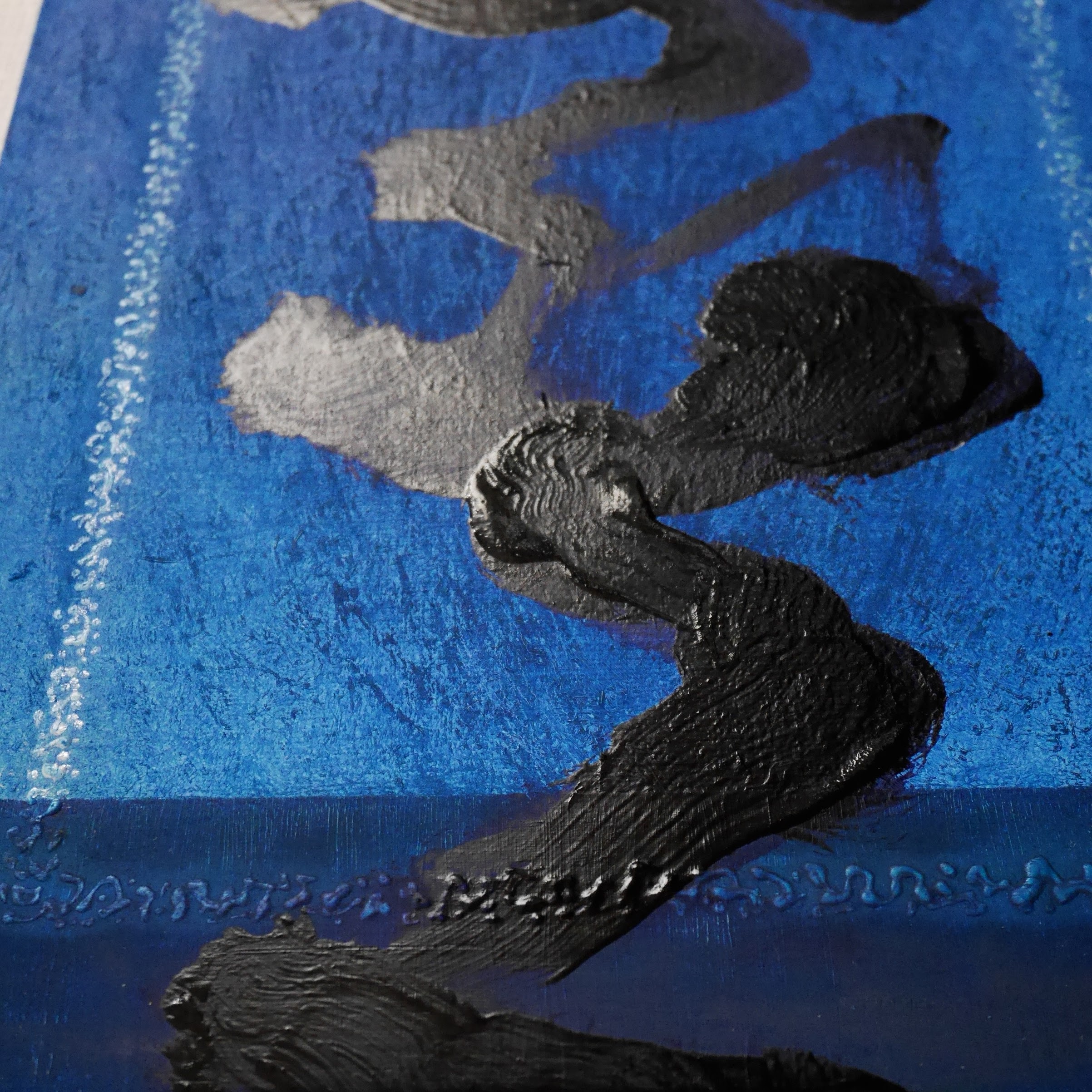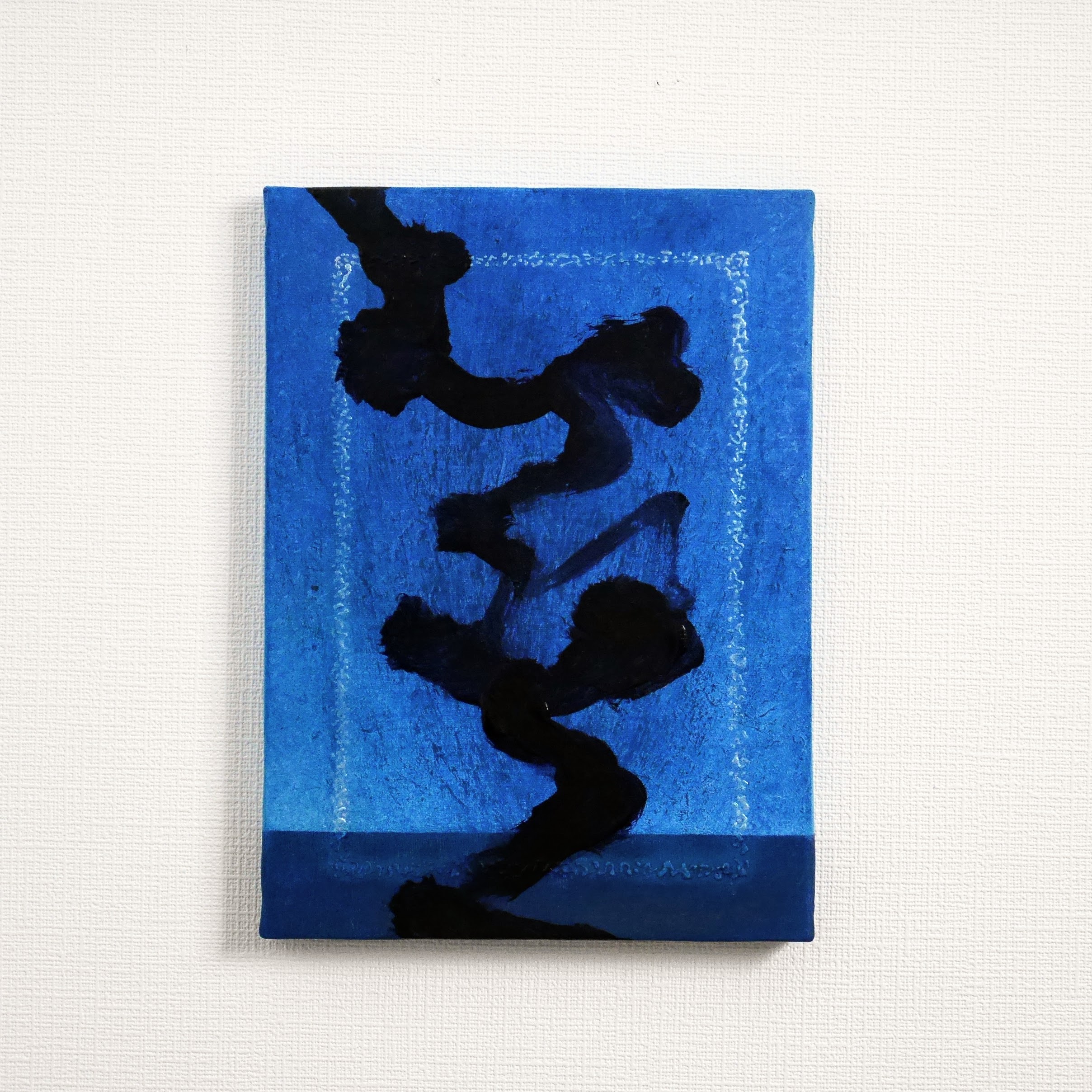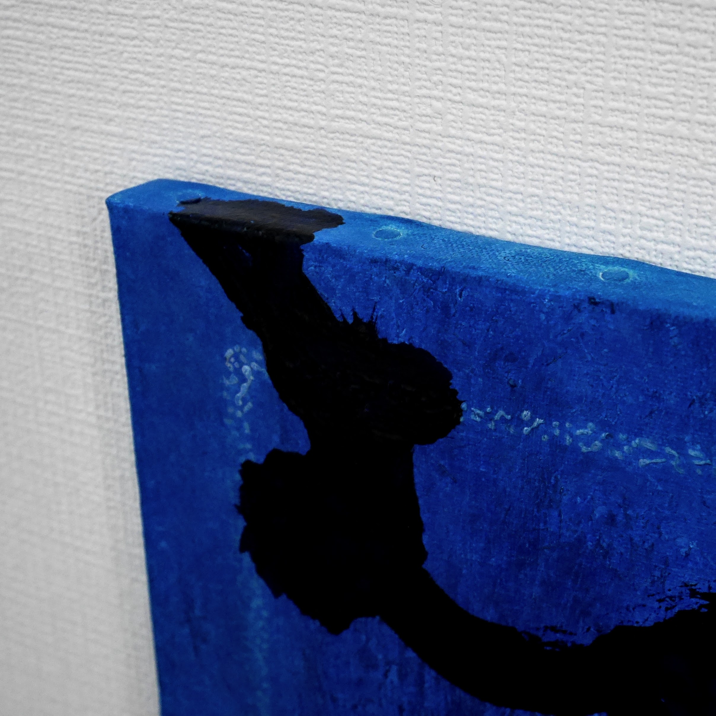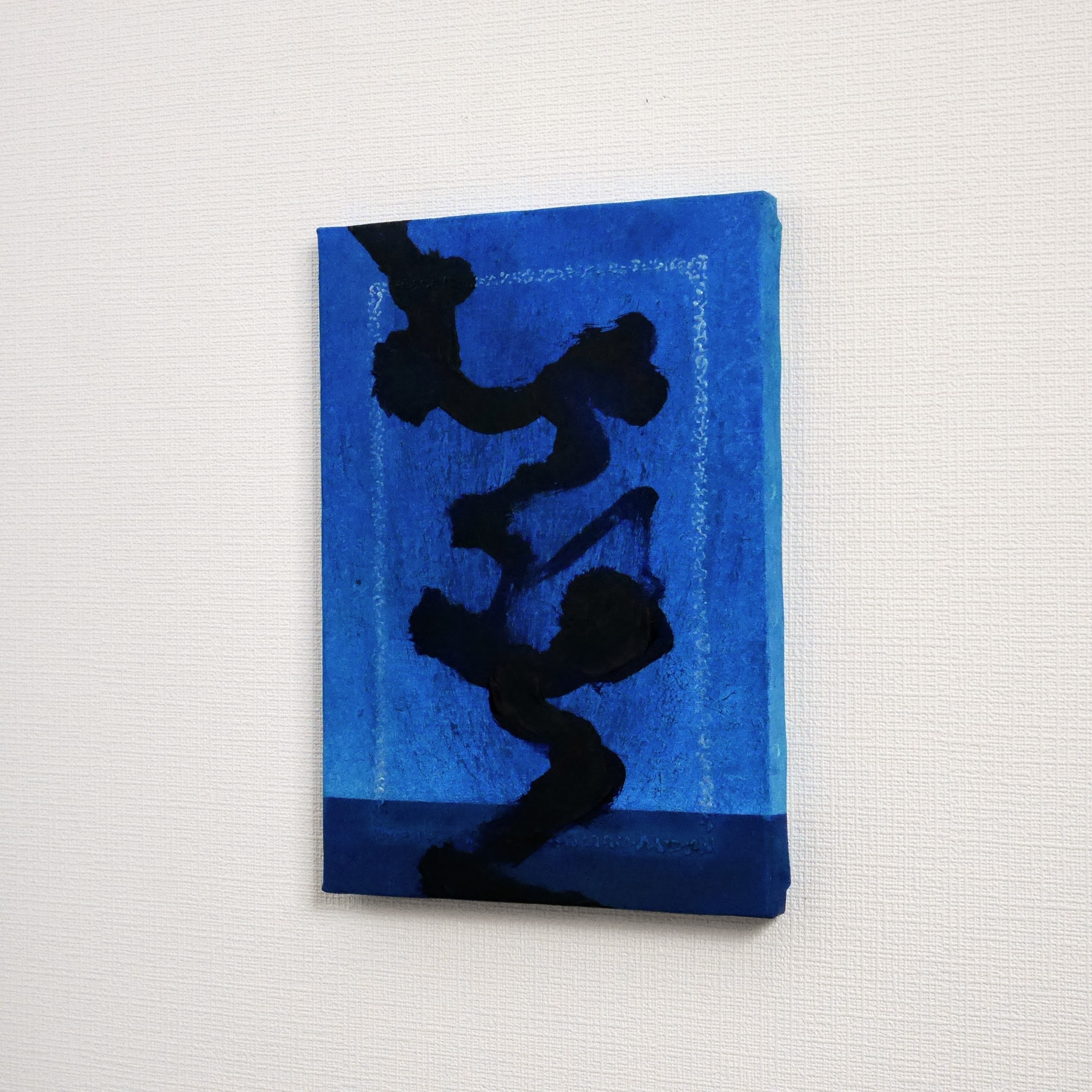 2色の青色の背景に、濃藍色で「書」のような荒い筆使いタッチで描かれた抽象作品です。