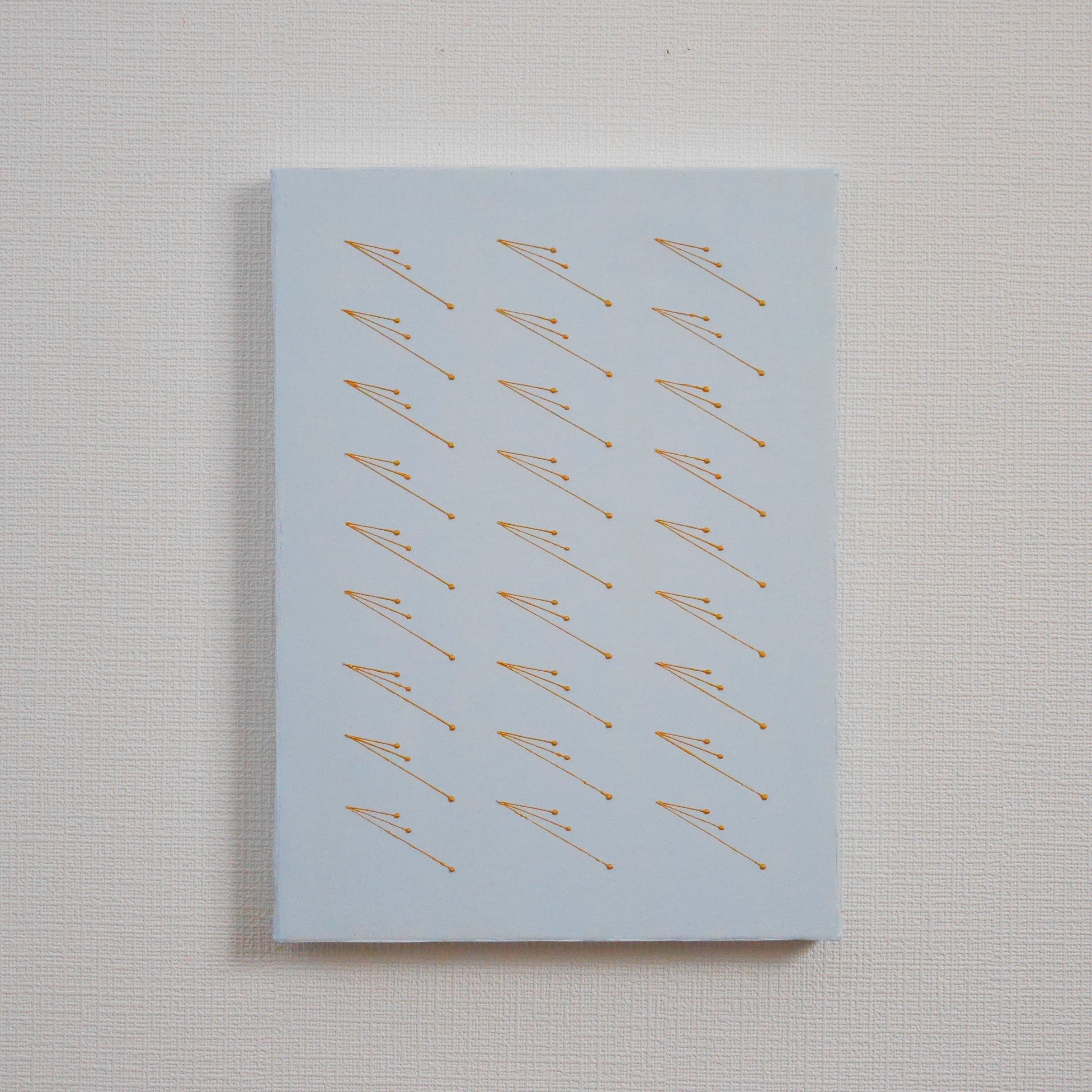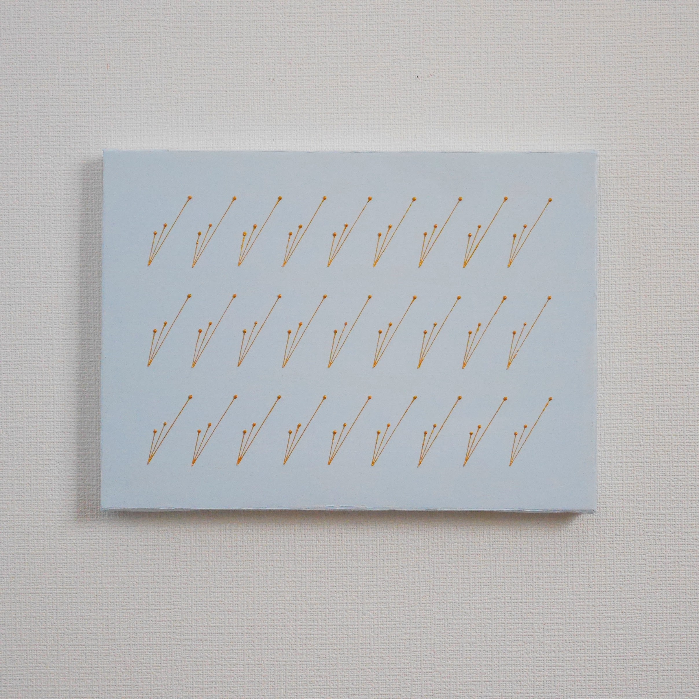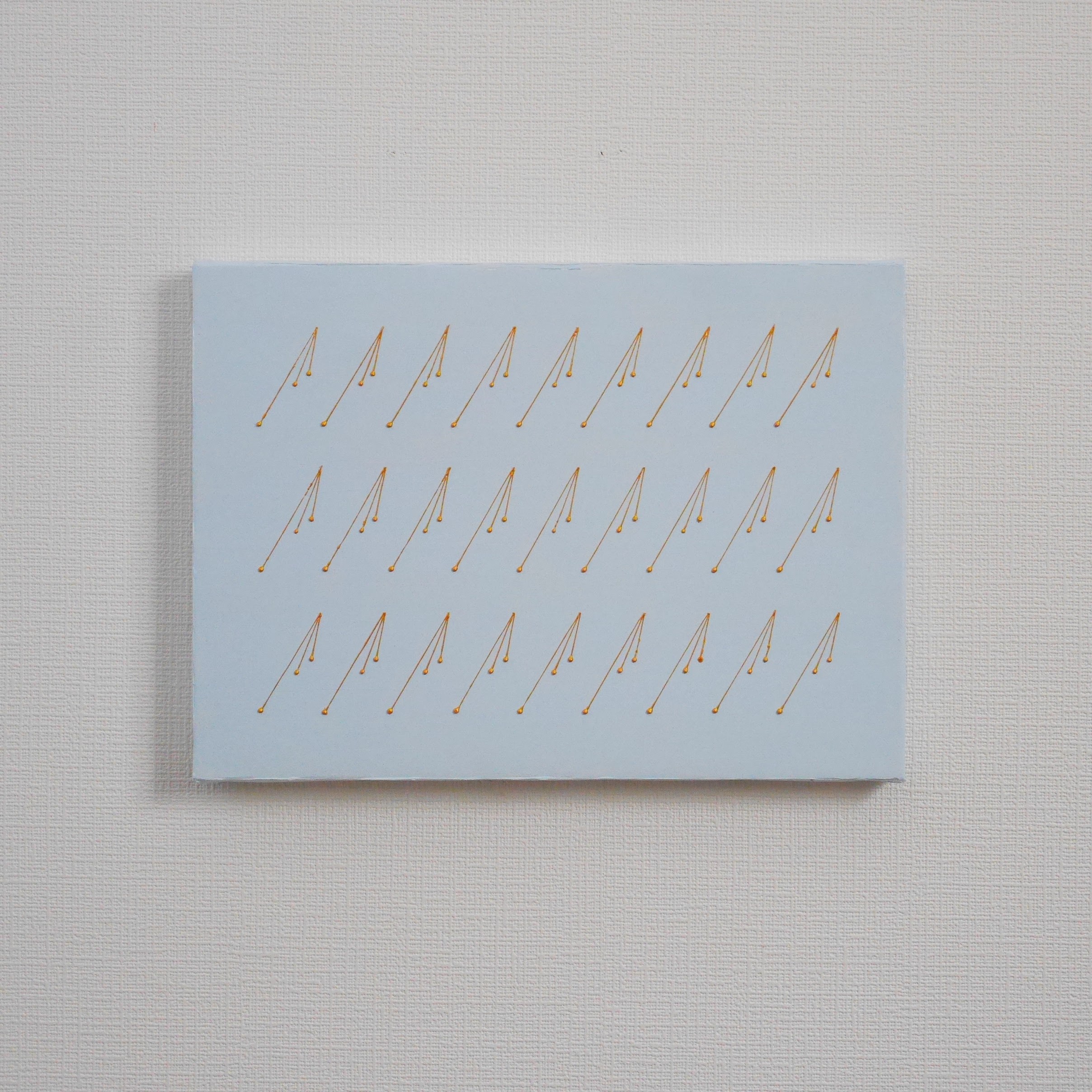 淡い水色の背景に金色の線で描かれた図形が整列されたコンポジション作品です。