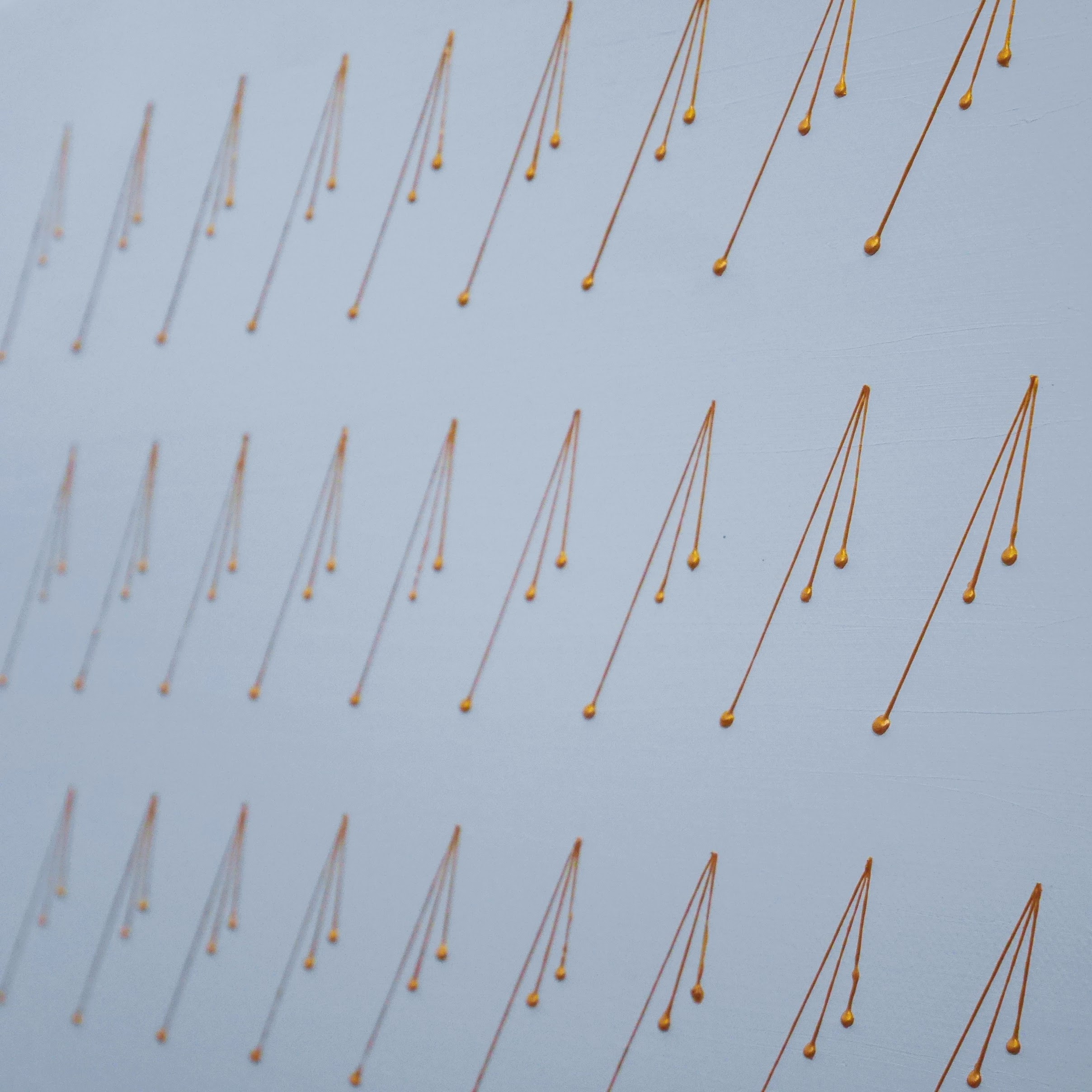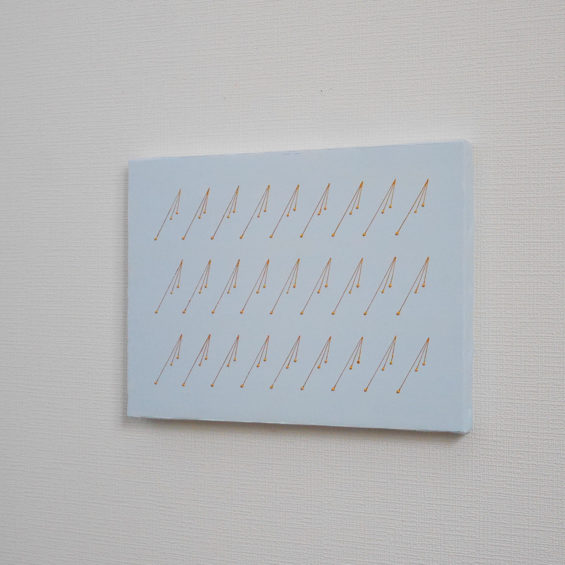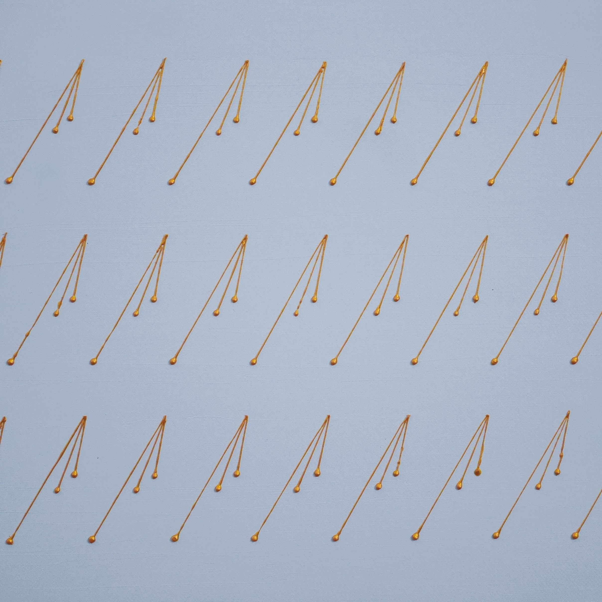 淡い水色の背景に金色の線で描かれた図形が整列されたコンポジション作品です。