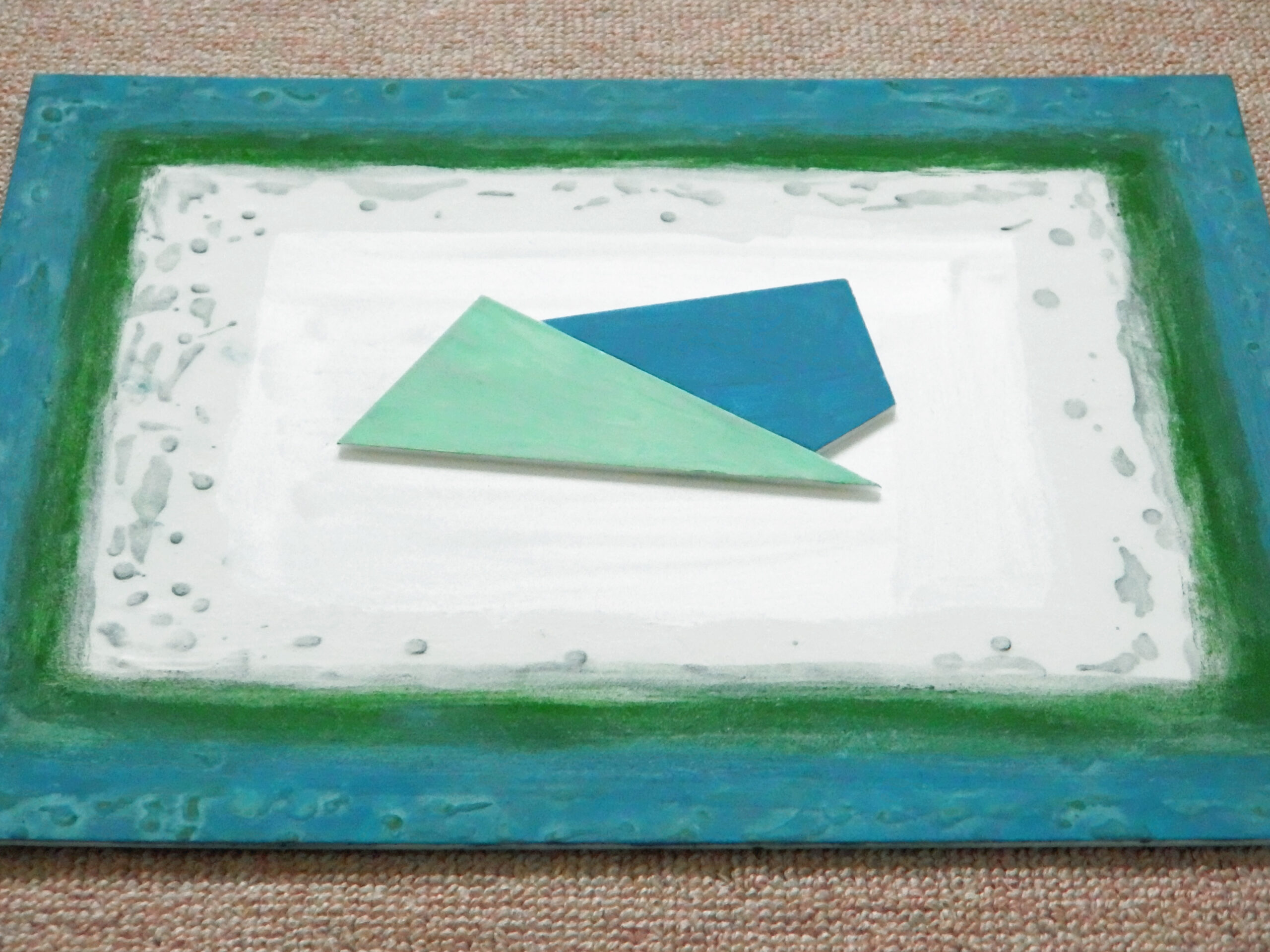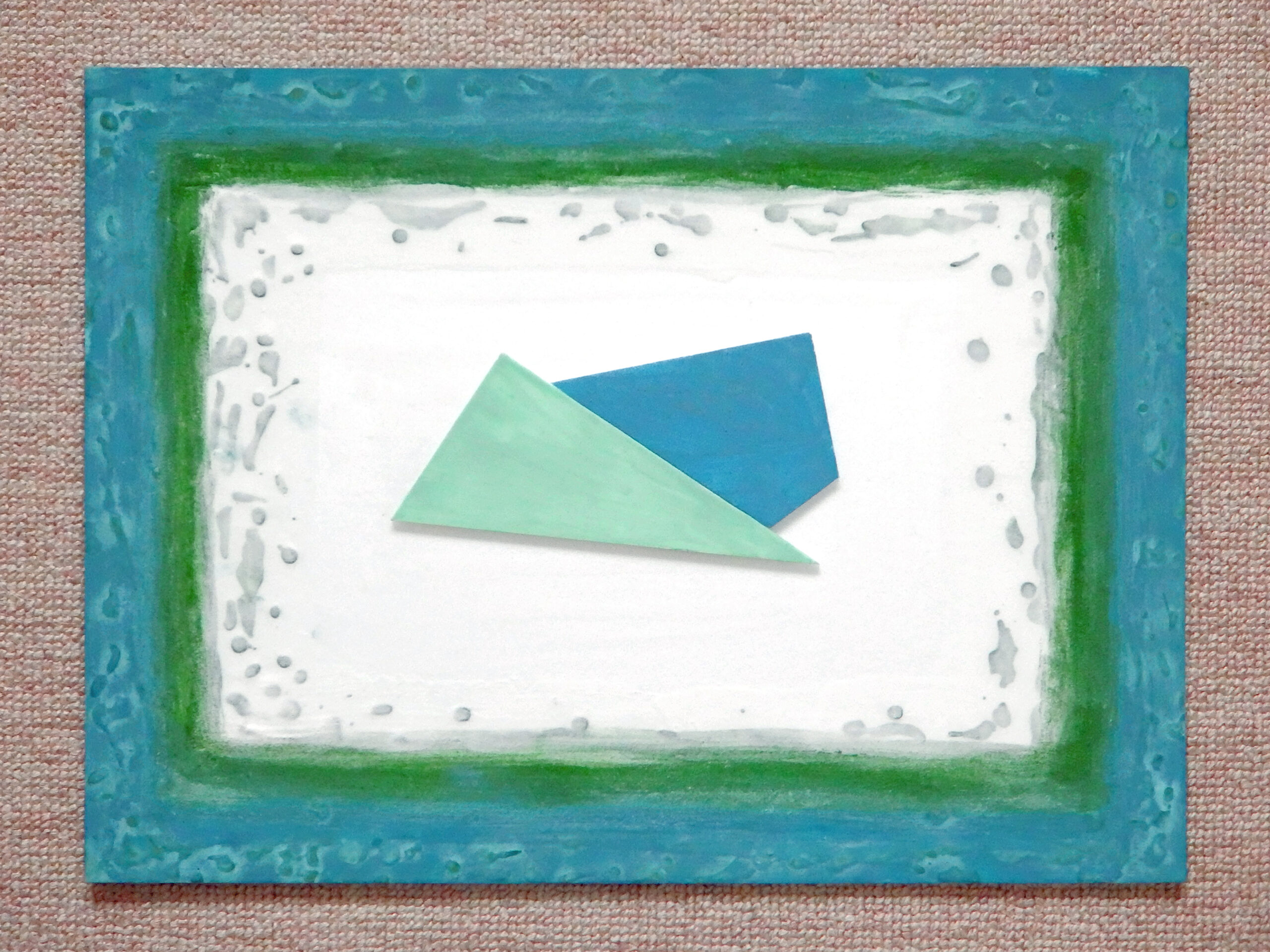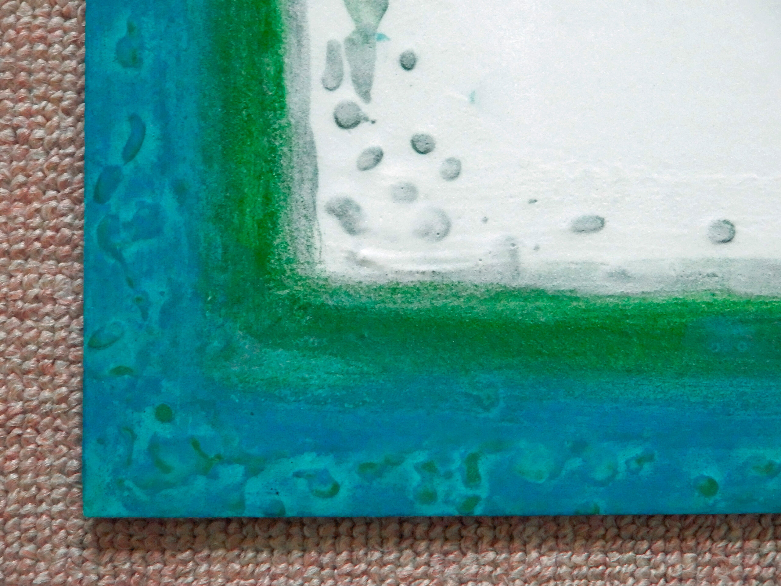 天然素材の和紙に膠を使うのが「日本画」の常識ですが、あえて人工素材を使っています。