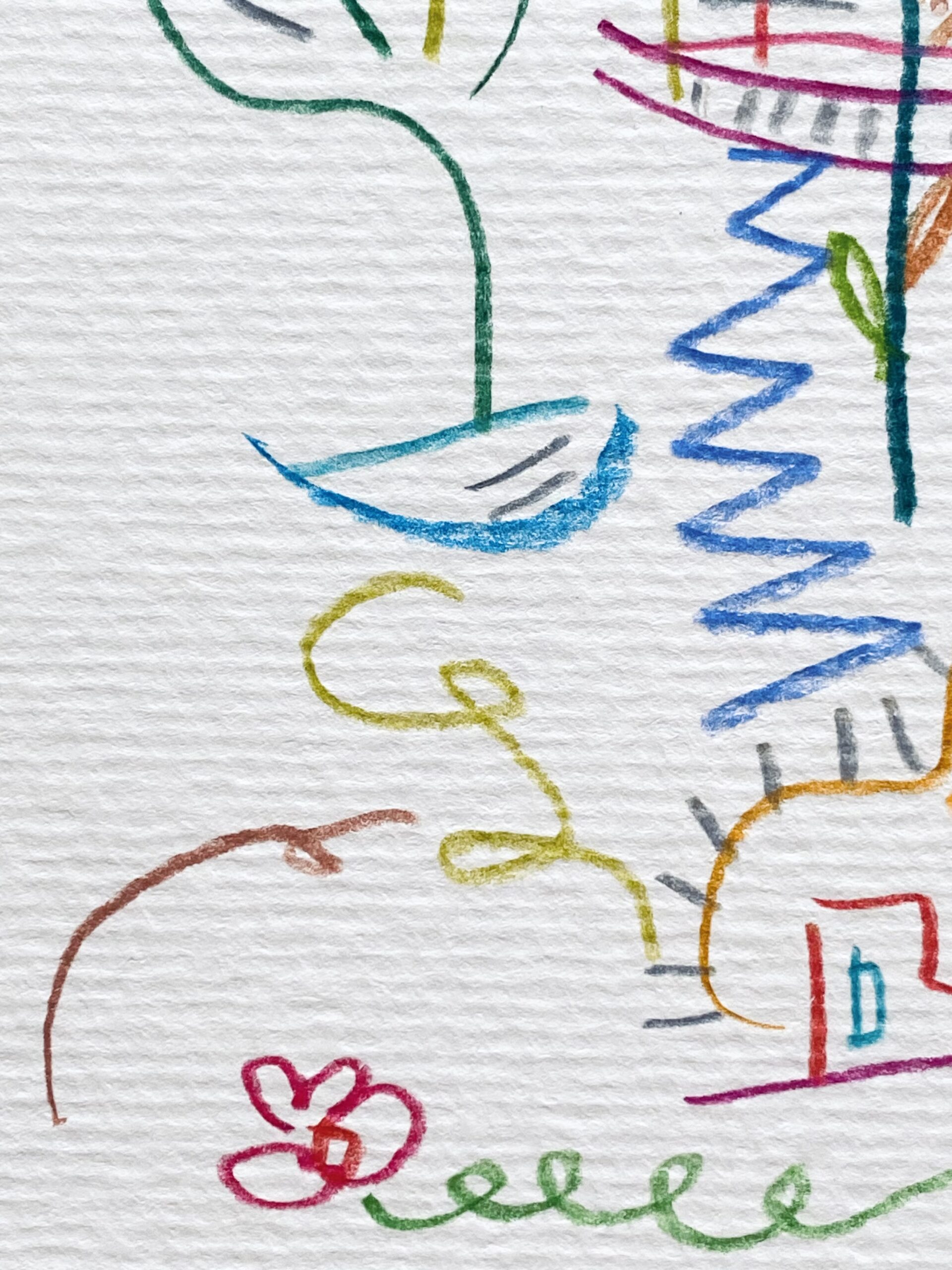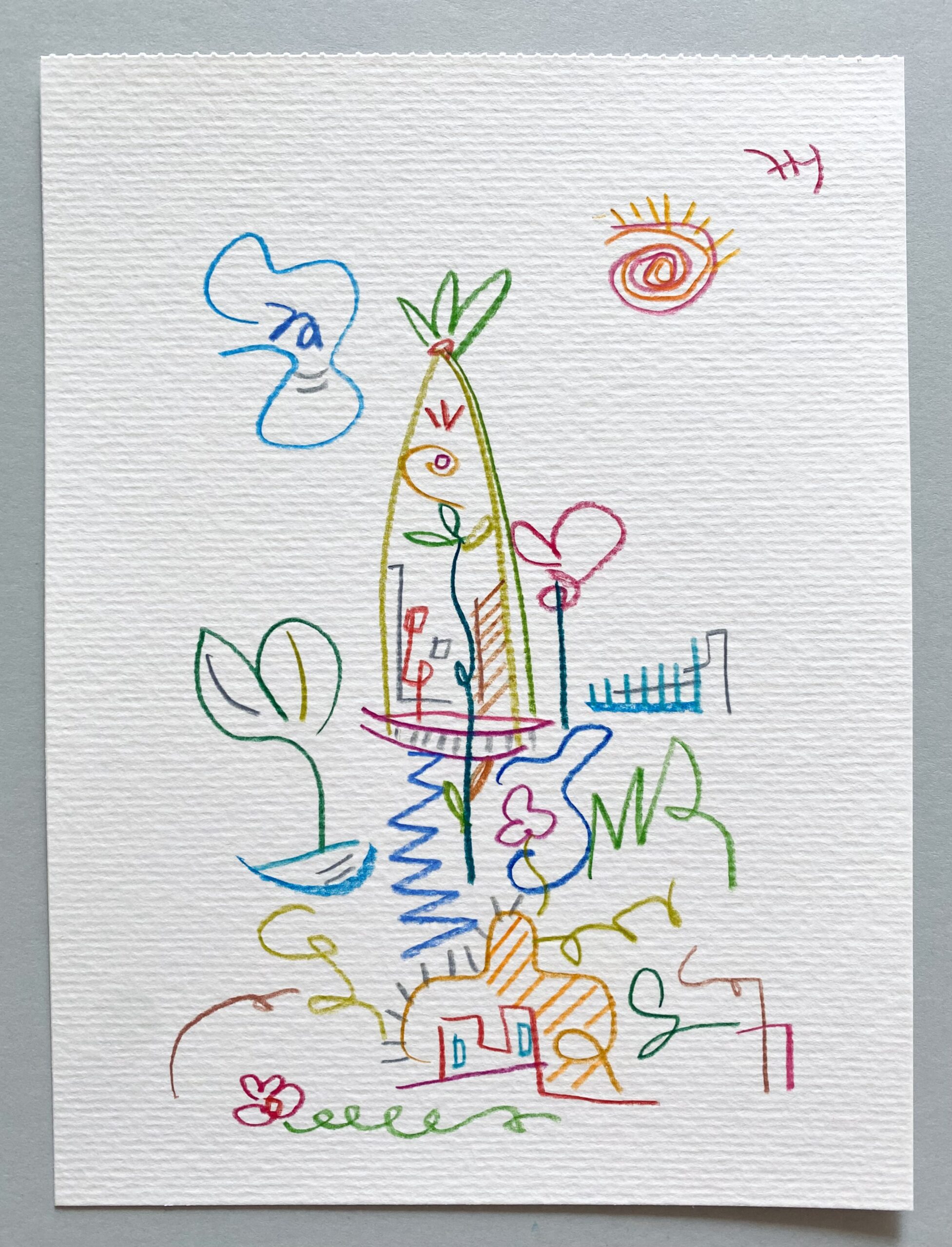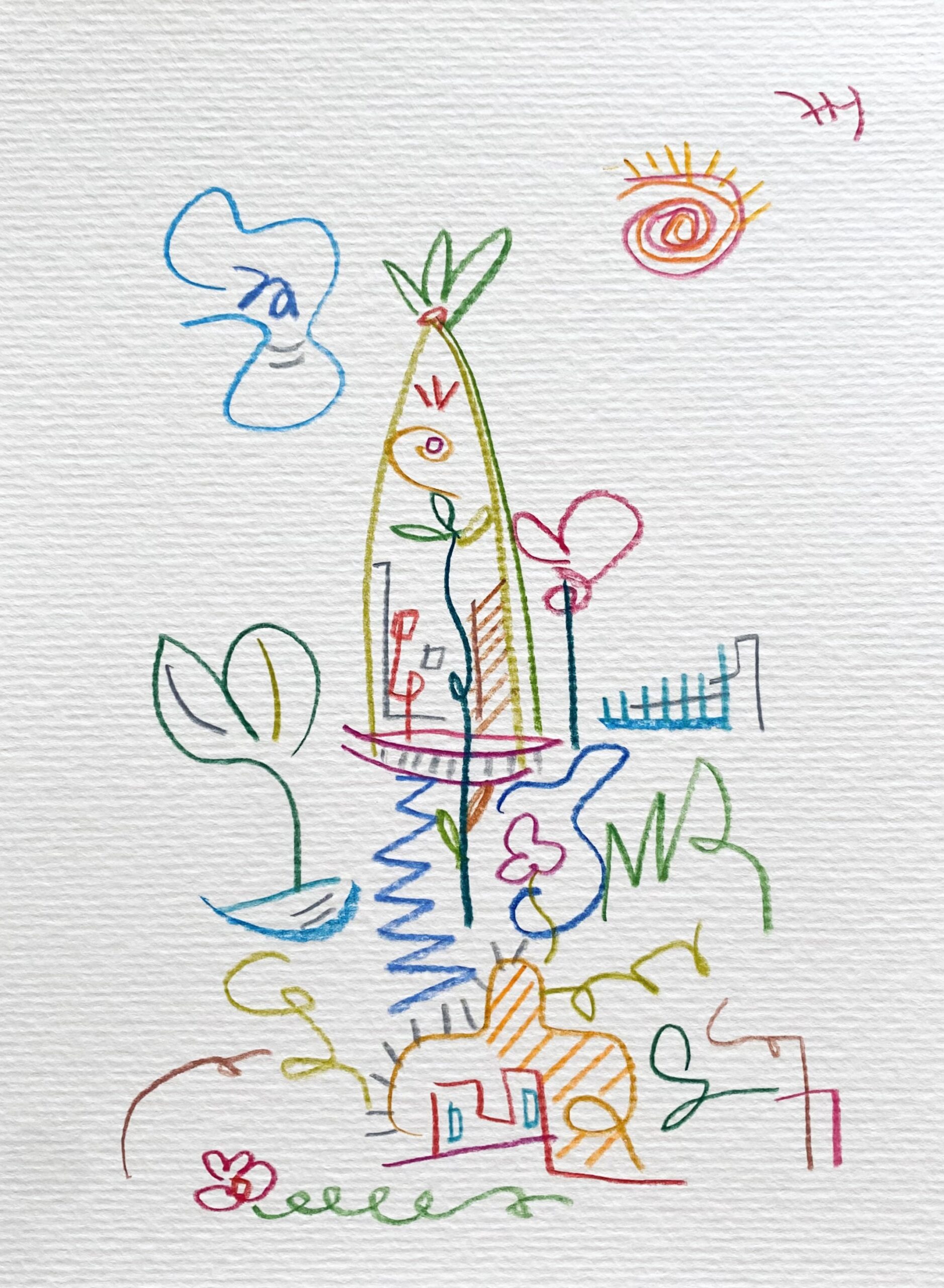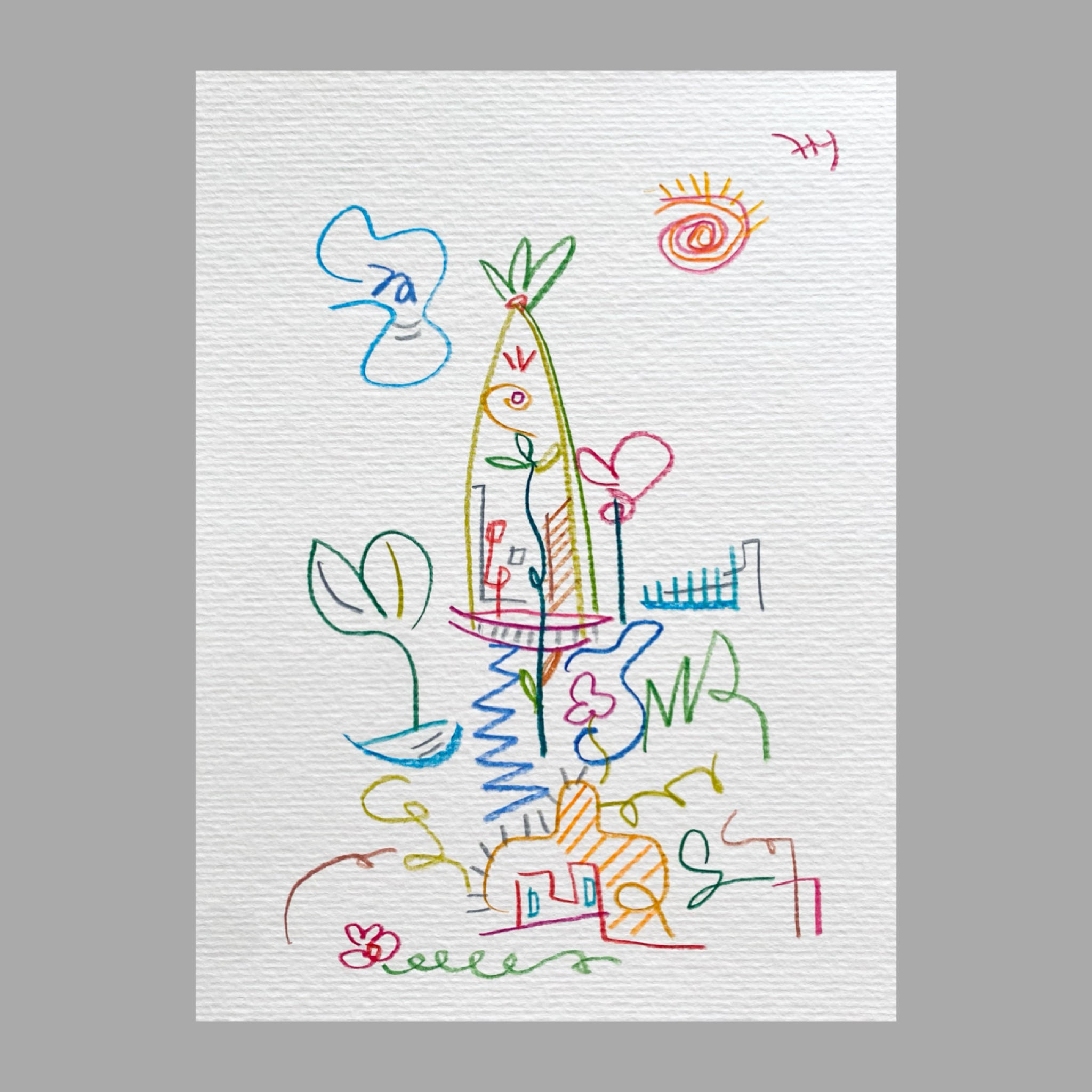 2008年 浮かんだイメージを付箋にボールペンでスケッチ。2012年になりそれをまとめたものを知人に見せたところサイズや画材をかえて絵画として発表することを勧められ、2013年、公募展にA4サイズのカードボードにペン・パステルで描いた作品を出品。その後アクリル絵具での創作をスタート。