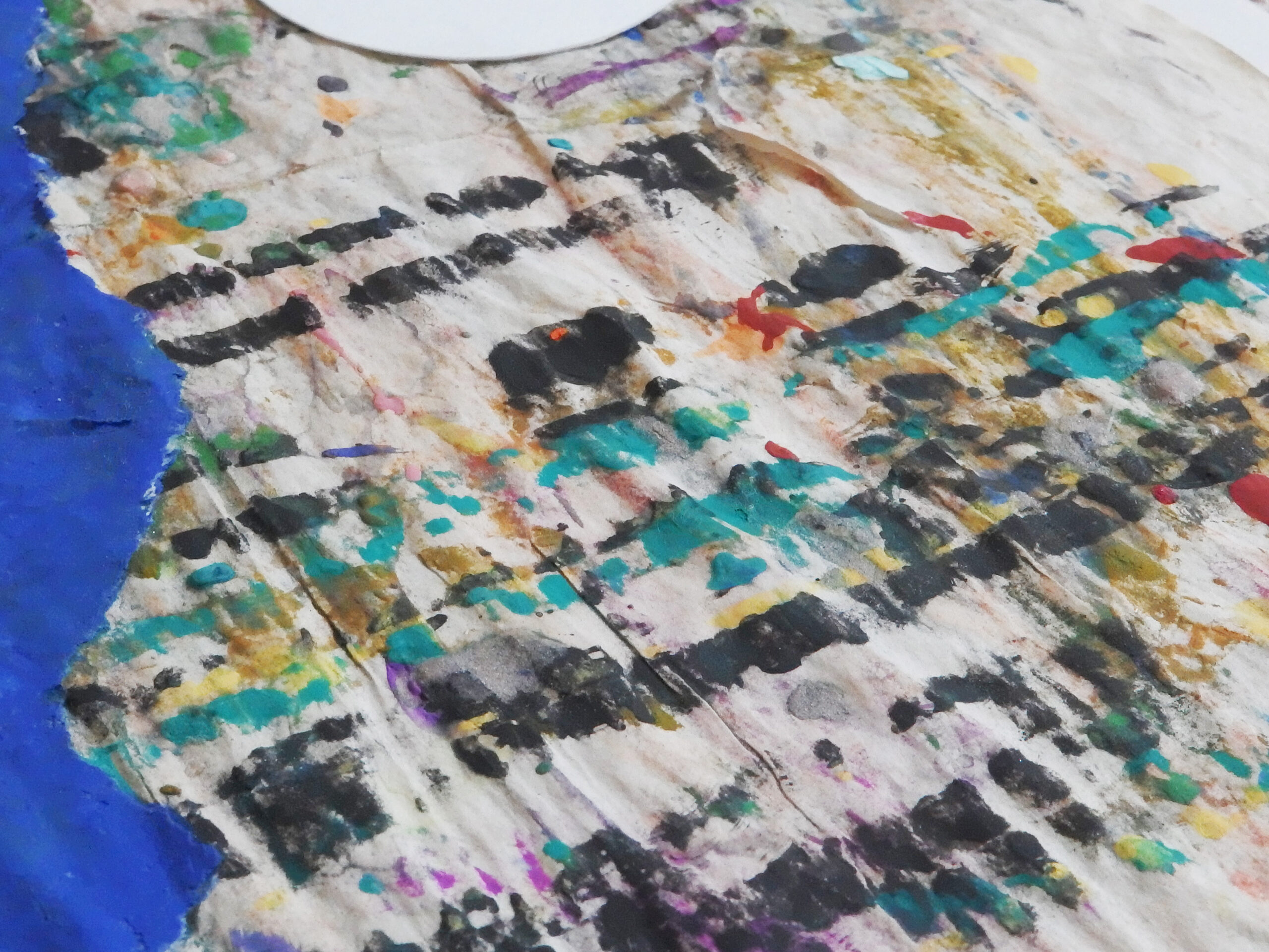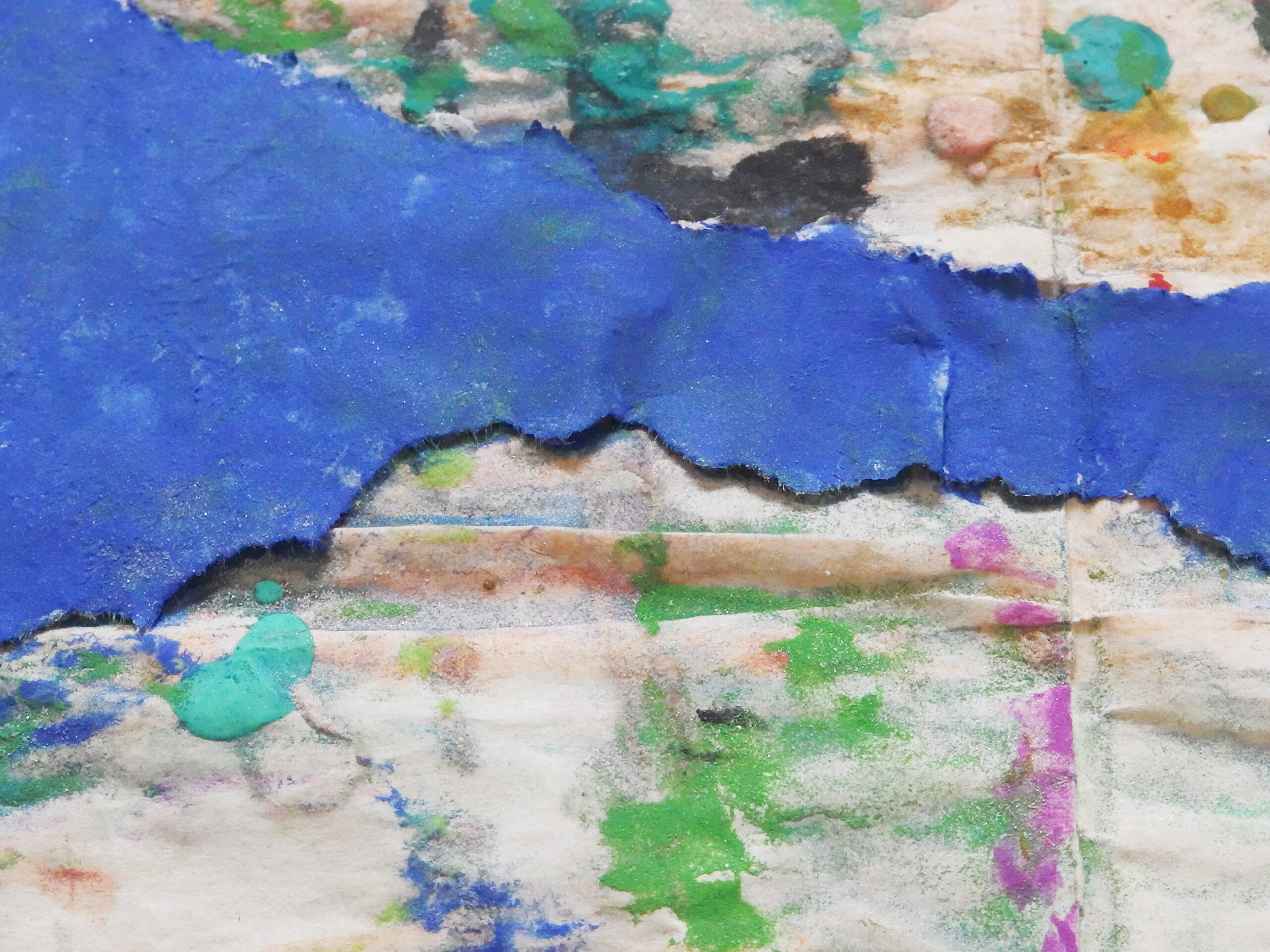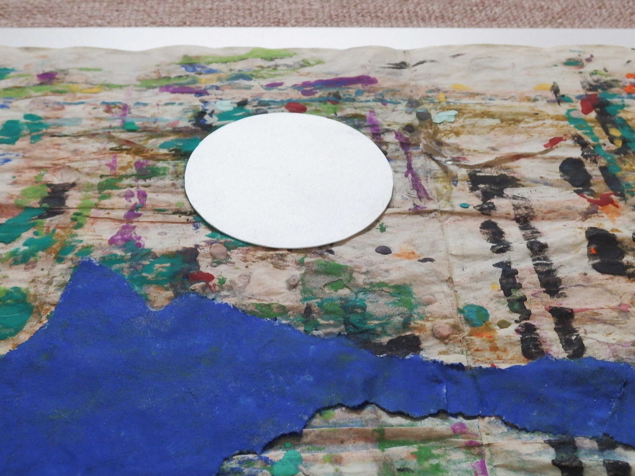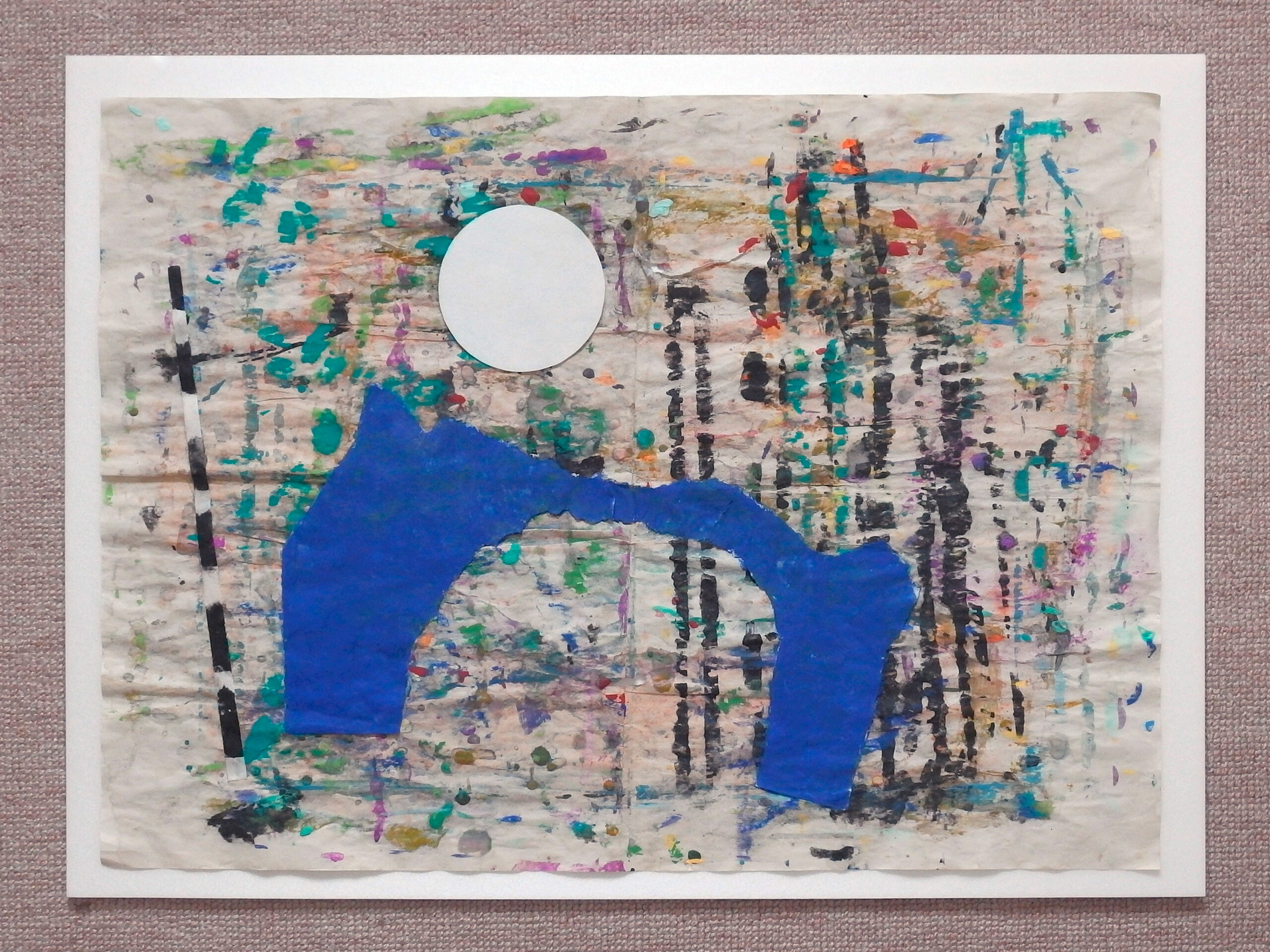 天然素材の和紙に膠を使うのが「日本画」の常識ですが、あえて人工素材を使っています。