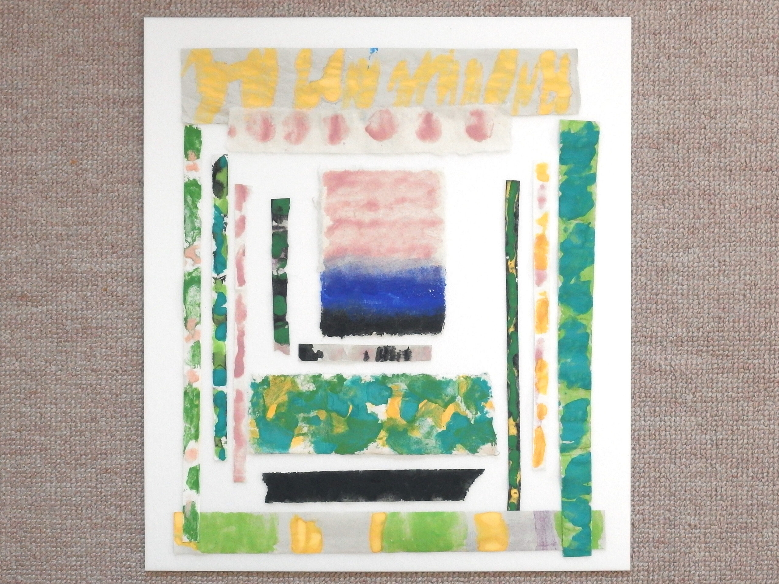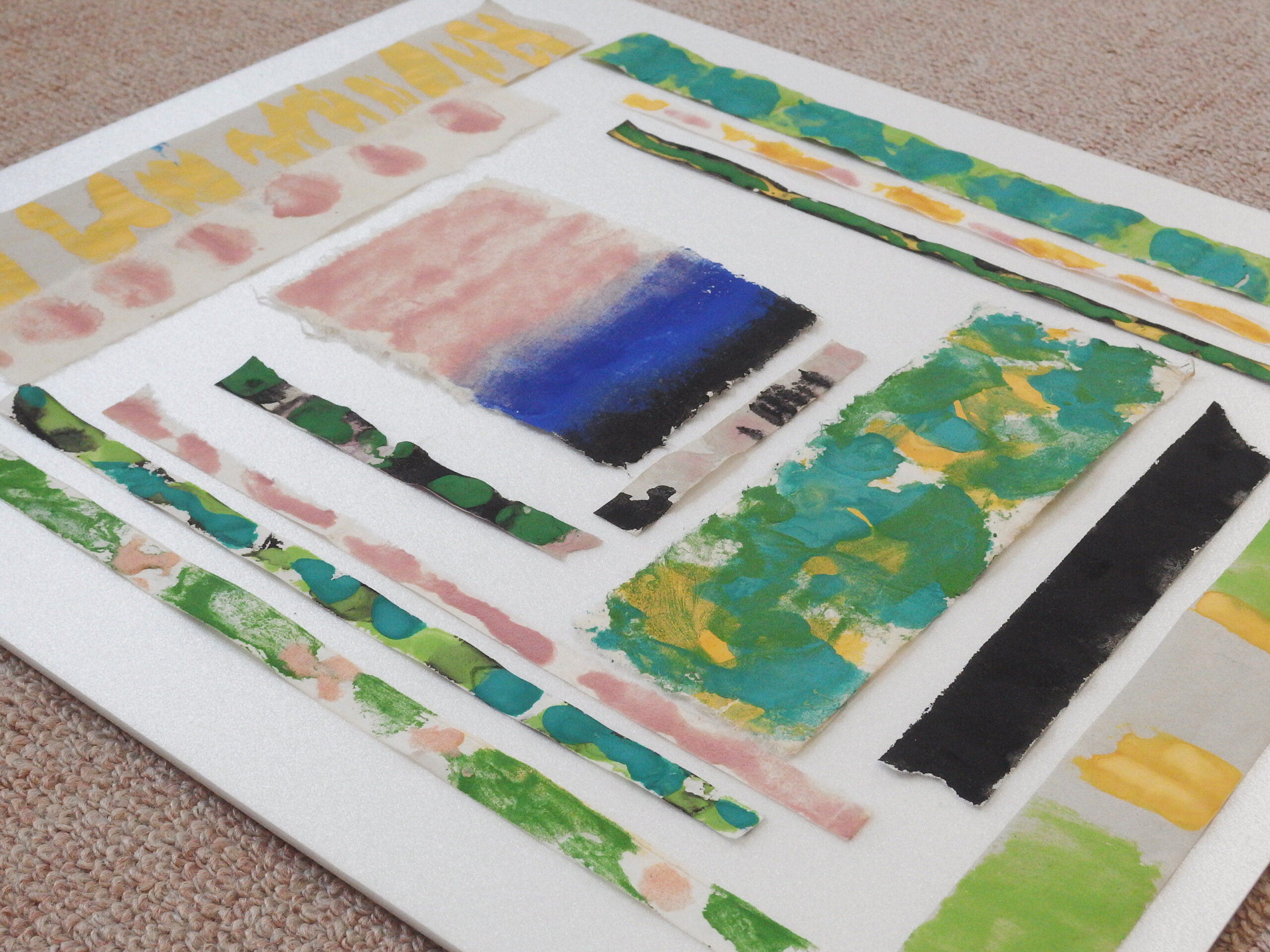 天然素材の和紙に膠を使うのが「日本画」の常識ですが、あえて人工素材を使っています。