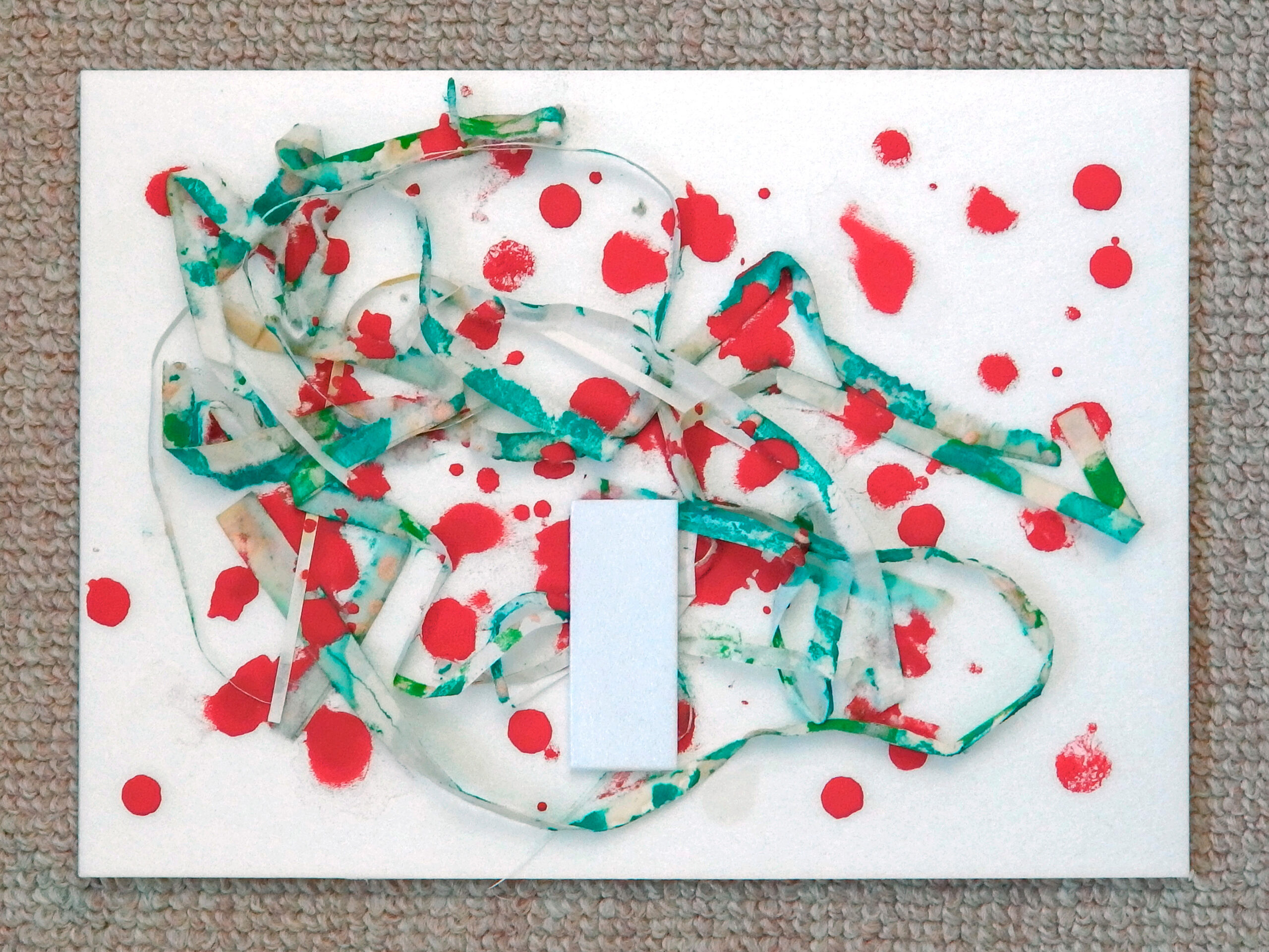 天然素材の和紙に膠を使うのが「日本画」の常識ですが、あえて人工素材を使っています。